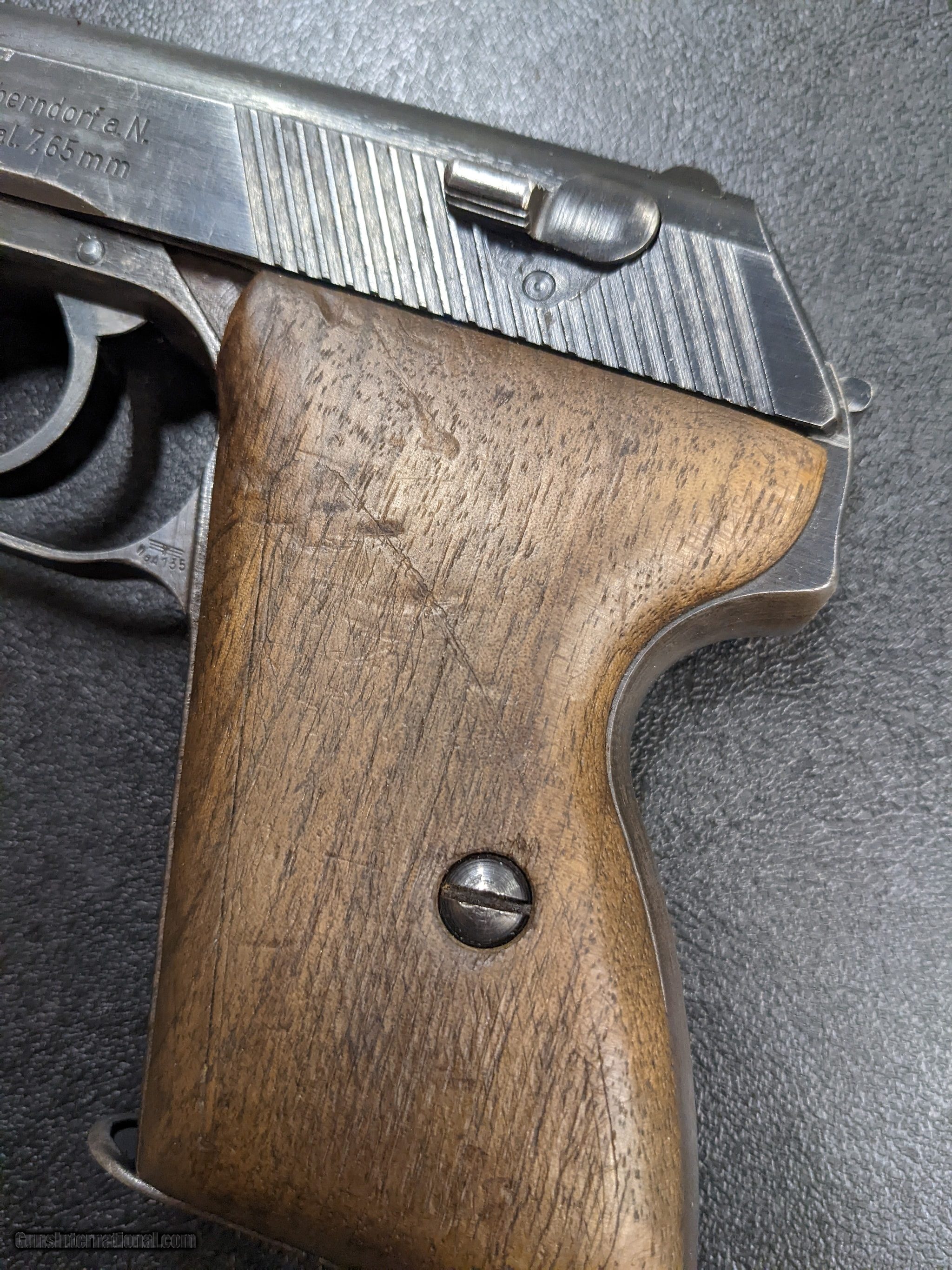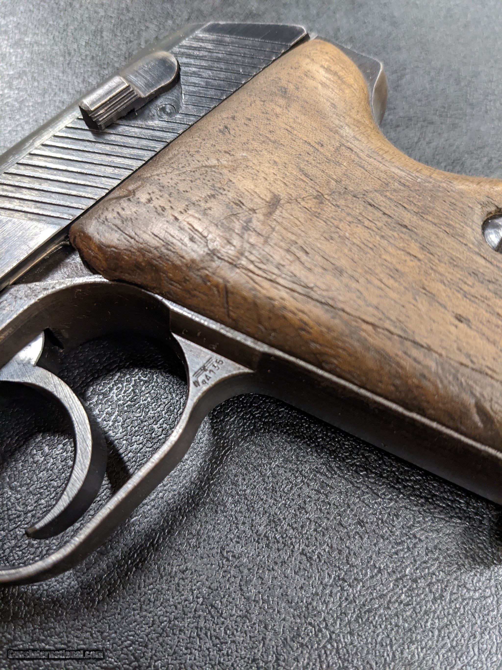 Description: Guns Listing ID: 527374 UPDATE: 3.4\" BARRELL Excellent Mauser HSC 7.65 mm- Late war time production The gun is all matching . \"Eagle proof on the right side of the trigger guard and front on the slide. The gun has retained about 96-98% of its original finish. While there is very little actual finish loss, there is some light spotty discoloration on the right side of the slide. Very minor wear around the muzzle and very minor thinning on the grip straps. Comes with very nice period-correct wood grips (a few minor scratches and bruises) and one period-correct magazine. Minty bore.One magazine included. Late War Production: Aug. 1943 - Apr. 1945 (SN 852246 - 951939) SOLD Curio/Relic: Yes Manufacturer: MAUSER Model: HSC Caliber Info: .32 ACP Condition: Used - Non-Certified Barrels: 3.4 BARREL Finish: BLUED |