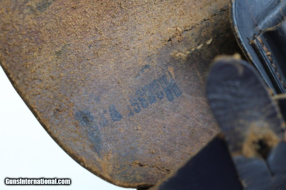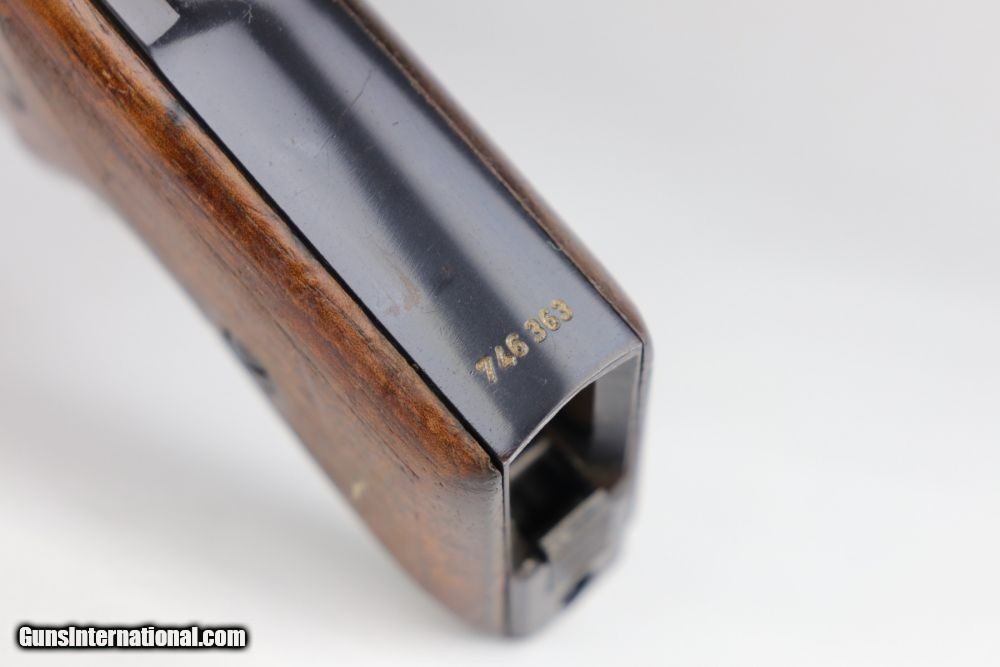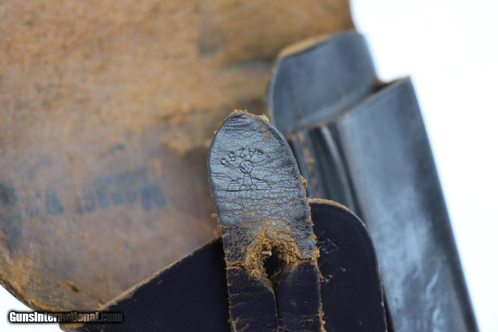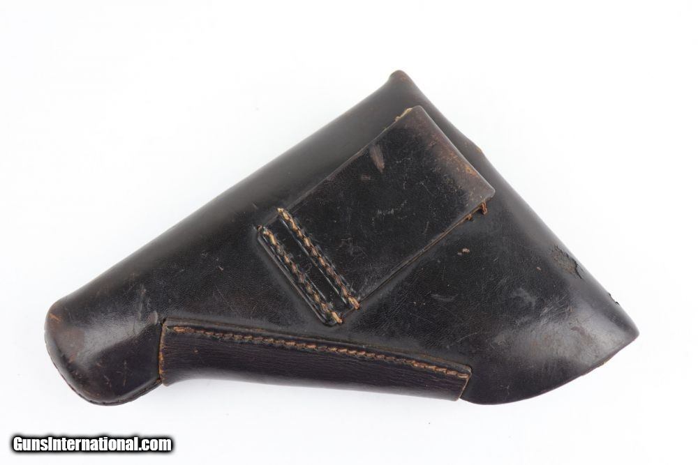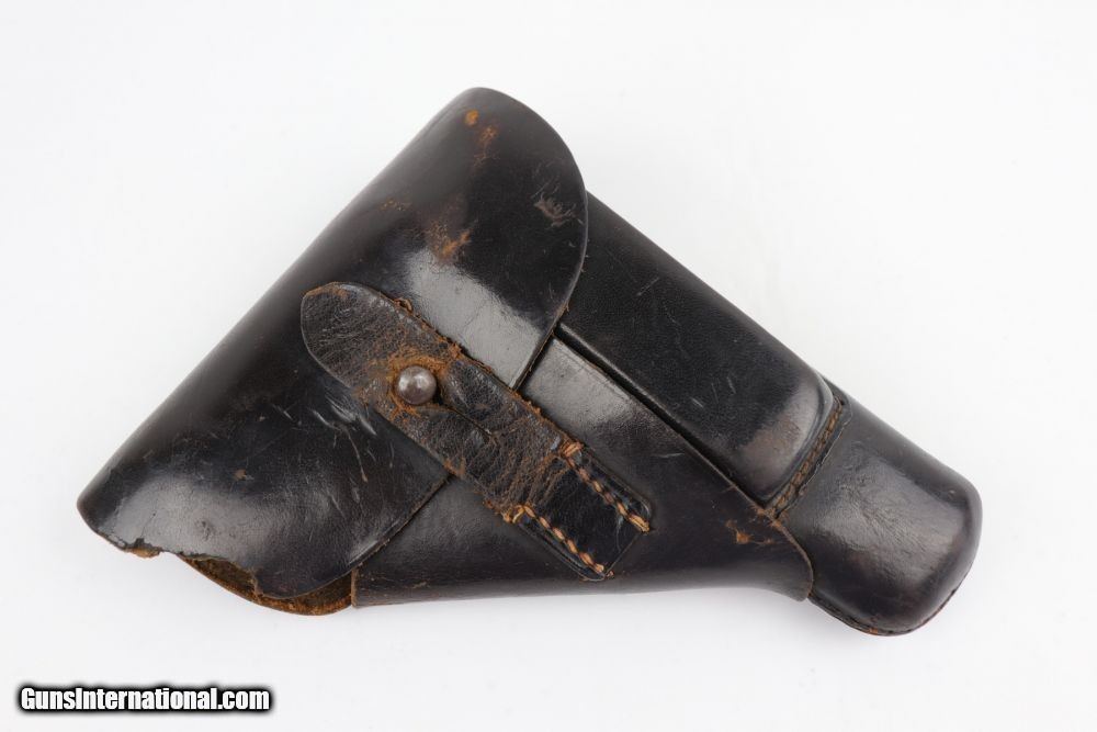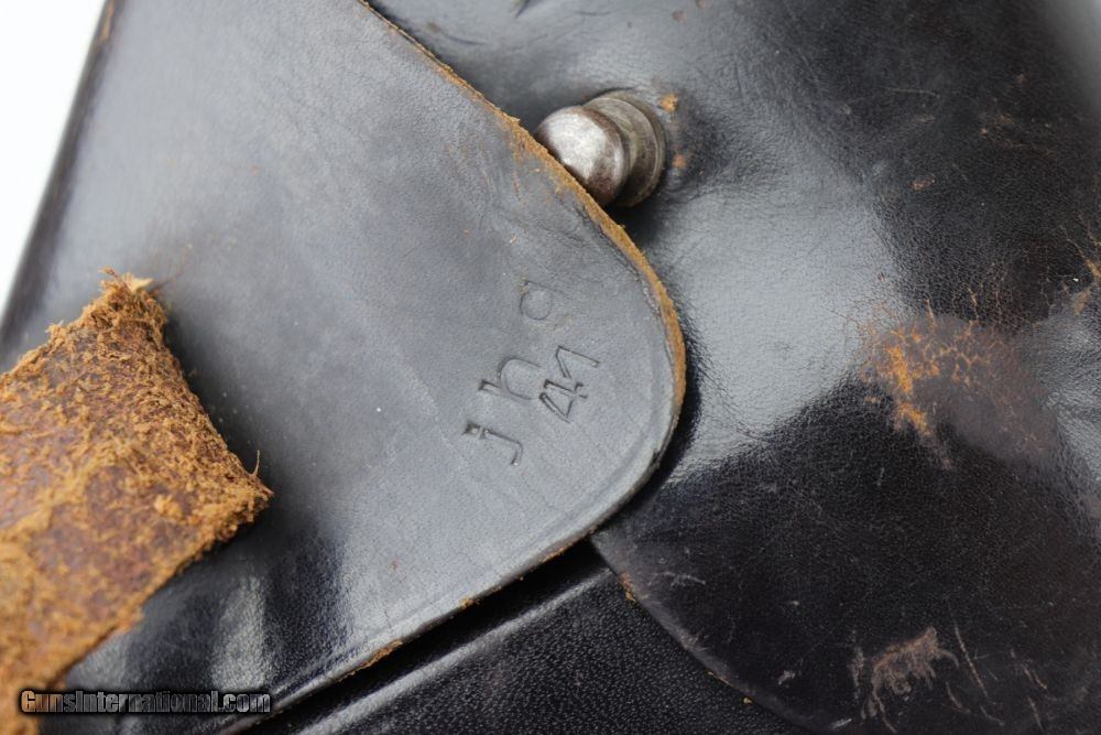 Description: This is an excellent Mauser HSC rig issued to the Nazi military in late 1941. The gun is properly Eagle/135 waffenamt and has Eagle/N proofs. The gun has retained about 96% of its original finish. The left profile view is excellent and there is very little finish loss on most of the gun. Most of the finish loss is on the very back of the tang. Besides that, there is very minor high edge wear and one small area of wear on the right side of the slide. There are a few handling marks on the grips and one circular black mark on the right grip panel. The bore is shiny with good rifling. The rig comes with one period-correct magazine and holster. The holster is ink-stamped, is waffen proofed on the closure strap, and is dated 1941. The leather around the hole in the closure strap is weak and a chunk of the top flap is missing. SOLD Curio/Relic: Yes Handgun Caliber: 7.65x22mm Parabellum (7.65x22mm Luger, .30 Luger) Manufacturer: Mauser Model: HSC Serial Number: 746363 Condition: ~96% Bore Condition: 9/10 Manufacture Date: 1941 |