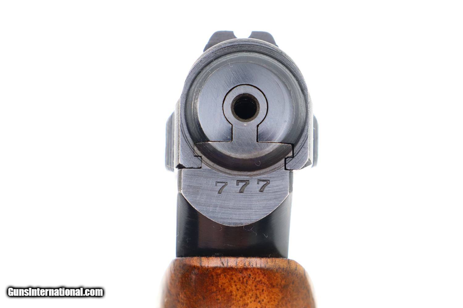 Description: Synopsis: Original Mauser 1934 Pistol, Military, German Army issue WWII, 601777, FB01186 Description: Desirable and all matching Mauser 1934 Pocket Pistol, standard configuration with fixed front sight and drift adjustable rear sight. Usual Mauser marking on each side of slide and sideplate. Fully matching. Nazi Army, WII Waffenamt proofed on left tang, in correct serial range. Correct magazine with 7 indicator holes on left side and detachable Mauser banner floorplate with round nose. Condition: VG/EXC original condition with bright, highly polished salt blue. Sharp edge wear as one would expect from a holstered handgun with discoloration as imaged near bottom of frontstrap. Comparable condition grip and magazine. Mirror bore. Perfect manual mechanics. A scarce Waffenamt accepted Mauser pistol sought by every collector of WWII axis pistols! ~~Insured shipping fee of $55; most packages shipped using FedEx 2nd Day.~~ SOLD Curio/Relic: Yes Manufacturer: Mauser Serial Number: 601777 Caliber Info: 7.65 |