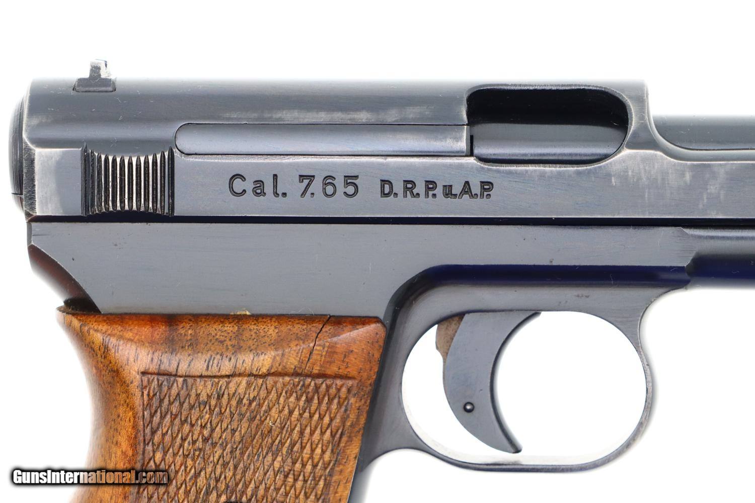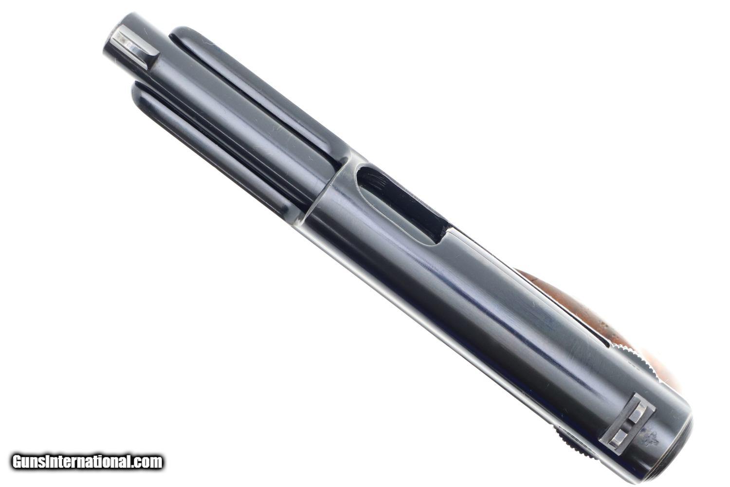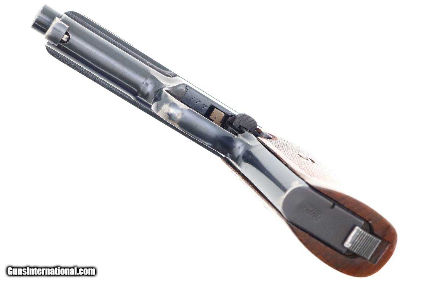 Description: Synopsis: Original Mauser 1934 Pistol, Military, German Army issue WWII, 601777, FB01186 Description: Desirable and all matching Mauser 1934 Pocket Pistol, standard configuration with fixed front sight and drift adjustable rear sight. Usual Mauser marking on each side of slide and sideplate. Fully matching. Nazi Army, WII Waffenamt proofed on left tang, in correct serial range. Correct magazine with 7 indicator holes on left side and detachable Mauser banner floorplate with round nose. Condition: VG/EXC original condition with bright, highly polished salt blue. Sharp edge wear as one would expect from a holstered handgun with discoloration as imaged near bottom of frontstrap. Comparable condition grip and magazine. Mirror bore. Perfect manual mechanics. A scarce Waffenamt accepted Mauser pistol sought by every collector of WWII axis pistols! ~~Insured shipping fee of $55; most packages shipped using FedEx 2nd Day.~~ SOLD Curio/Relic: Yes Manufacturer: Mauser Serial Number: 601777 Caliber Info: 7.65 |