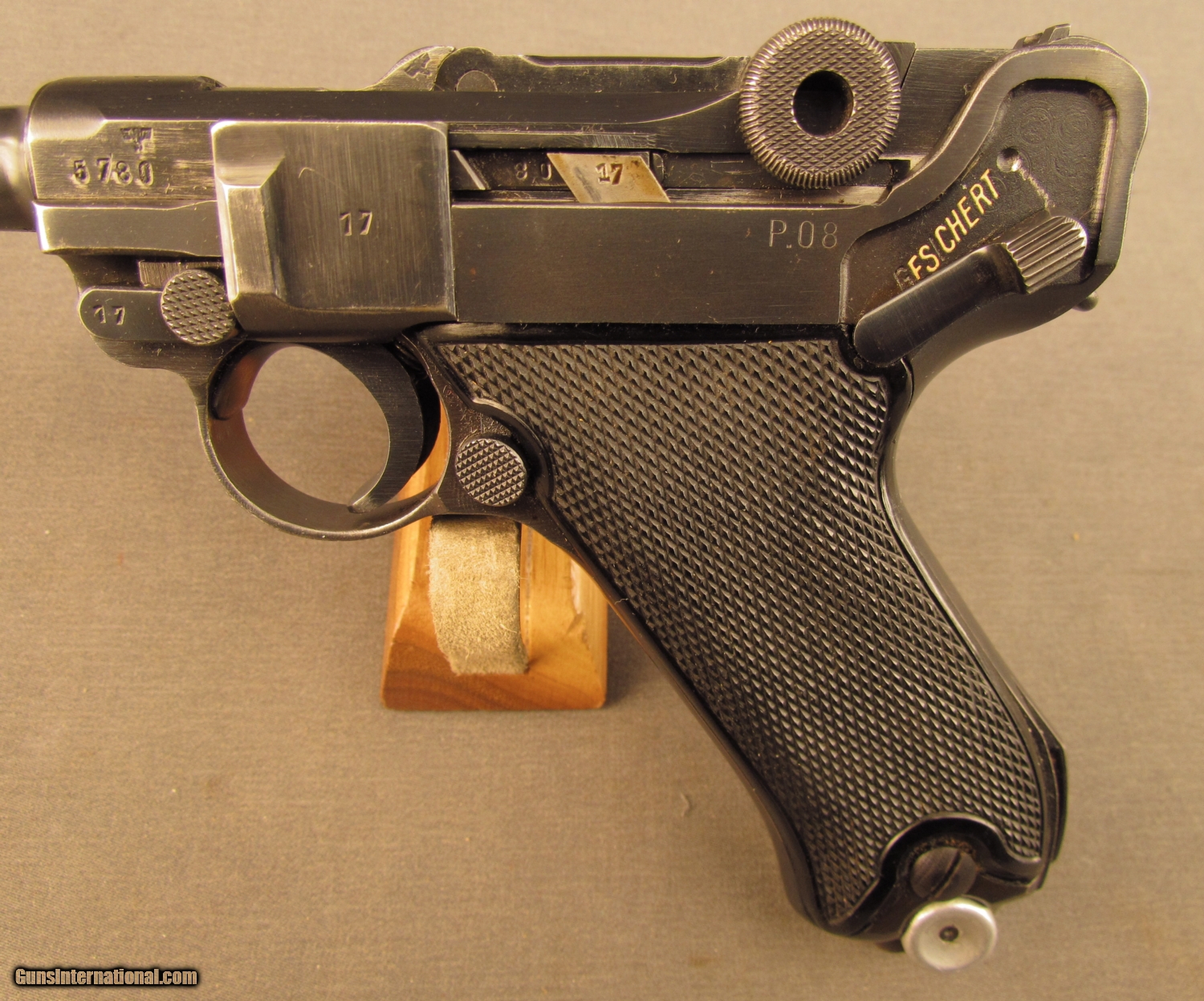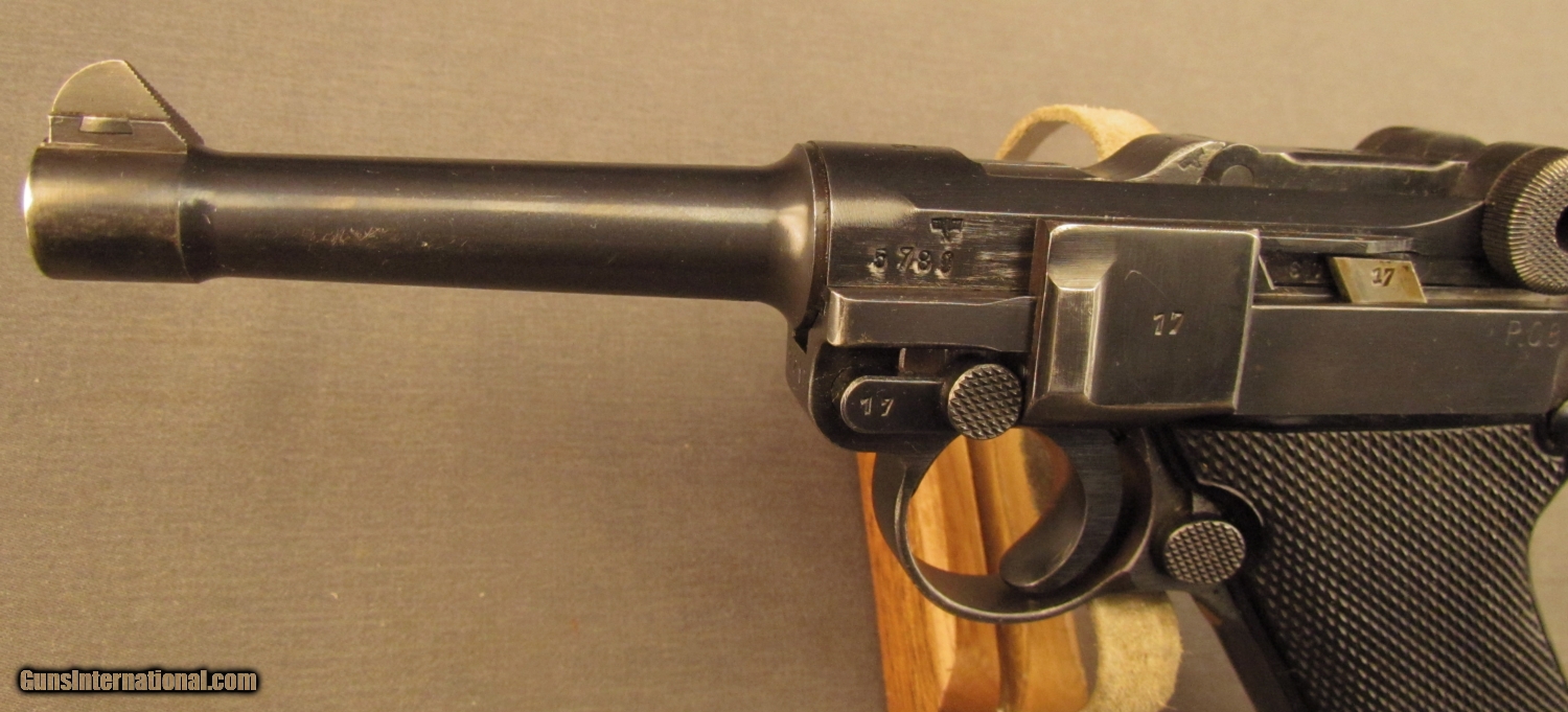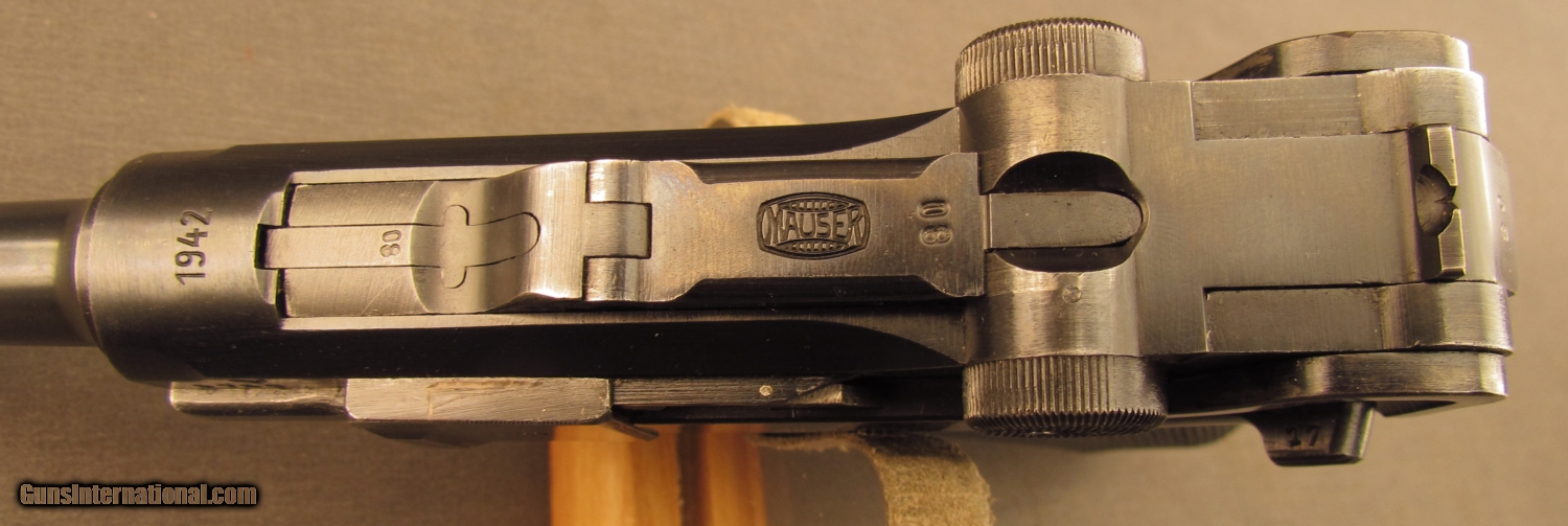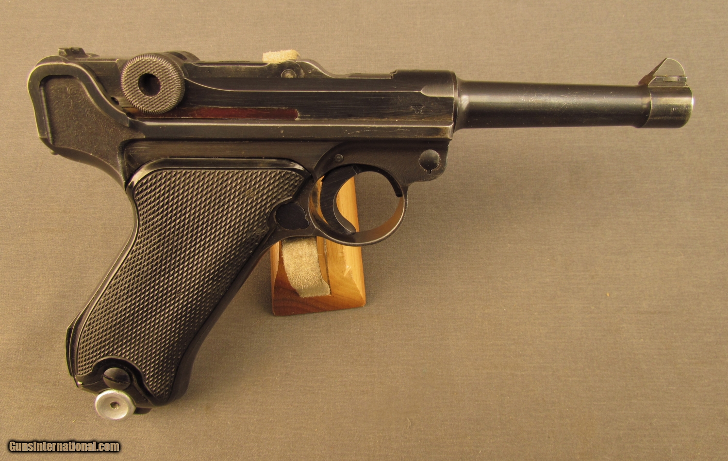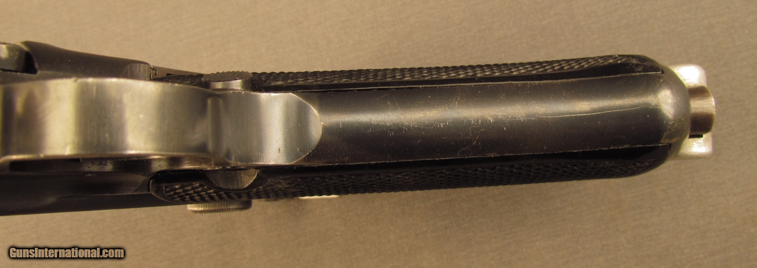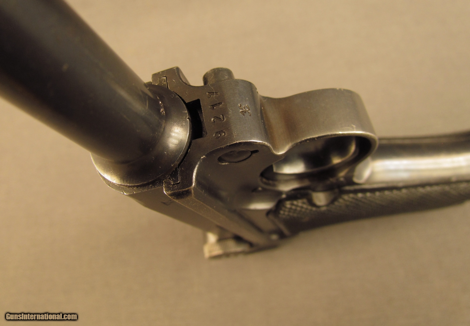 Description: Serial #9217x, 9mm Para., 4” barrel with an excellent, bright bore. This is a Mauser Banner marked, 1942 dated pistol with sear safety and correct, but non-matching numbered frame and receiver assemblies (numbered “9217” and “5780” respectively). The metal retains 92-95% of the original dark blue finish with some mild silvering at the muzzle as well as along the exposed edges and projections. The pistol has a commercial “(eagle)/N” proof on the left side of the receiver and a further “(eagle)L” Polizei stamp on the right. The black phenolic resin, “Black Widow” grips are in fine shape with only a few minor handling blemishes and some very mild flattening of the points. A single non-matching aluminum base magazine is included (numbered “7658k” on the base). Despite the mismatched numbers on the frame and receiver groups, this is still a truly nice “Black Widow” Police Luger that is not import marked, and would make a great addition to any collection. FFL or C&R SOLD Curio/Relic: Yes Manufacturer: Mauser Model: Luger Serial Number: 9217x Caliber Info: 9mm Gauge Info: 9mm |