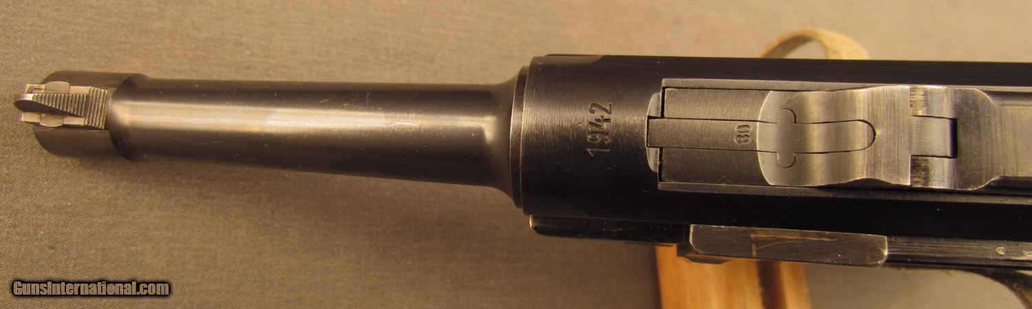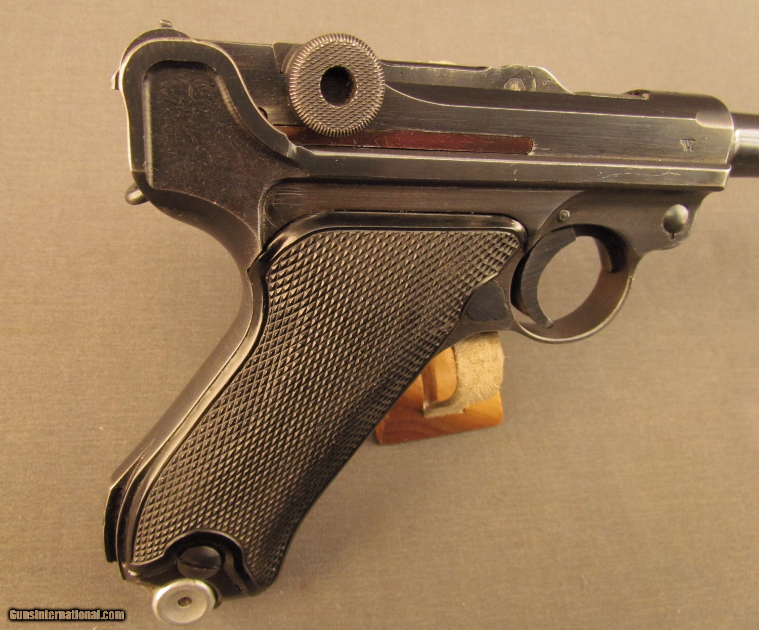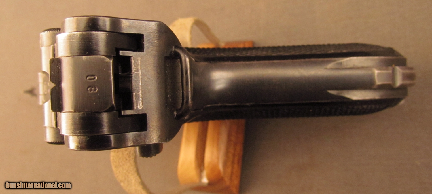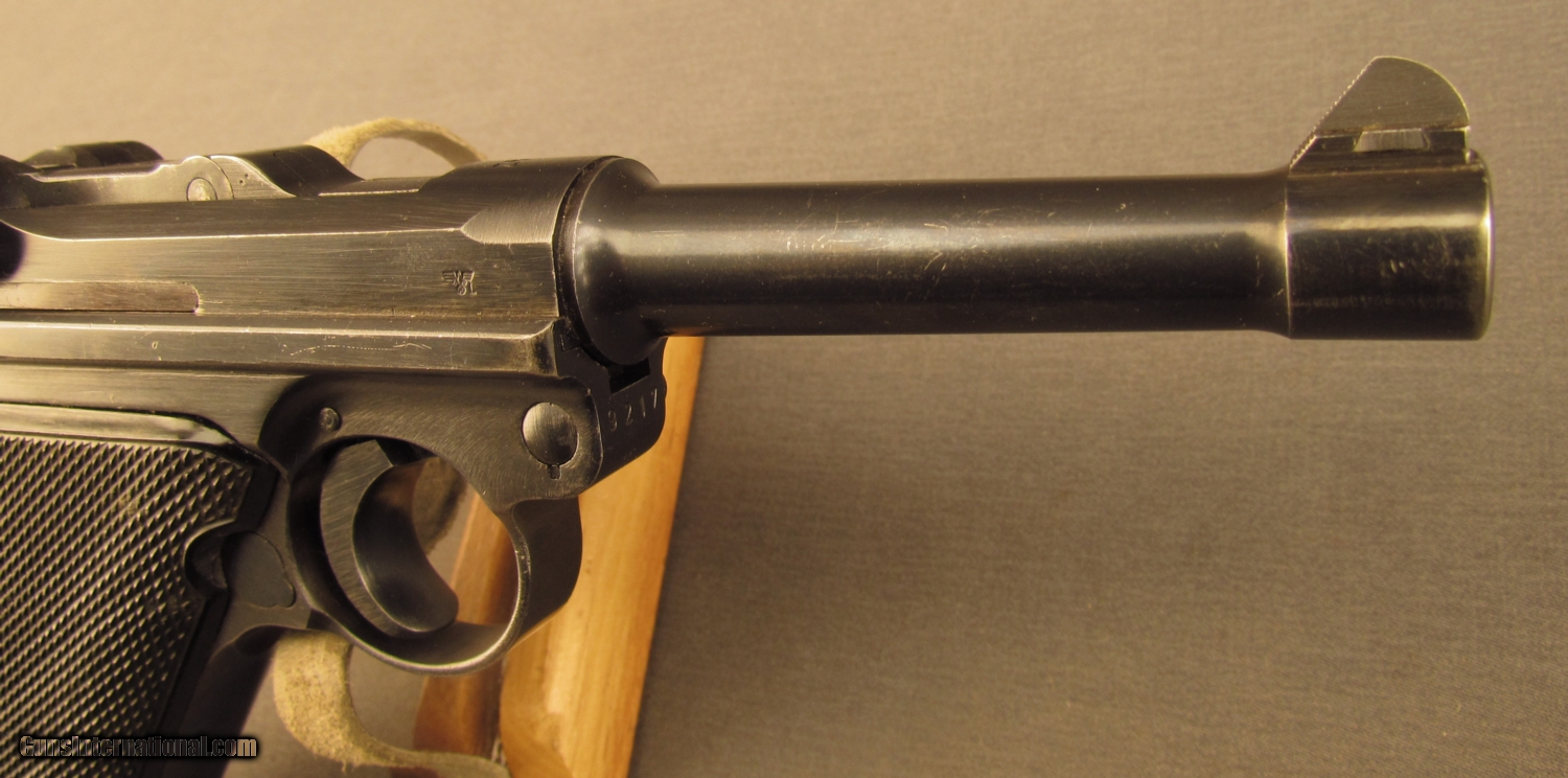 Description: Serial #9217x, 9mm Para., 4” barrel with an excellent, bright bore. This is a Mauser Banner marked, 1942 dated pistol with sear safety and correct, but non-matching numbered frame and receiver assemblies (numbered “9217” and “5780” respectively). The metal retains 92-95% of the original dark blue finish with some mild silvering at the muzzle as well as along the exposed edges and projections. The pistol has a commercial “(eagle)/N” proof on the left side of the receiver and a further “(eagle)L” Polizei stamp on the right. The black phenolic resin, “Black Widow” grips are in fine shape with only a few minor handling blemishes and some very mild flattening of the points. A single non-matching aluminum base magazine is included (numbered “7658k” on the base). Despite the mismatched numbers on the frame and receiver groups, this is still a truly nice “Black Widow” Police Luger that is not import marked, and would make a great addition to any collection. FFL or C&R SOLD Curio/Relic: Yes Manufacturer: Mauser Model: Luger Serial Number: 9217x Caliber Info: 9mm Gauge Info: 9mm |
