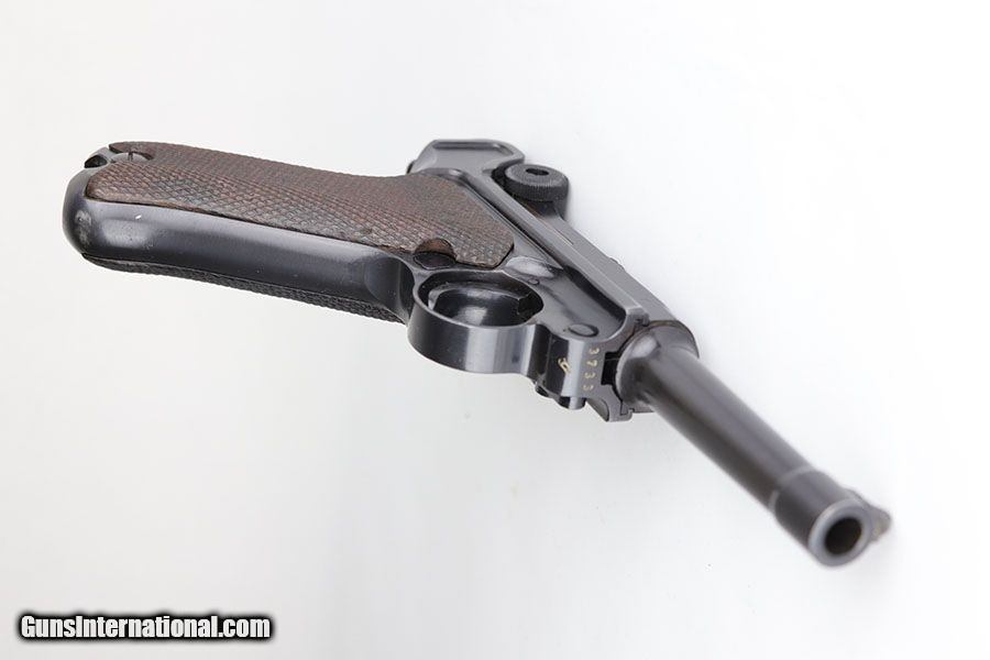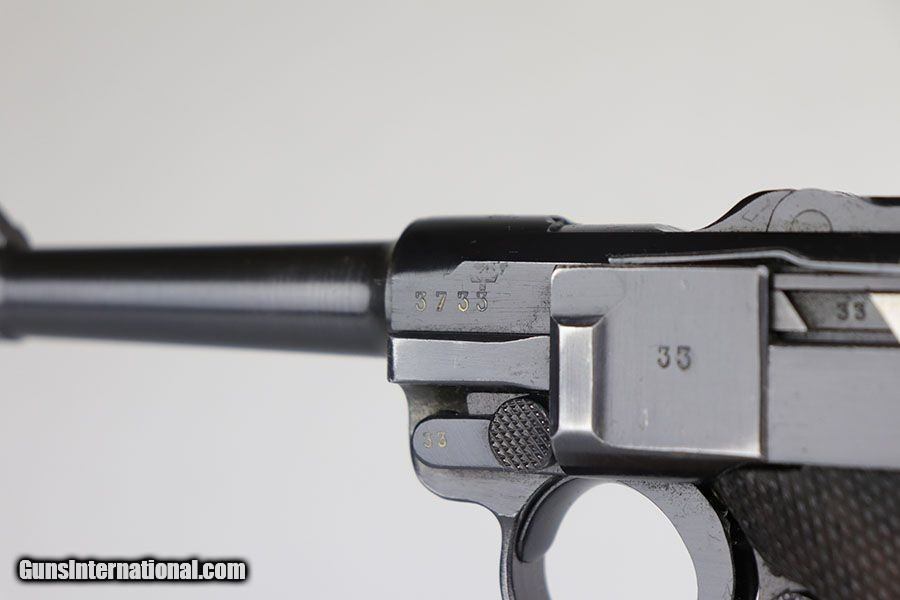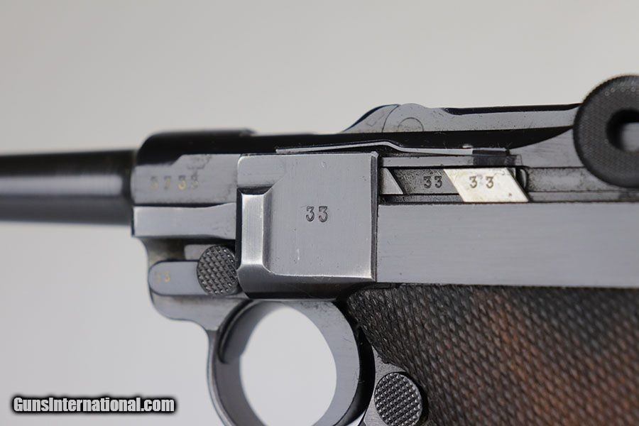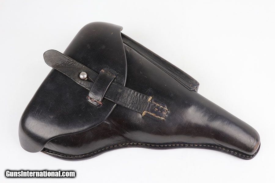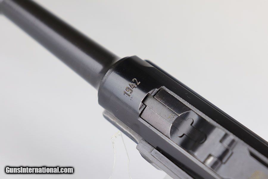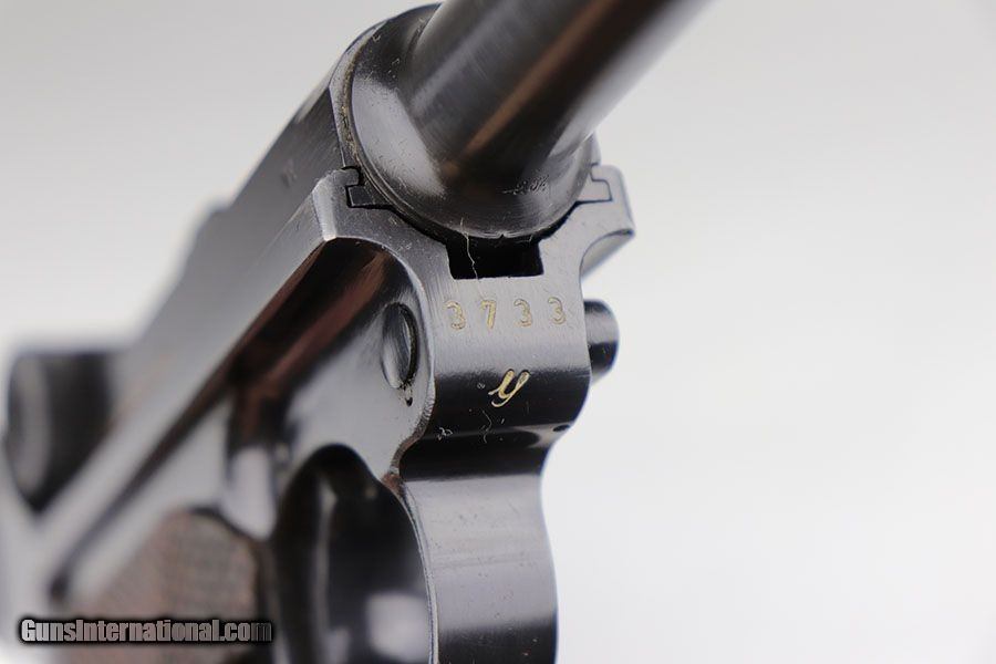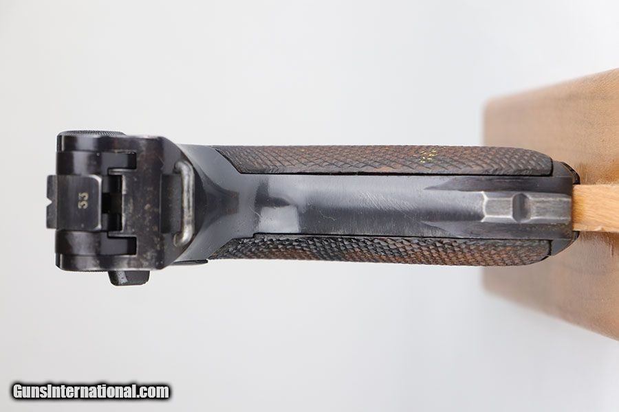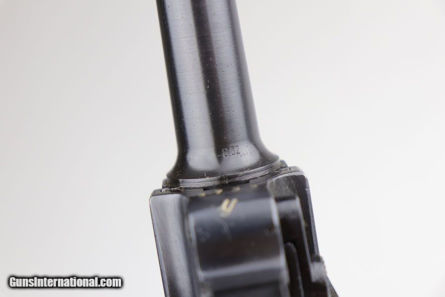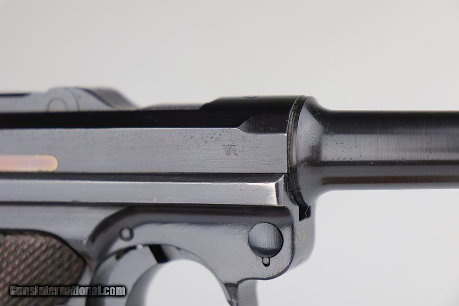 Description: This is a near-mint example of a rare Police Mauser Luger rig from 1942. The pistol has all matching numbers, including one of the original magazines. It has about 97-98% of the original blue, with minor holster wear on the sideplate, bottom of front strap and rear frame. There were only about 20,000 Police Lugers produced with Eagle/L marking on receiver, and only ~5,550 with 1942 date. The original left grip panel is present but has a chip under the safety, and the right panel is mismatched. Right panel is also slightly loose due to being undersized, so we put in a temporary wedge to keep it from moving. Terrific bore. Rig includes an original E/63 tool and is completed by an excellent police holster with 1941 date. SOLD Curio/Relic: Yes Manufacturer: Mauser Model: P.08 Serial Number: 3733y Caliber Info: 9mm Condition: 98% Bore Condition: 9/10 Manufacture Date: 1942 |