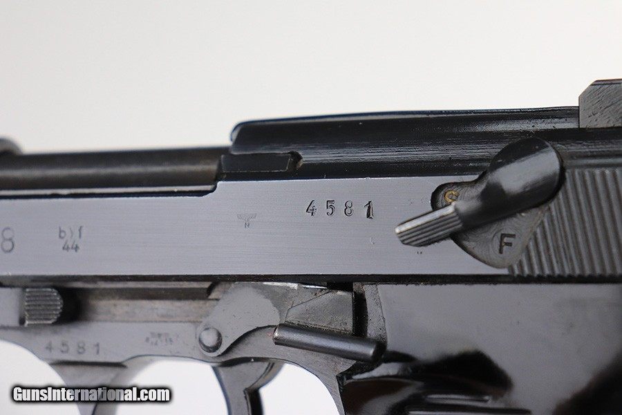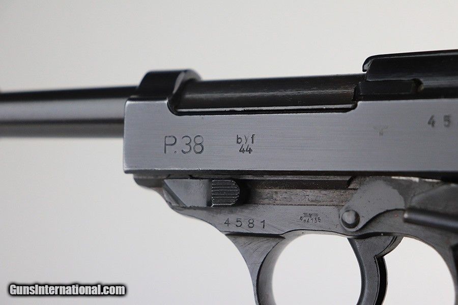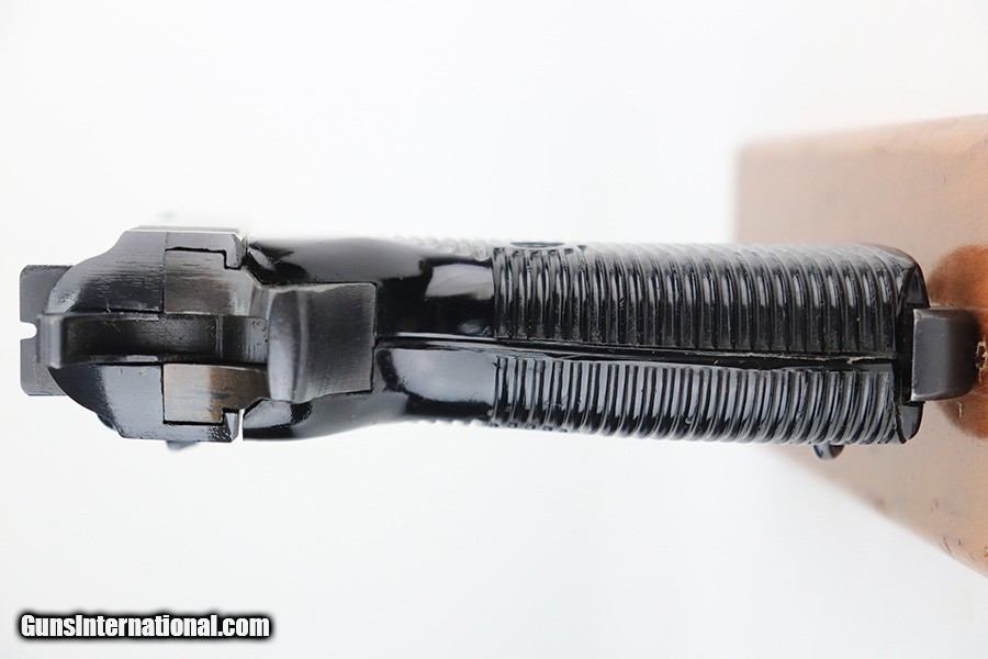 Description: This is a rare Mauser P.38 that was issued to the German Police in 1944. It's Eagle/F marked, one of only 1,500 produced. It's all matching numbers but the finish was re-done at some point as the pistol is all blued but these always featured dual-tone or phosphate finishes. It does not appear to be a dipped gun, however, as our magic cloth was unable to remove finish. The trigger spring is also in the white, but the locking block is blued, so a bit of an oddity. It's in great shape though, and fully functional. Excellent grips with only minor handling wear. Bore has a little frost in the grooves but shiny with strong rifling. Mauser magazine. SOLD Handgun Caliber: 9x19mm Parabellum (9mm Luger, 9x19mm NATO) Bore: 7.5/10 Condition: 99% |