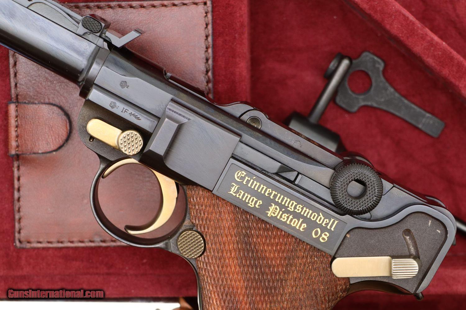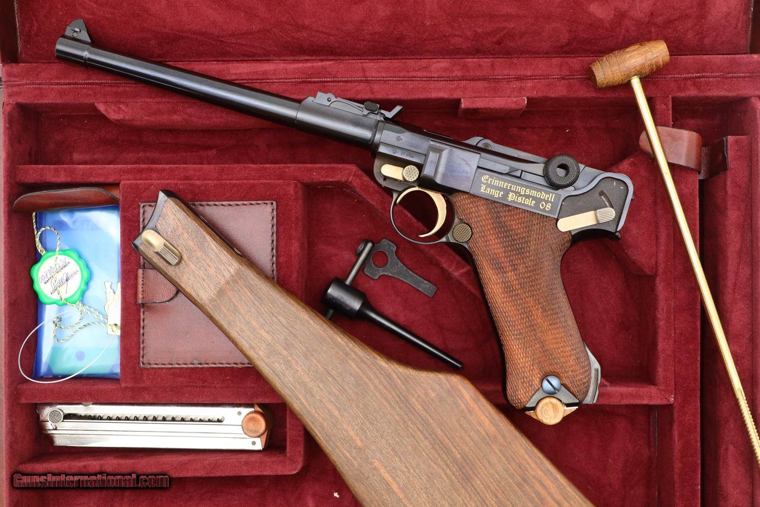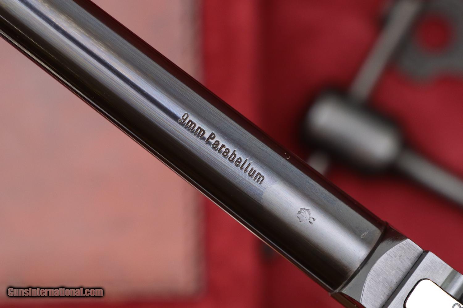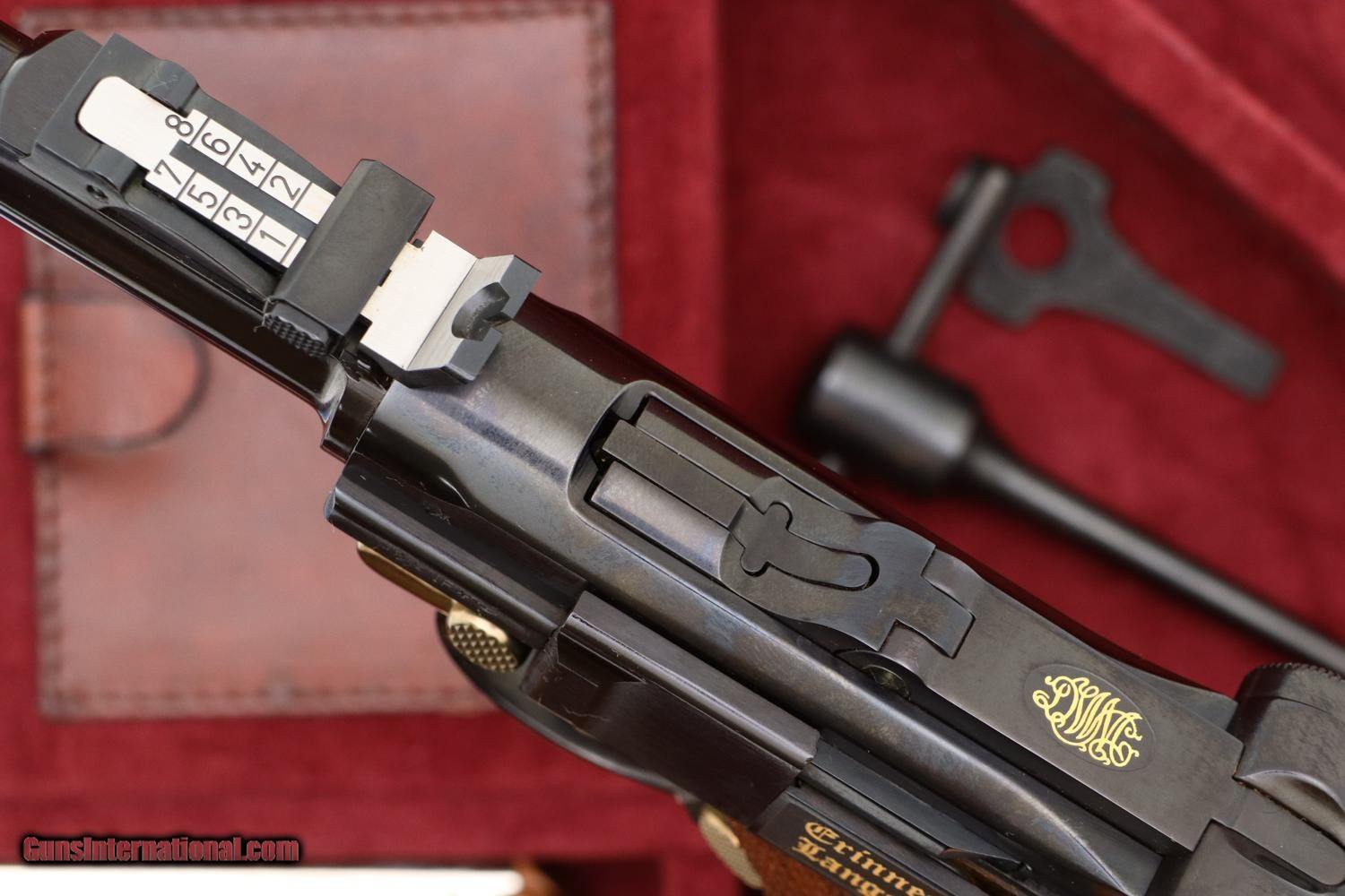 Description: Synopsis: Spectacular Mauser Artillery Luger Commemorative, Cased, L008von250, FB01296 Description: As new Mauser Artillery Luger Commemorative, SN 8 of 250 made, NOT IMPORT MARKED, cased with a full complement of accessories to include hanging tag, stock, matching test target, instruction booklet, sight adjustment tool, cleaning rod, spare magazine, & loading tool, in original burgundy case with dual set of gold-plated keys. The pistol is a standard configuration Mauser-made Artillery Luger year coded IF (85) with 1-8 graduated rear sight and fine-tune front sight. Intertwined gold-inlaid DWM on forward toggle link, gold-inlaid commemorative reference on left side of frame. “MADE IN GERMANY” on back of frame behind toggle. Full SN on right side of barrel extension and frame. Single-line Mauser address on front strap. Highly polished salt blued with strawed small parts, excepting grip screws that are fire-blued. Complete with two Mauser banner-marked magazines with wood plugs. Correct unmarked board stock, cleaning rod, front sight adjustment tool, unmarked magazine loader, matching hanging tag, and usual test target and literature in maroon carrying case. Condition: The ensemble presents as new, except for two truly minuscule handling marks on the left side, upper ear of the frame. There is no thinning of the strawed or fire-blued parts. The stock is as new, as are all accessories. The case has a minuscule scuff on the top of the lid, right rear corner. An absolutely fantastic, virtually new, complete Mauser commemorative Luger, a wonderful addition to any Luger collection. ~~Insured shipping fee of $155; most packages shipped using FedEx 2nd Day.~~ SOLD Manufacturer: Mauser Serial Number: L008von250 Caliber Info: 9mmP |