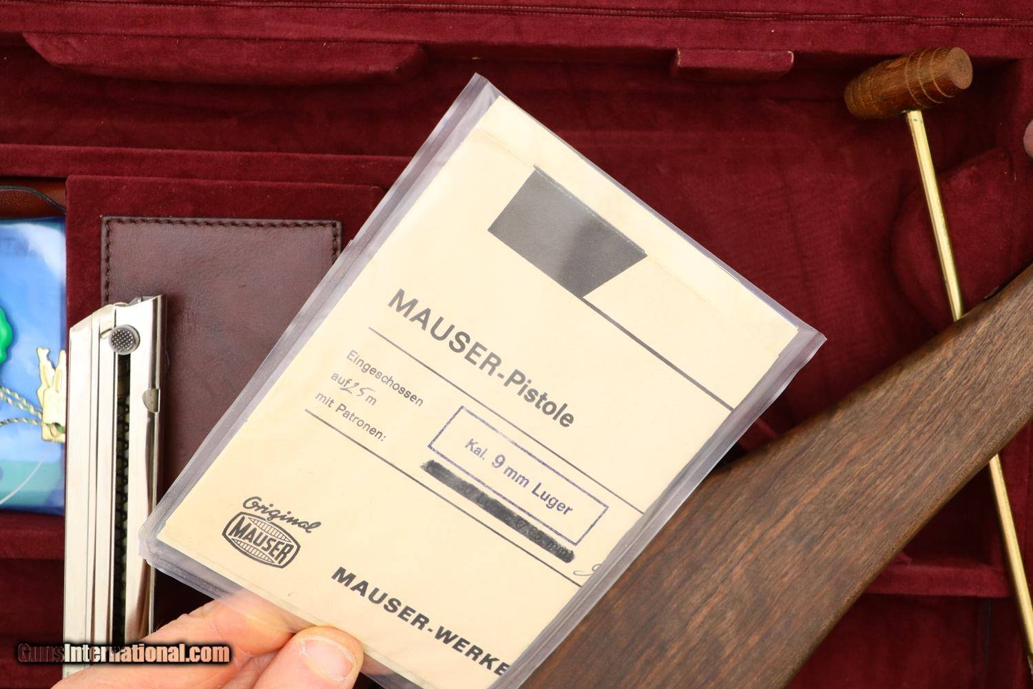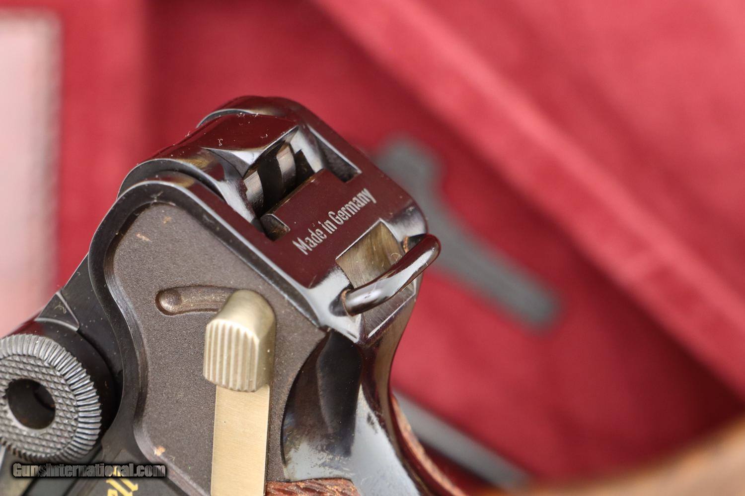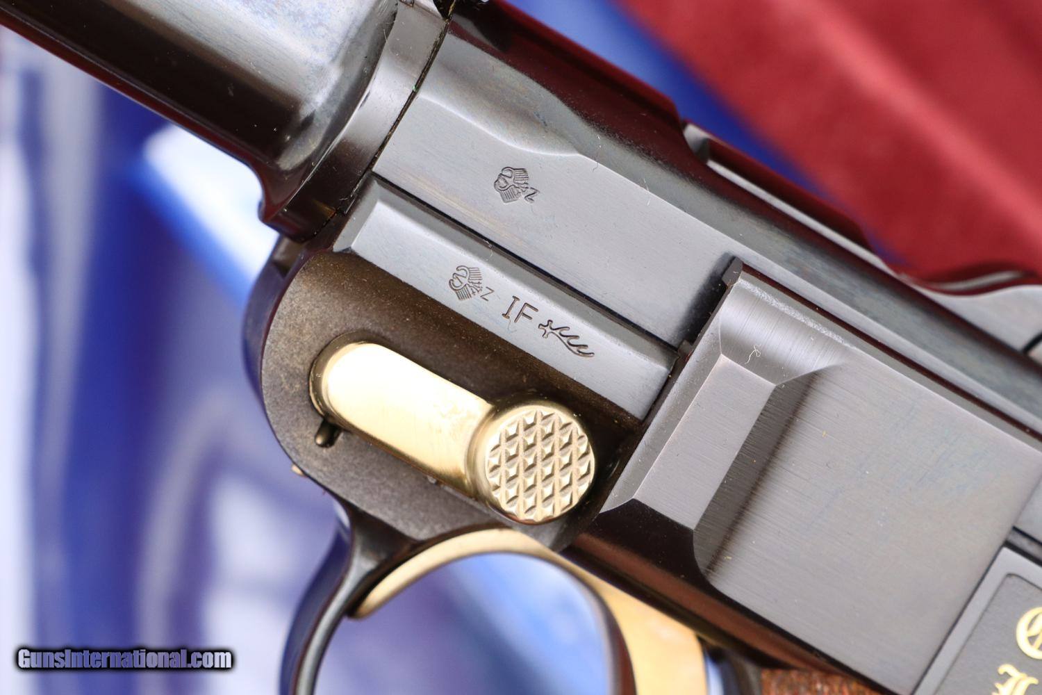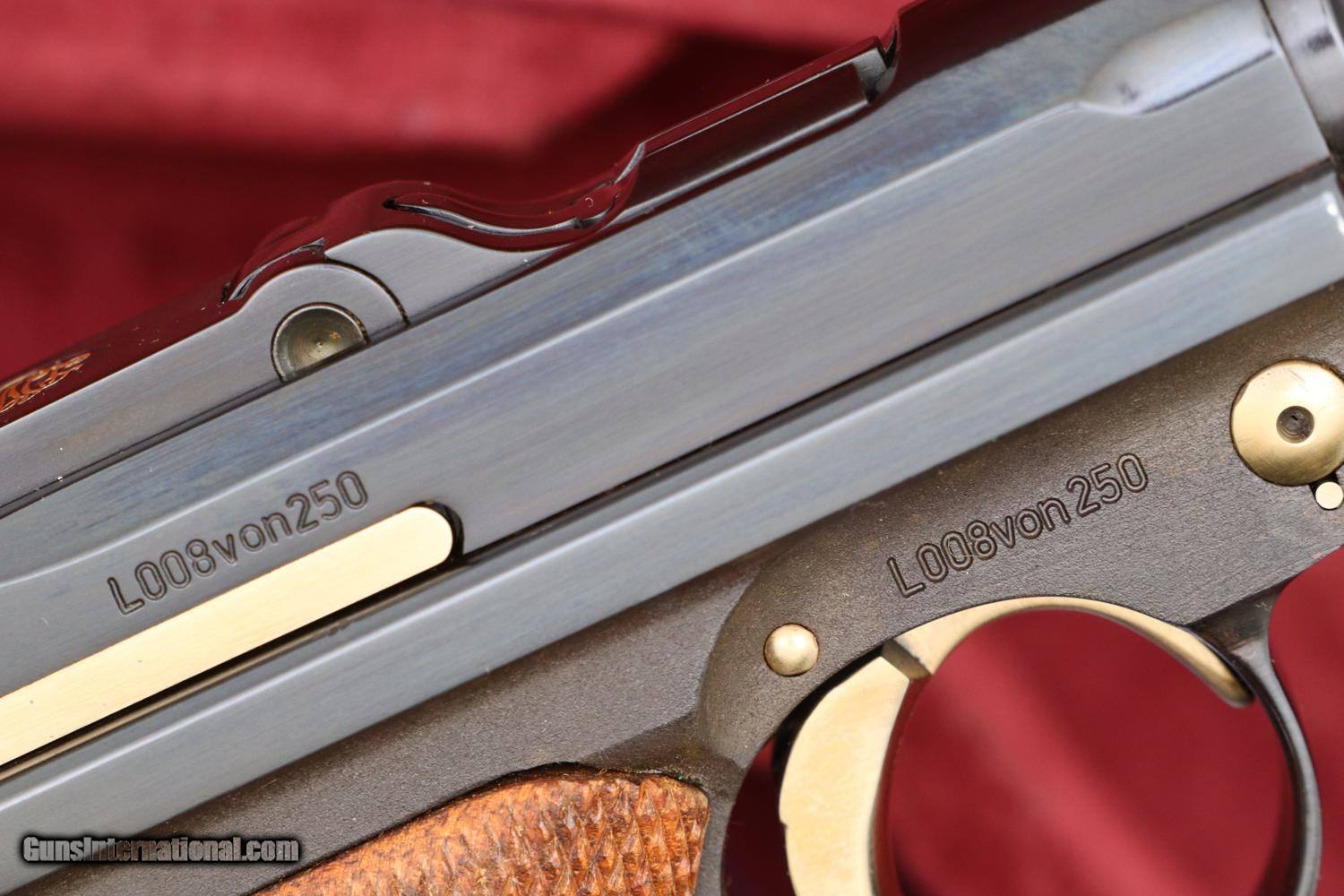 Description: Synopsis: Spectacular Mauser Artillery Luger Commemorative, Cased, L008von250, FB01296 Description: As new Mauser Artillery Luger Commemorative, SN 8 of 250 made, NOT IMPORT MARKED, cased with a full complement of accessories to include hanging tag, stock, matching test target, instruction booklet, sight adjustment tool, cleaning rod, spare magazine, & loading tool, in original burgundy case with dual set of gold-plated keys. The pistol is a standard configuration Mauser-made Artillery Luger year coded IF (85) with 1-8 graduated rear sight and fine-tune front sight. Intertwined gold-inlaid DWM on forward toggle link, gold-inlaid commemorative reference on left side of frame. “MADE IN GERMANY” on back of frame behind toggle. Full SN on right side of barrel extension and frame. Single-line Mauser address on front strap. Highly polished salt blued with strawed small parts, excepting grip screws that are fire-blued. Complete with two Mauser banner-marked magazines with wood plugs. Correct unmarked board stock, cleaning rod, front sight adjustment tool, unmarked magazine loader, matching hanging tag, and usual test target and literature in maroon carrying case. Condition: The ensemble presents as new, except for two truly minuscule handling marks on the left side, upper ear of the frame. There is no thinning of the strawed or fire-blued parts. The stock is as new, as are all accessories. The case has a minuscule scuff on the top of the lid, right rear corner. An absolutely fantastic, virtually new, complete Mauser commemorative Luger, a wonderful addition to any Luger collection. ~~Insured shipping fee of $155; most packages shipped using FedEx 2nd Day.~~ SOLD Manufacturer: Mauser Serial Number: L008von250 Caliber Info: 9mmP |
