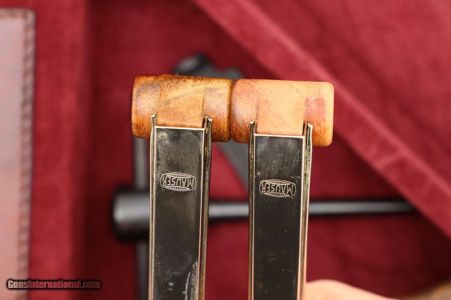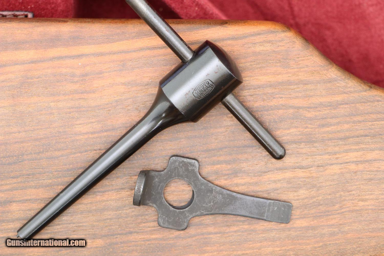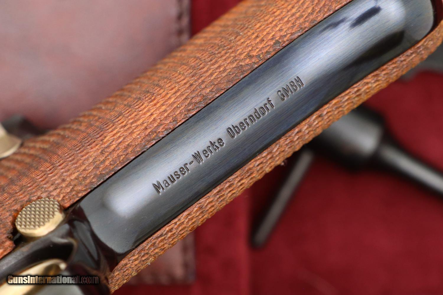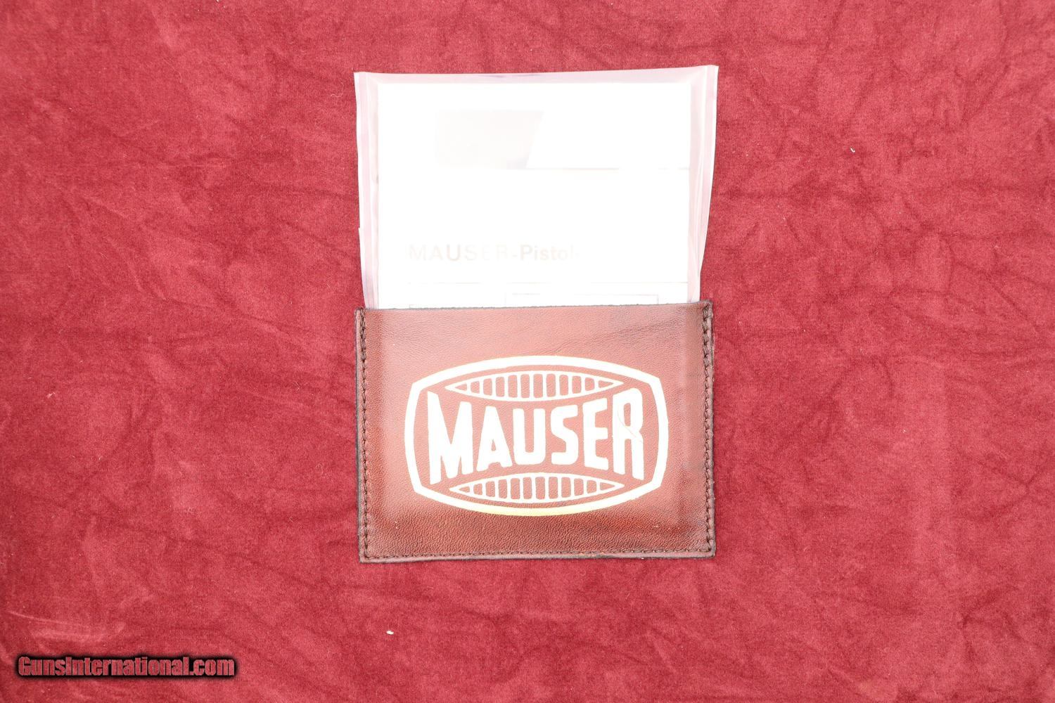 Description: Synopsis: Spectacular Mauser Artillery Luger Commemorative, Cased, L008von250, FB01296 Description: As new Mauser Artillery Luger Commemorative, SN 8 of 250 made, NOT IMPORT MARKED, cased with a full complement of accessories to include hanging tag, stock, matching test target, instruction booklet, sight adjustment tool, cleaning rod, spare magazine, & loading tool, in original burgundy case with dual set of gold-plated keys. The pistol is a standard configuration Mauser-made Artillery Luger year coded IF (85) with 1-8 graduated rear sight and fine-tune front sight. Intertwined gold-inlaid DWM on forward toggle link, gold-inlaid commemorative reference on left side of frame. “MADE IN GERMANY” on back of frame behind toggle. Full SN on right side of barrel extension and frame. Single-line Mauser address on front strap. Highly polished salt blued with strawed small parts, excepting grip screws that are fire-blued. Complete with two Mauser banner-marked magazines with wood plugs. Correct unmarked board stock, cleaning rod, front sight adjustment tool, unmarked magazine loader, matching hanging tag, and usual test target and literature in maroon carrying case. Condition: The ensemble presents as new, except for two truly minuscule handling marks on the left side, upper ear of the frame. There is no thinning of the strawed or fire-blued parts. The stock is as new, as are all accessories. The case has a minuscule scuff on the top of the lid, right rear corner. An absolutely fantastic, virtually new, complete Mauser commemorative Luger, a wonderful addition to any Luger collection. ~~Insured shipping fee of $155; most packages shipped using FedEx 2nd Day.~~ SOLD Manufacturer: Mauser Serial Number: L008von250 Caliber Info: 9mmP |