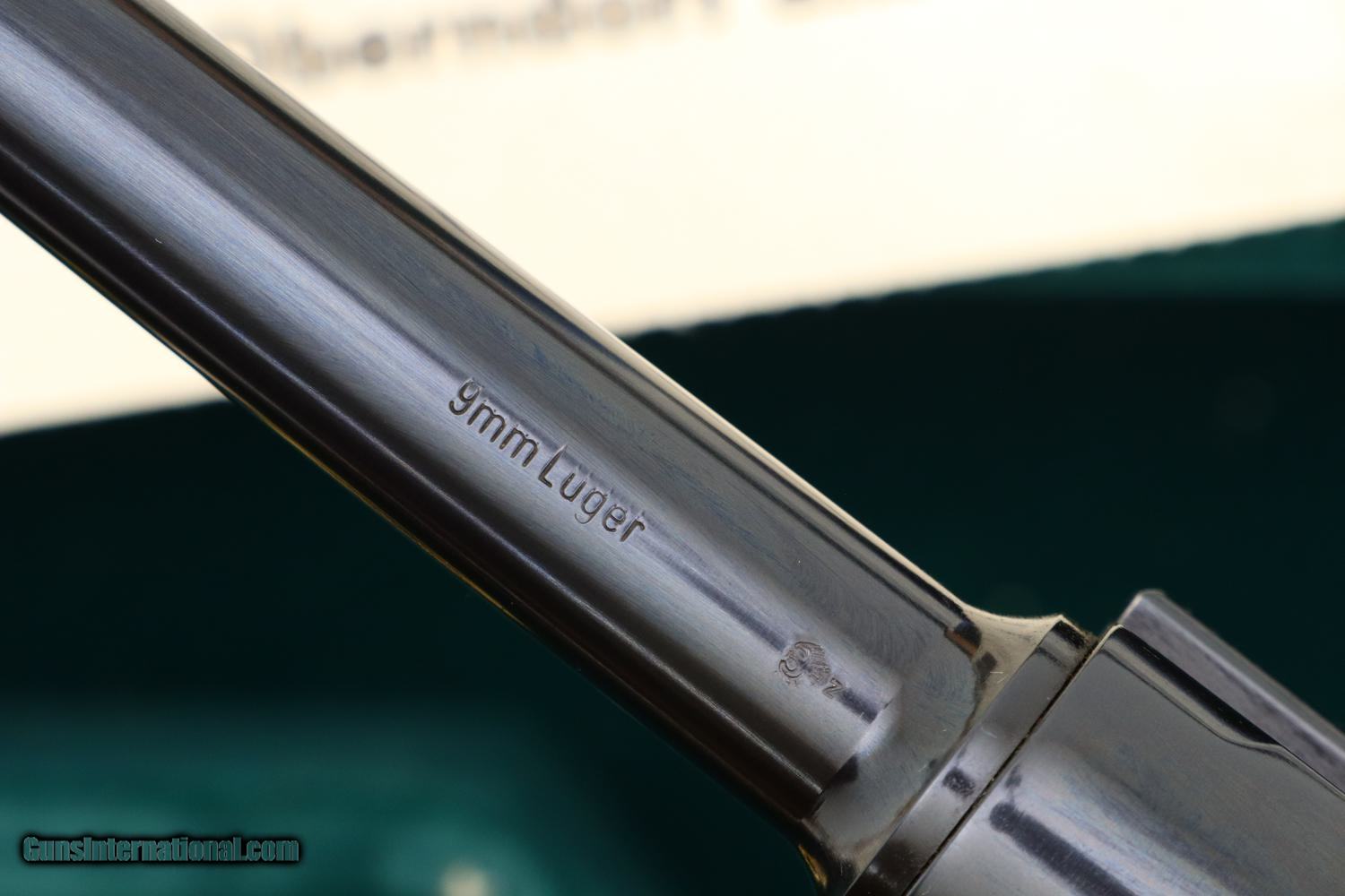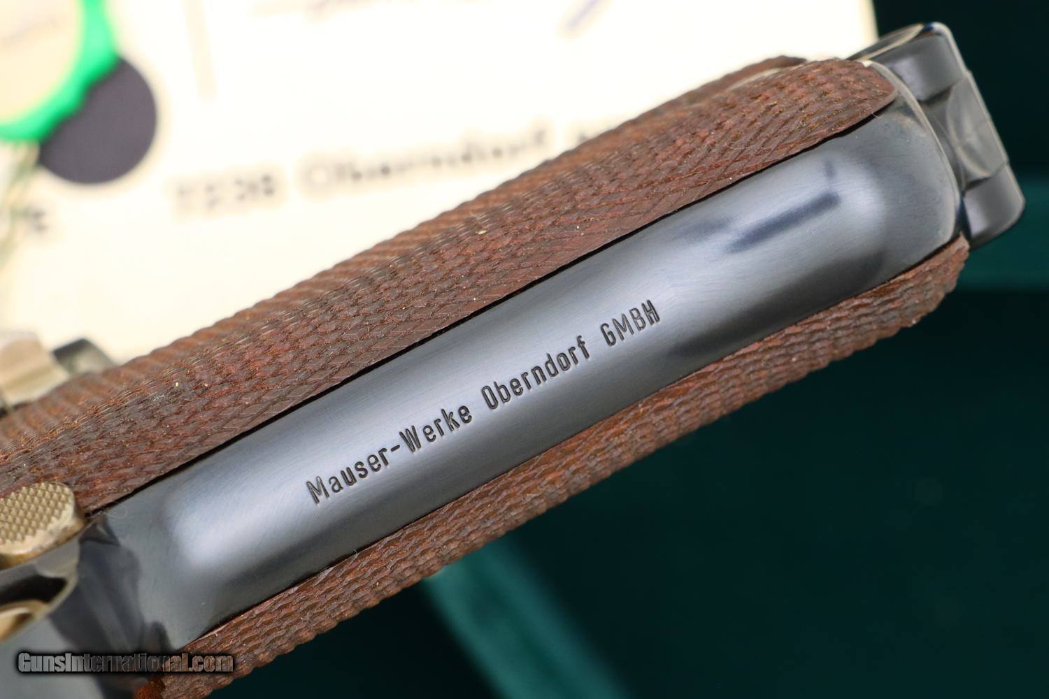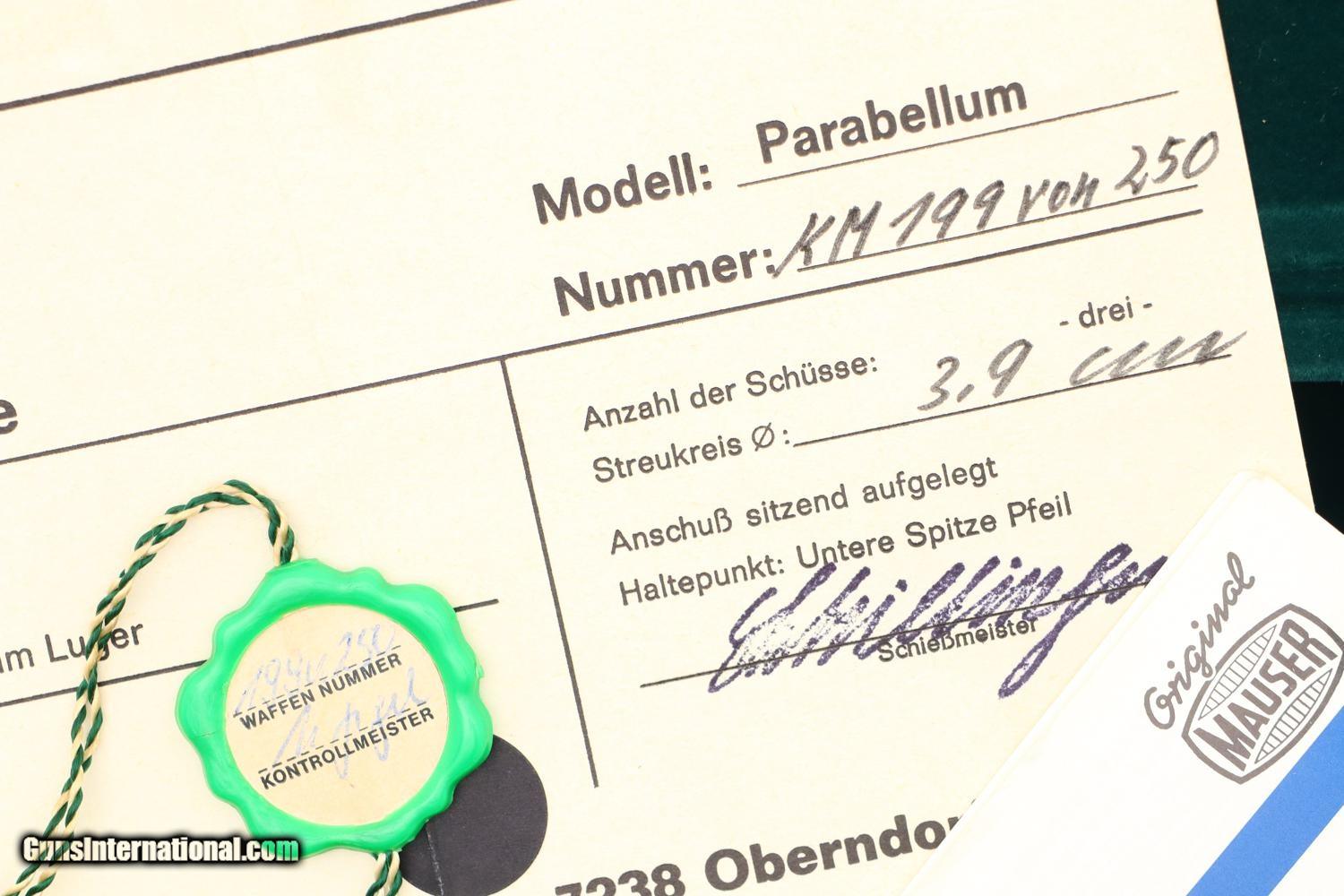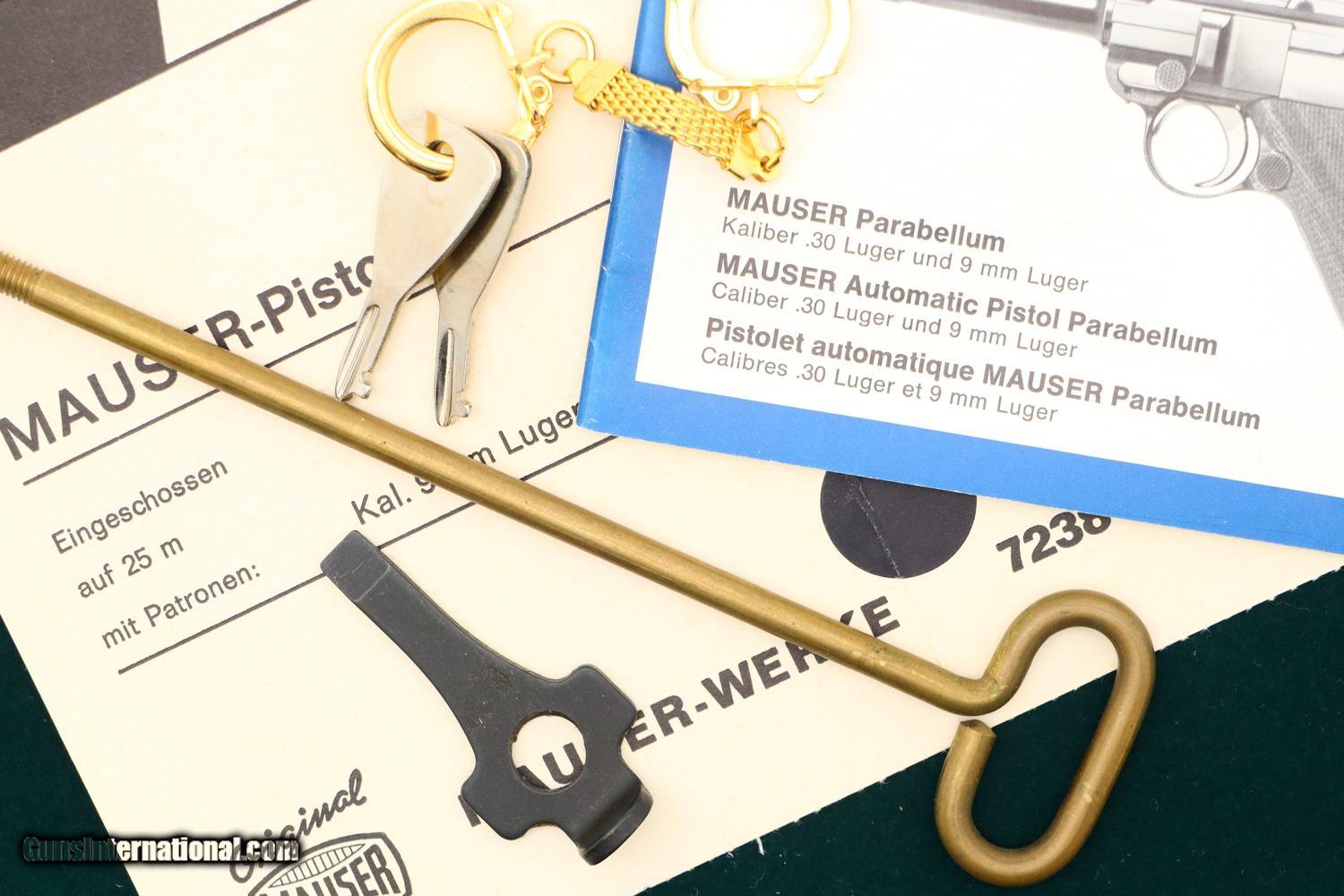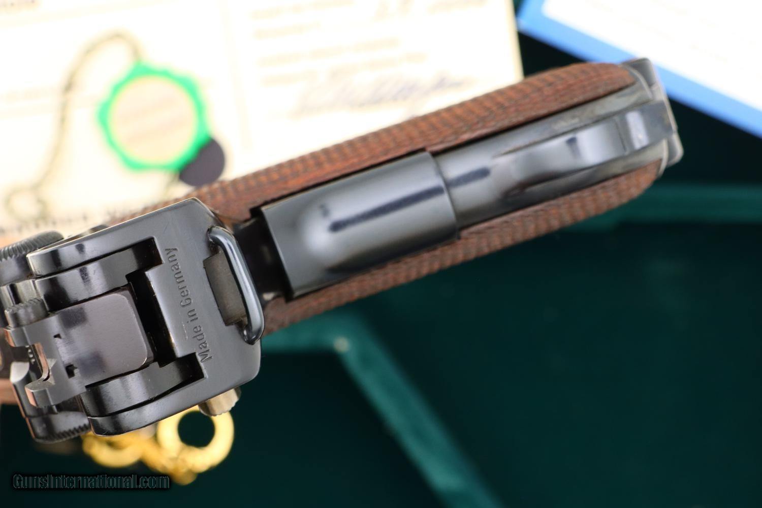 Description: Synopsis: Spectacular Mauser, Luger, P08, German Navy Commemorative, Cased, KM199von250, FB01297 Description: As new Mauser Navy Luger Commemorative, 75th year, made by Mauser in HK (1979) as a leather cased ensemble, production limited to 250 pistols, to include gun, spare magazine, matching test target, instruction booklet, original hanging tag, takedown tool, cleaning rod, and original tan attache case with two keys. Missing the Luger book by John Walter. This example, without import marks, has a standard 6in barrel, marked with caliber, having drift adjustable front sight and two position Navy rear sight. Middle toggle link with gold filled “DWM” monogram. Left side of frame with commemorative inscription “75 Jahre/Parabellum-Pistole/Kaiserliche Marine”. Right side of barrel extension and frame marked with serial number. Mauser address on frontstrap. “MADE IN GERMANY” on rear of frame above lanyard loop. Major components salt blued; strawed small parts except for the fire blued grip screws. Condition: As new, the pistol showing absolutely no wear, dried grease in protected areas. One magazine shows the faintest insertional wear; the other is brand new. Test target slightly discolored with usual folds but no losses. As new accessories and crisp literature. Virtually new tan case. An absolutely great ensemble, especially with no import marks, that could only be improved by the inclusion of the John Walter Luger book. ~~Insured shipping fee of $75; most packages shipped using FedEx 2nd Day.~~ SOLD Manufacturer: Mauser Serial Number: KM199von250 Caliber Info: 9mmP |