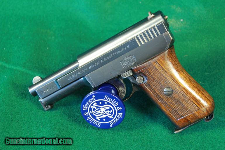Description: Mauser 1910 6.35 cal Very good to excellent condition with a couple of small scattered rust marks. Walnut grips, original magazine, excellent bore, numbers match 25xxxxx Unaltered and complete SOLD |