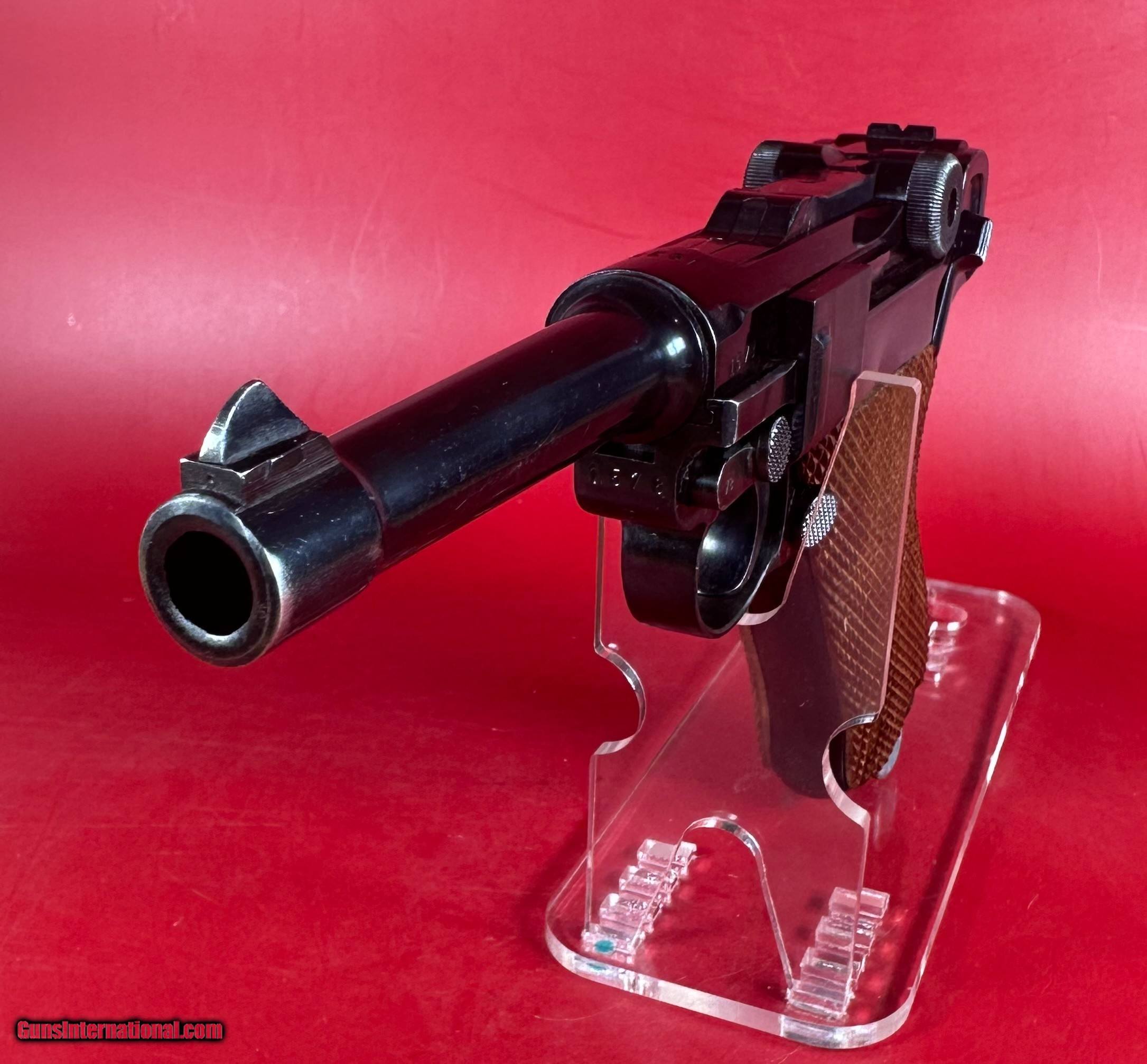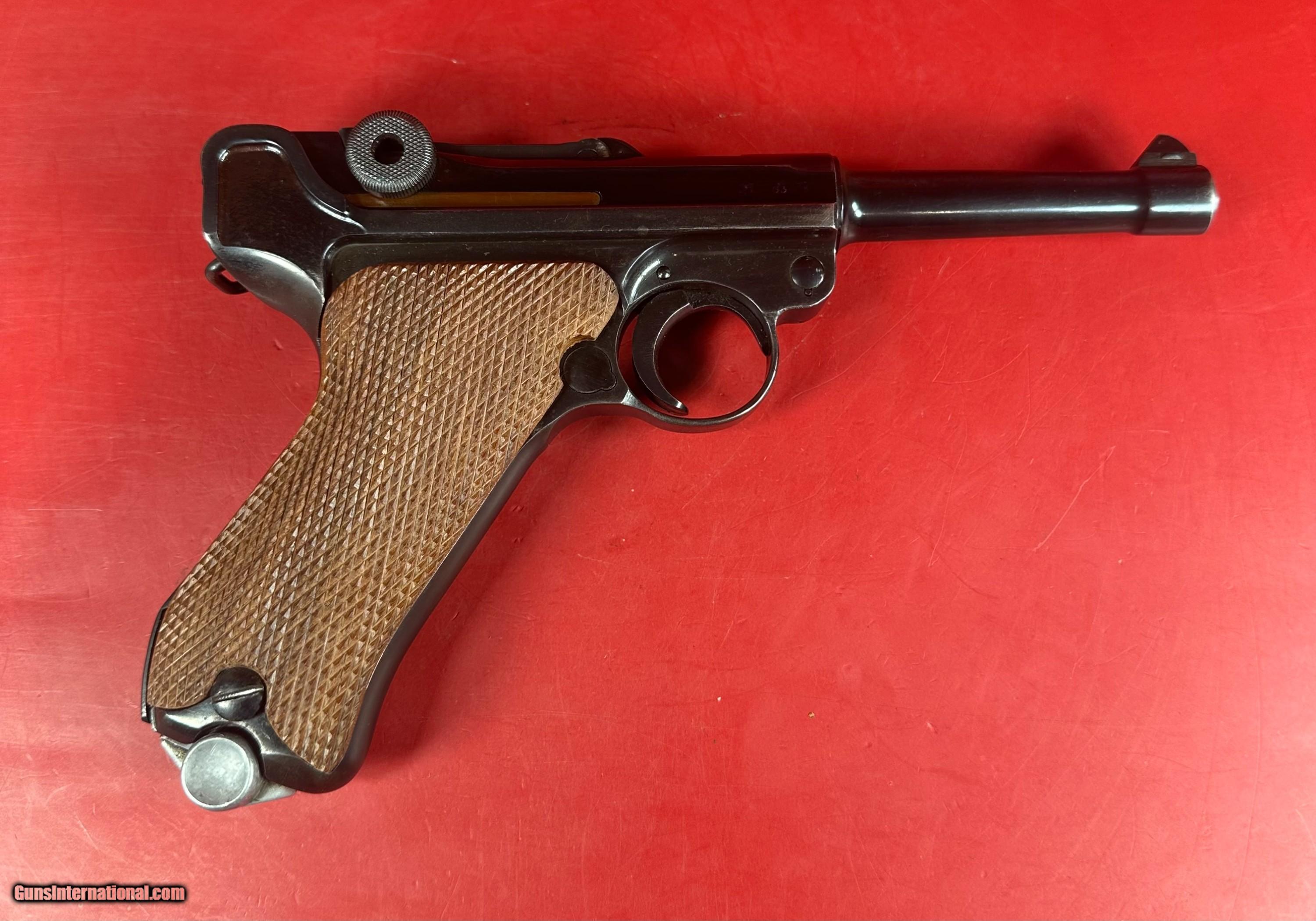 Description: For sale an iconic semi automatic pistol Mauser P08 Luger. This is war (WW2 WWII) production. The example is in excellent condition. Shiny bore with very strong rifling. Bluing is about 98%, grips are about 99%. All visible numbers are matching, magazine doesn't match. Action functions the way it should. Sale includes one magazine, luger tool. This gun will make a great addition to any collection. Specifications Manufacturer: Mauser Model: P08 Luger (P08 P.08 P-08 P 08) Caliber: 9mm Luger Capacity: 8+1 Barrel Length: 4" Finish: Blued Stock/Grips: Checkered wood grips Sight/Optic: Rear V notch groove, Front blade Magazines Included: 1x 8rd mag Layaway and payment plan are available. SOLD Handgun Caliber: 9x19mm Parabellum (9mm Luger, 9x19mm NATO) |