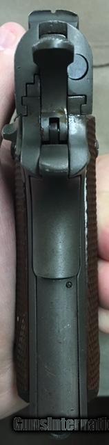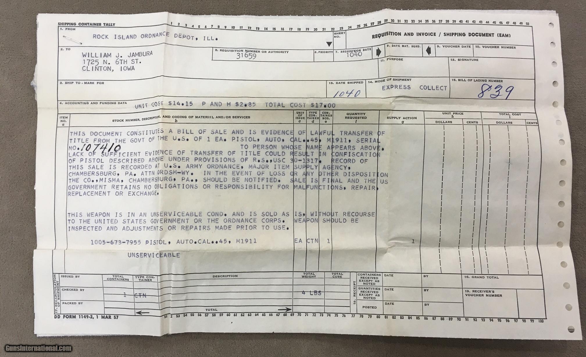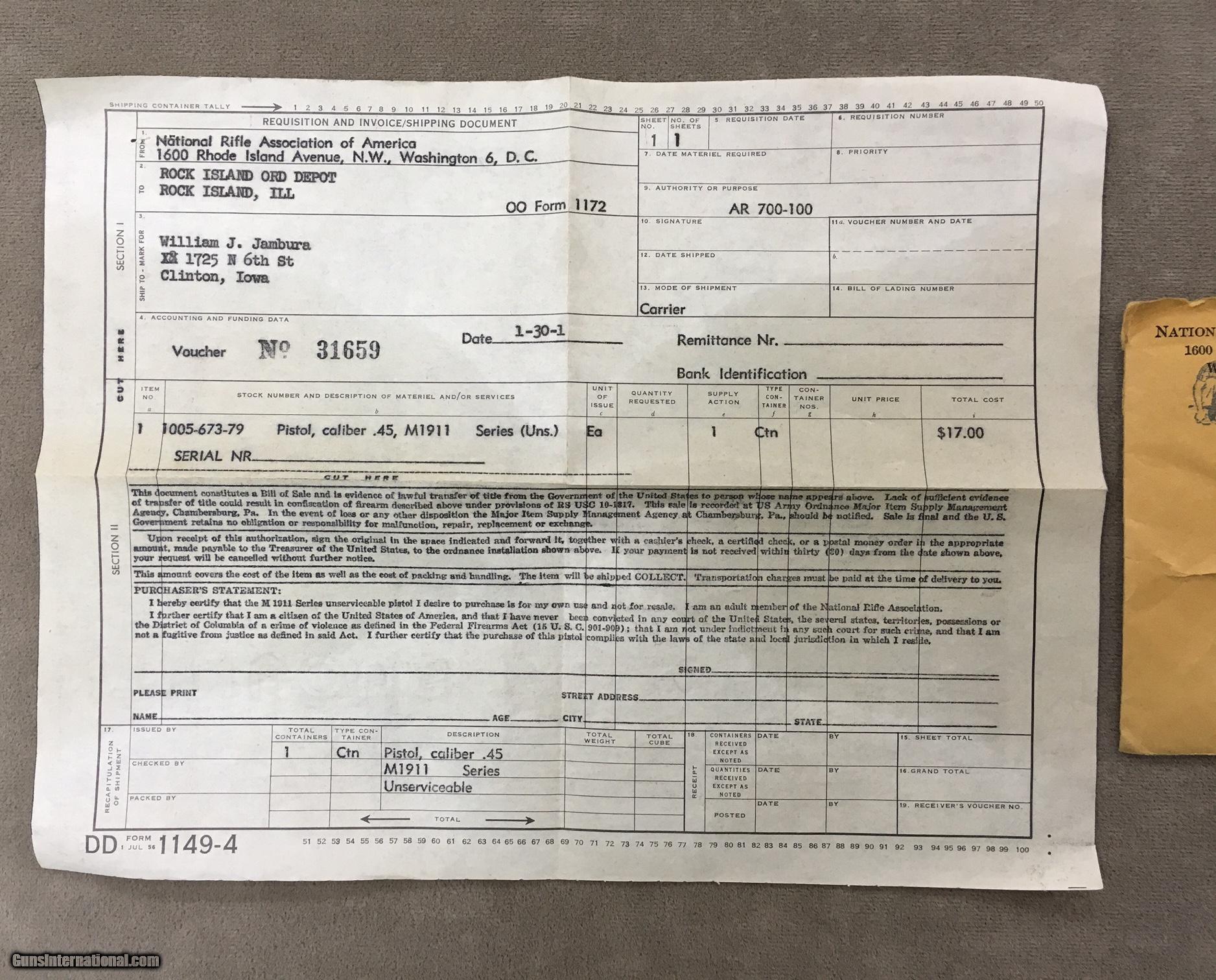 Description: This .45 Auto was purchased from the DCM in Feb of 1961. Pistol was shipped from Rock Island Ordnance Depot to the DCM Purchaser. This is an original Ogden Arsenal rework WWII reissue .45 auto and so marked on right side of frame (OG). Pistol appears to be all original and untouched since leaving depot, and all in excellent overall condition. Bore & chamber are perfect. Serial range 107xxx. Even has original magazine (L Code) Little Manufacturing which is also in excellent original condition. Barrel is the correct Hi Standard and so marked. If you want a nice GI .45 auto of WWII issue then this is it. We would rate original parkerizing finish at 96-97% overall with only a bit of wear on the high spots (see photos). We have the original NRA Voucher for the pistol, along with the Ordnance Depot Bill of Lading, showing the price was $14.15 Unit Cost with Postage & Handling of $2.85 for a total price of $17.00. All original documentation goes with the pistol. SOLD Curio/Relic: Yes |