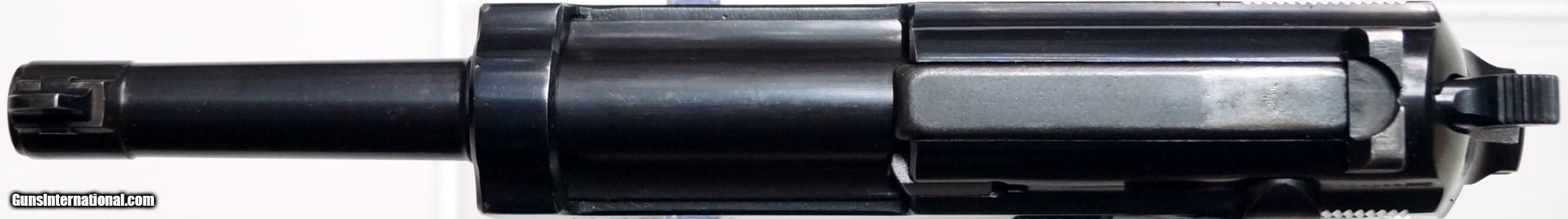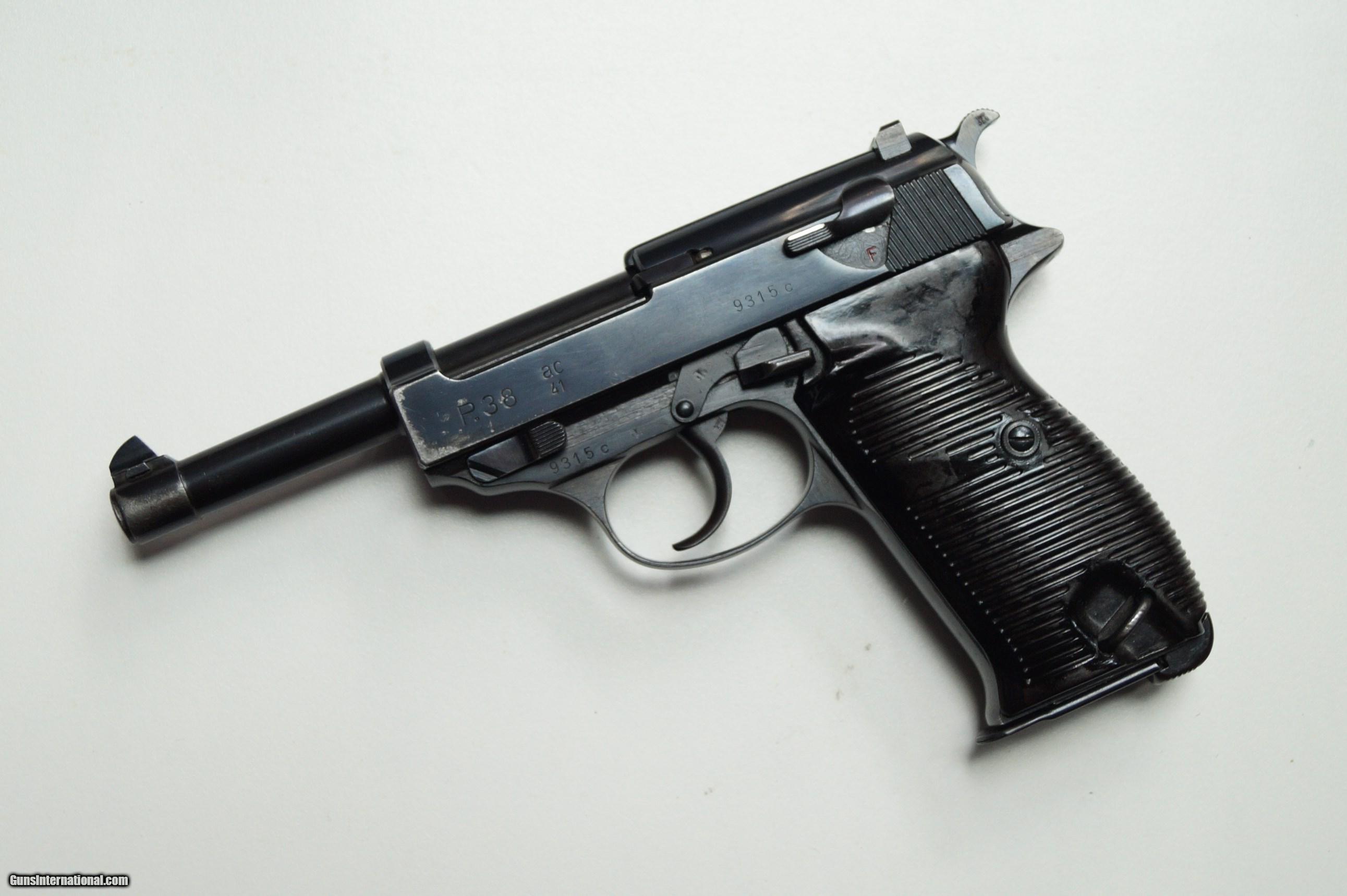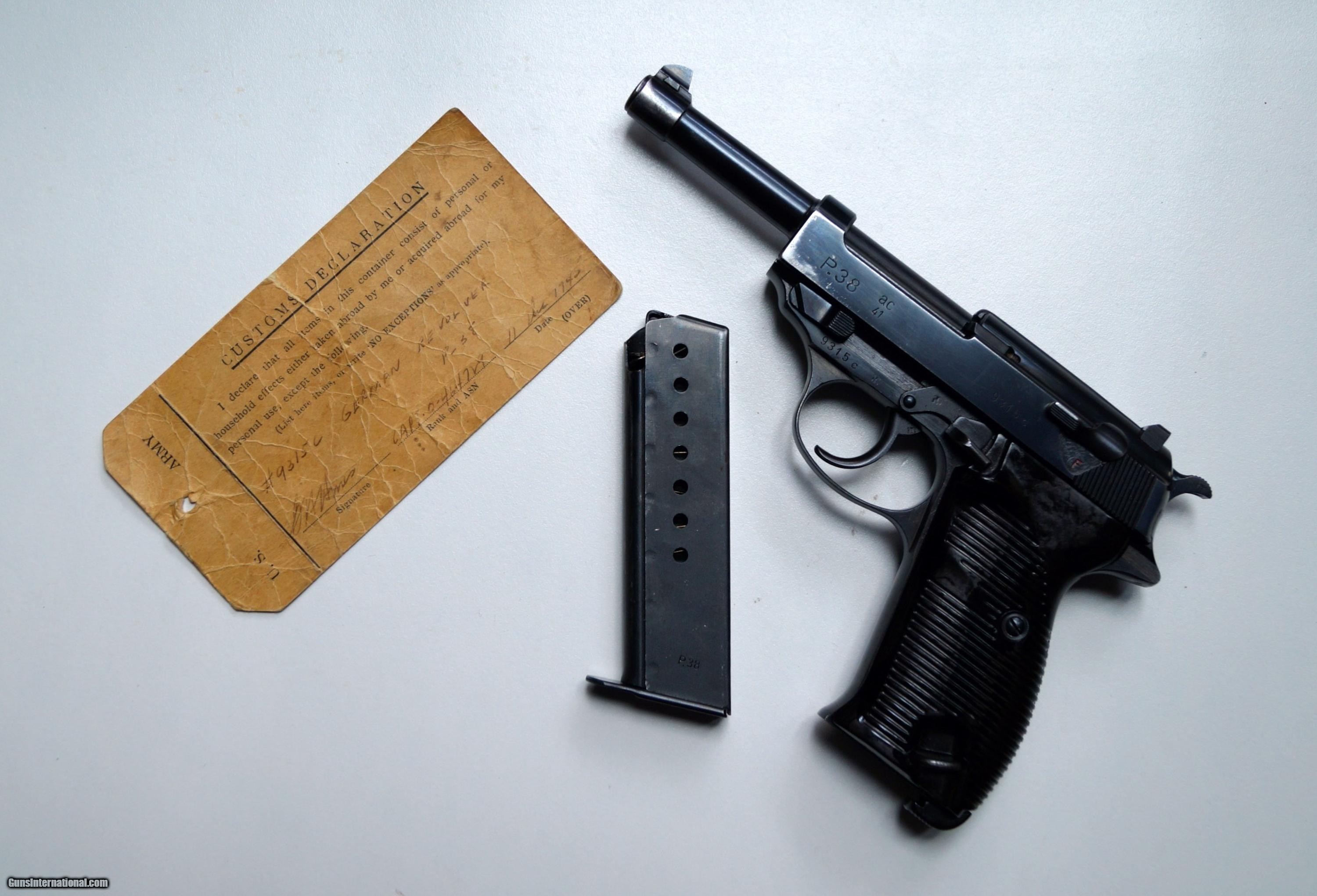 Description: THIS IS A P 38 AC (WALTHER) NAZI PISTOL, 9MM. THE PISTOL IS IN VERY GOOD CONDITION, ALL ORIGINAL, NUMBER MATCHING, VERY GOOD BORE AND GRIPS (GRIPS ARE ORIGINAL AND NAZI MARKED), MECHANICALLY CORRECT AND TIGHT. A VERY NICE RARER WWII NAZI P 38. NOTE: THIS P 38 IS THE 2ND VARIATION AND WAS THE LAST MILITARY P 38 TO BE MADE WITH A HIGH POLISH FINISH. THE ORIGINAL MAGAZINE IS NUMBERED TO THE GUN. ORIGINAL WWII BRING BACK PAPERS ALSO COME WITH THE PISTOL. THESE ARE VERY RARE TO FIND ANYMORE. SOLD Curio/Relic: Yes |