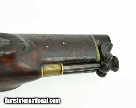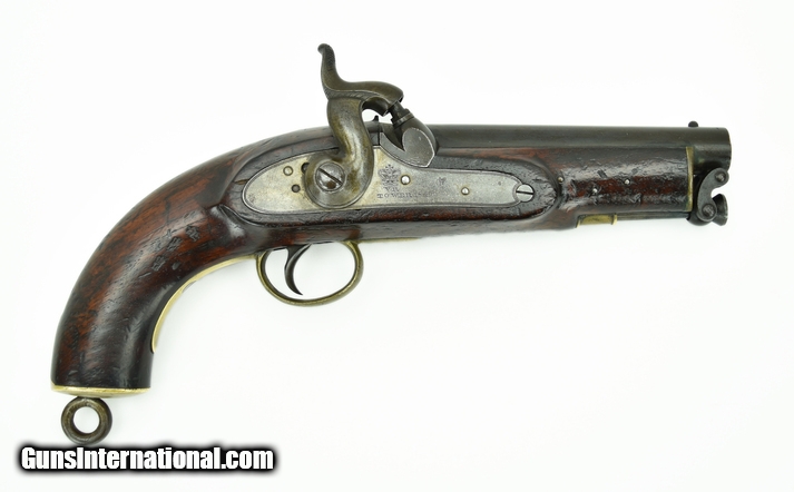 British Model 1840 Sea Service pistol with bolt hook. Bore is .58 cal. Lock marked crown VR 1844, designed by George Lovell. Gun has a captive ramrod. Stock has several inspection marks and the board of ordnance marked.