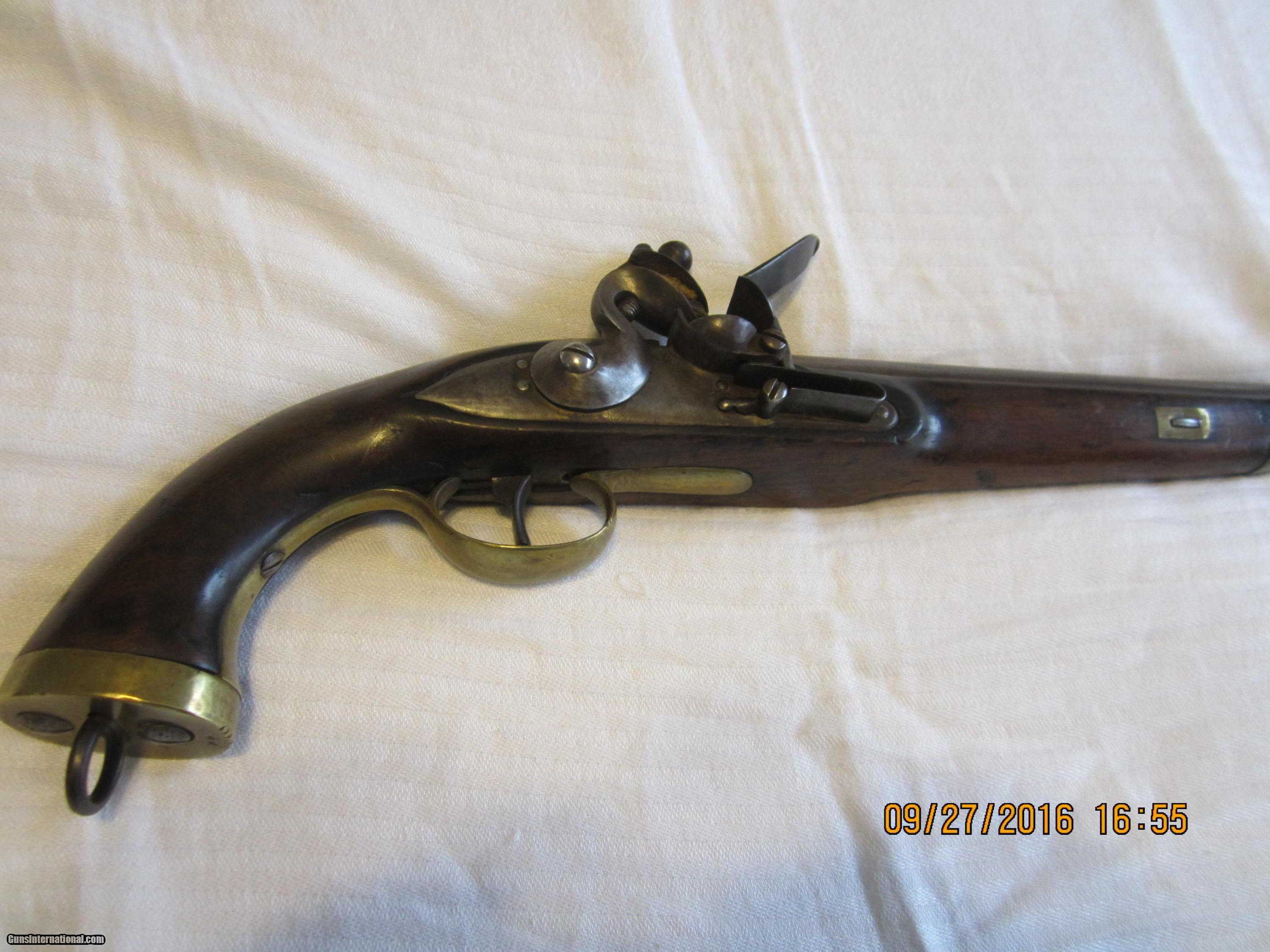 Description: A nice example of a Belgian Naval Flintlock pistol. The top of th barrel is marked "Belgium" and there are two proof marks, a "W" under a Crown on the lock, and a"B" under a Crown on the barrel. The top of the barrel is stamped "BELGIUM". The barrel is 9" long, .70 caliber and the overall length is 15 & 1/2". The barrel retains a good amount of its original brown finish. The lock and hammer appear to have been left as bright metal. The trigger guard, barrel end and butt cap are brass. All metal is in very good condition. The lanyard ring looks original. The full walnut stock is also in good condition with a number of mostly minor dings and mostly on the left side ( this pistol saw some action). There are no splits or cracks or wood missing in the stock. The action is very strong and the hammer holds on full and half cock. Made circa 1813. Flintlocks have been rapidly increasing in value. This is an antique so no FFL is required. It can be sent directly to a new proud owner. SOLD Antique: Yes Manufacturer: Unknown- Made in Belgium Model: Naval Service Flintlock Pistol Serial Number: none Caliber Info: .70 Condition: Very Good + Metal Condition: Very Good Wood Condition: Very Good Bore Condition: Good Barrels: one Barrel Type: round Action: Flintlock Triggers: one Stock: Full- Walnut Finish: Brown/Brass Sights: none Manufacture Date: circa 1813 Engraving: none Item Location: California-San Diego |
