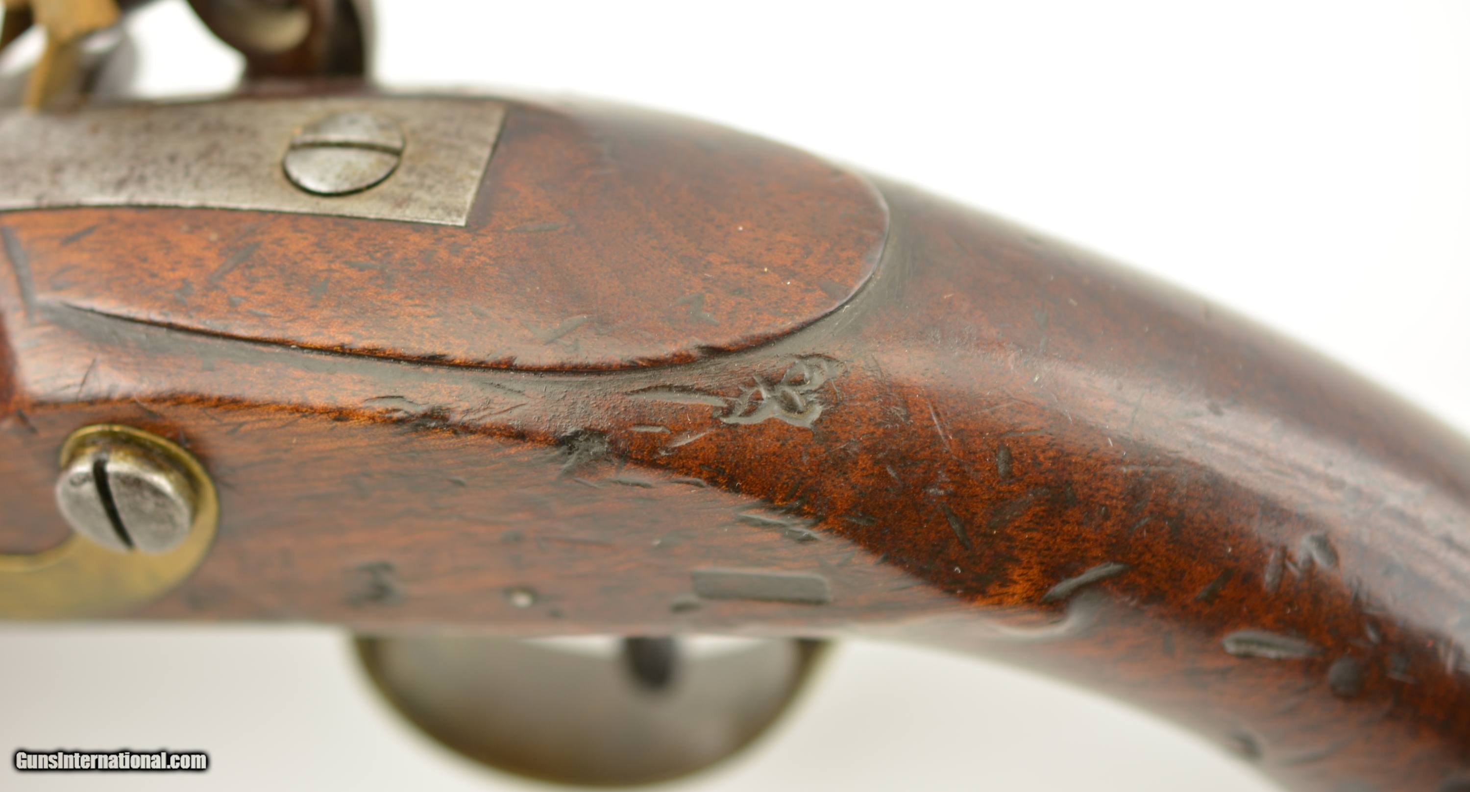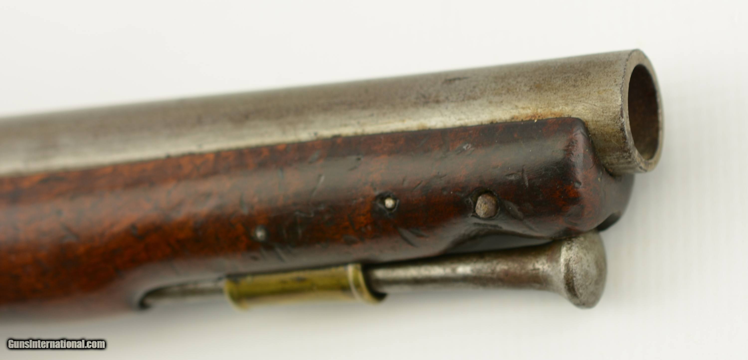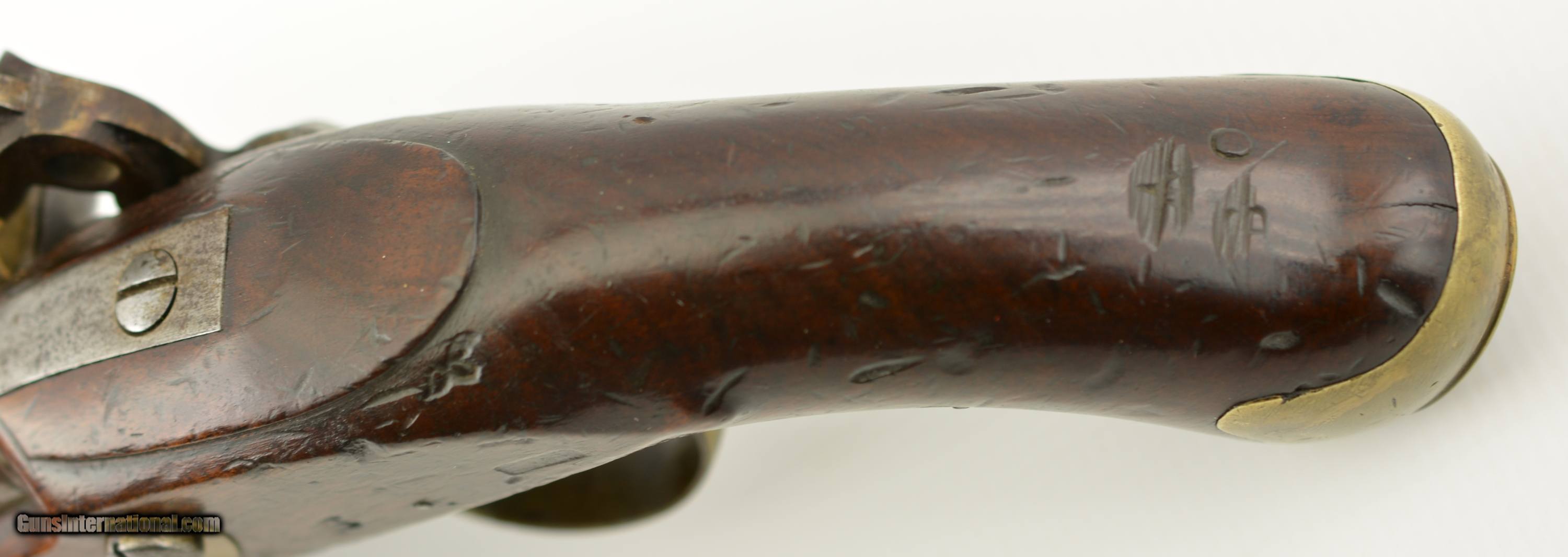 Description: NSN, .65 Caliber, 9" barrel with a fine, lightly freckled bore. This is a handsome pistol that has an overall pewter gray patina with dark brown freckling along the barrel, and further plum-brown freckling on the cock and frizzen. The lock is marked “(Crown) / GR" with “TOWER" at the rear, and has a matching gray-brown patina. The walnut stock has numerous small handling marks and blemishes, as well as purposefully defaced Broad Arrow and “BO" markings on the heel of the grip. The brass furniture has a mild ochre tarnish, and there are some parallel scratch marks on the exterior of the trigger guard bow. The pistol originally had a brass-tipped wooden ramrod, however a late pattern metal rod (with Crown stamp) is included instead. The rod is shortened at the base, and no longer has the bullet worm. This is a very nice example of a 1799 Pattern Light Dragoon pistol, and rates fine condition overall. Antique SOLD Antique: Yes Manufacturer: British Model: Dragoon Caliber Info: .65 Gauge Info: .65 |