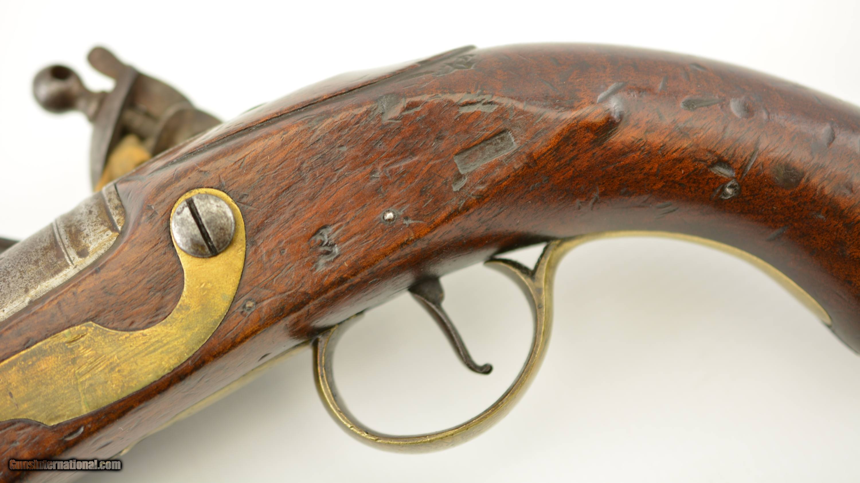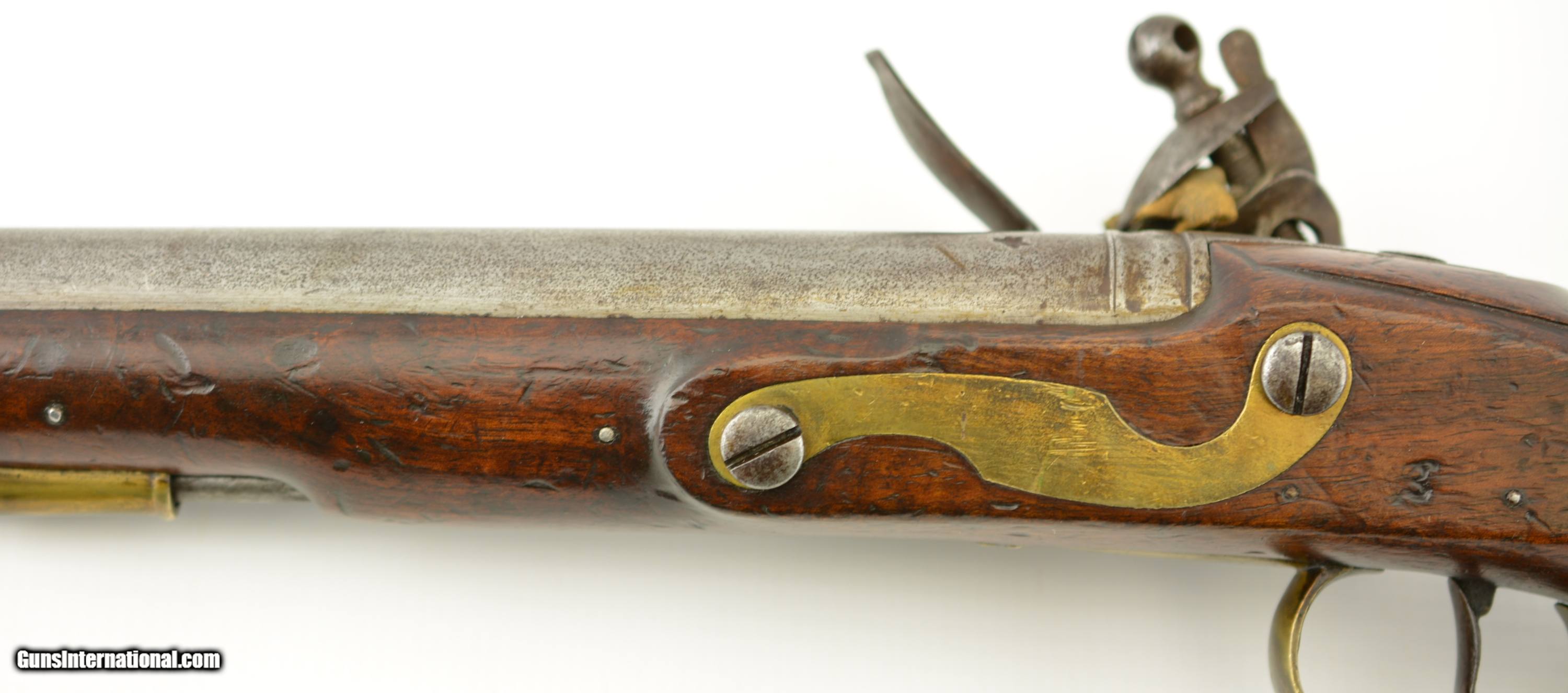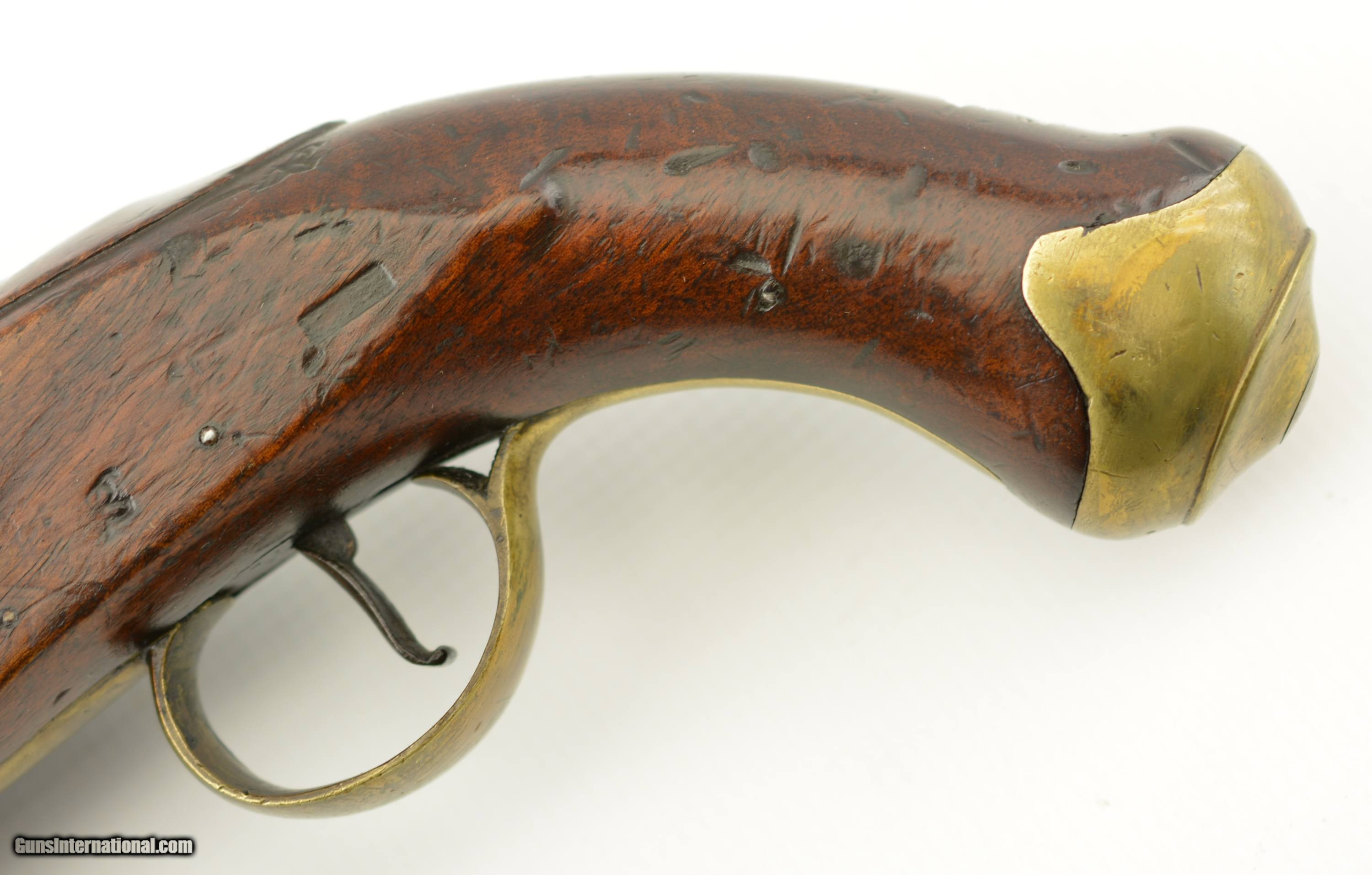 Description: NSN, .65 Caliber, 9" barrel with a fine, lightly freckled bore. This is a handsome pistol that has an overall pewter gray patina with dark brown freckling along the barrel, and further plum-brown freckling on the cock and frizzen. The lock is marked “(Crown) / GR" with “TOWER" at the rear, and has a matching gray-brown patina. The walnut stock has numerous small handling marks and blemishes, as well as purposefully defaced Broad Arrow and “BO" markings on the heel of the grip. The brass furniture has a mild ochre tarnish, and there are some parallel scratch marks on the exterior of the trigger guard bow. The pistol originally had a brass-tipped wooden ramrod, however a late pattern metal rod (with Crown stamp) is included instead. The rod is shortened at the base, and no longer has the bullet worm. This is a very nice example of a 1799 Pattern Light Dragoon pistol, and rates fine condition overall. Antique SOLD Antique: Yes Manufacturer: British Model: Dragoon Caliber Info: .65 Gauge Info: .65 |