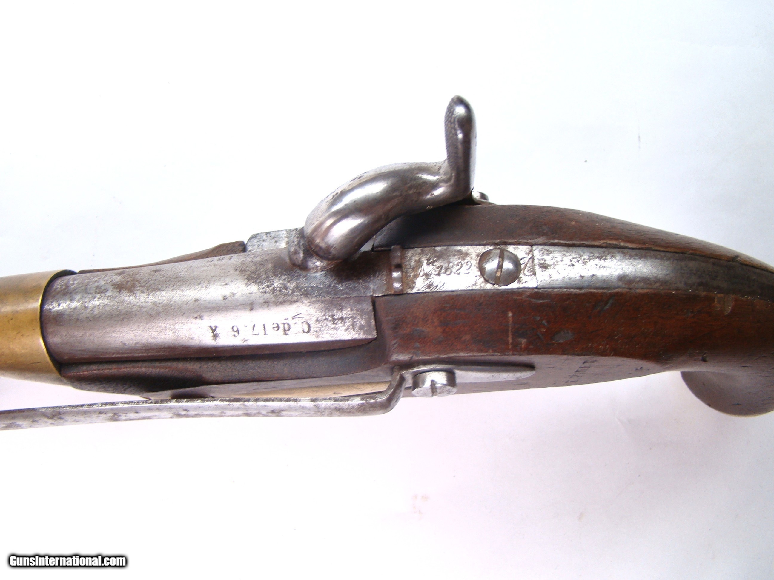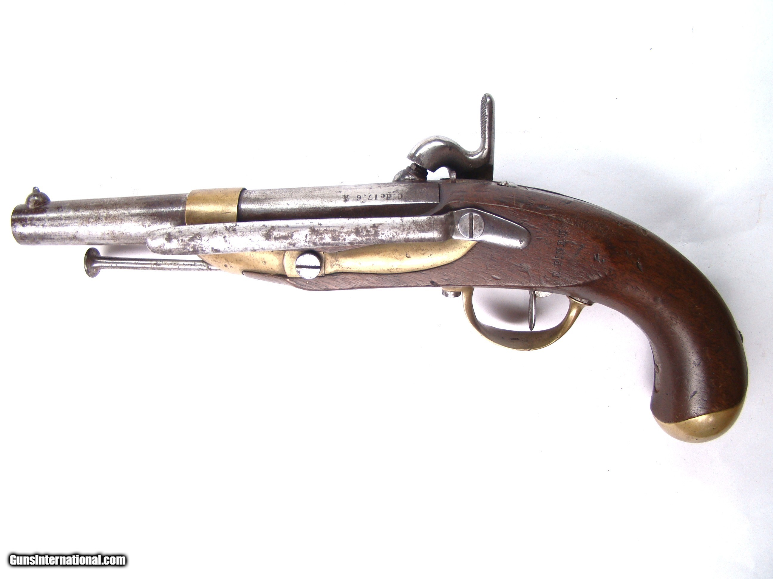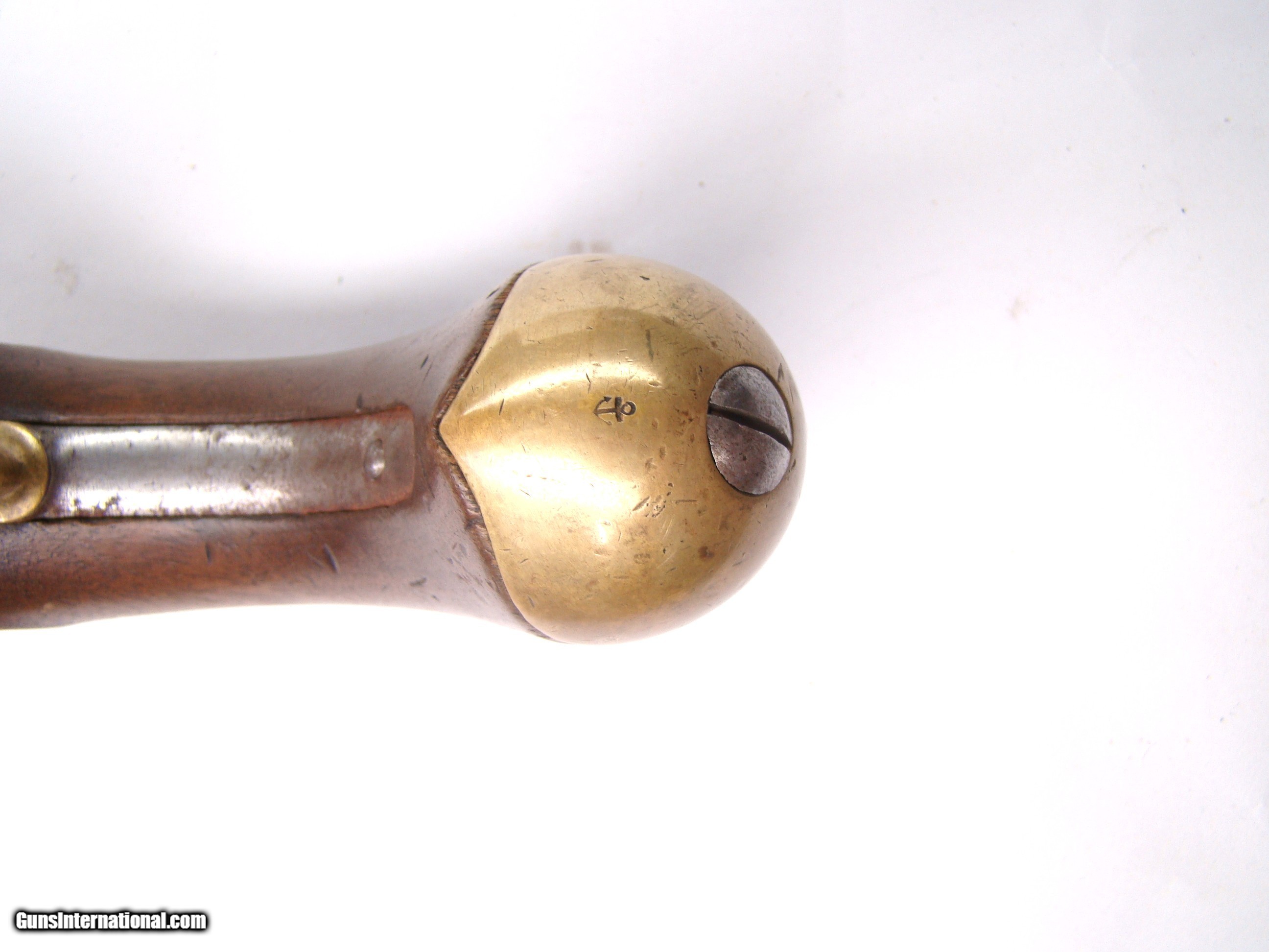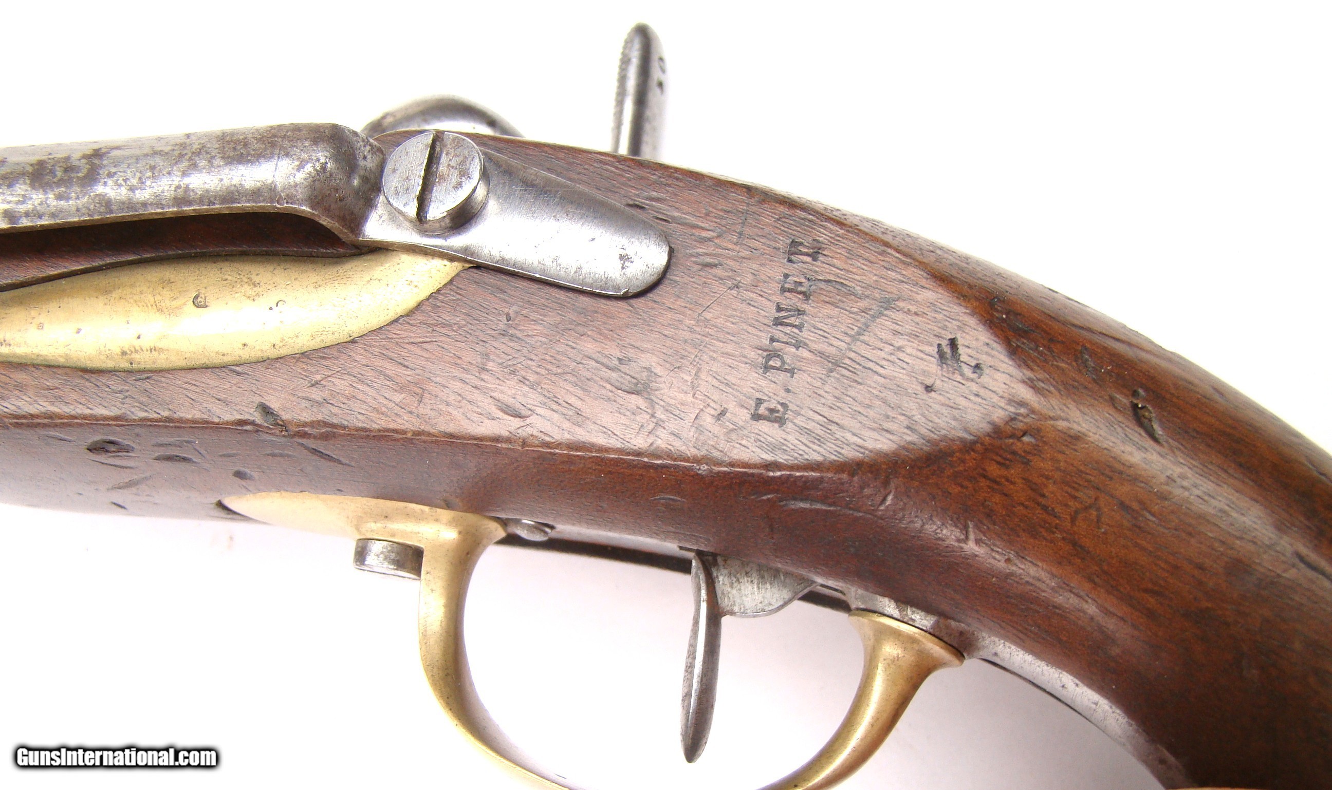 Description: French Naval Percussion Pistol with belt hook conversion from flint 1822 dated Mech Exc, Wood is near Exc has a couple small dings. .Has a 72 cal rifled bore Exc ,8” long with original sights and marked 1822 in a couple places. The lockplate has markings M R and St Etienne. The left side has the belt hook. The wood is near exc with E.Pinet marked on the left side. There is a anchor marking on the brass buttcap and several other proofs. Has an original ramrod. Metal overall has an aged grey brown patina finish with traces of some very fine pitting mainly on the ramrod. The barrel ,endcap and wood are stamped 50 . Antique: Yes Price: $995.00 Contact Seller |