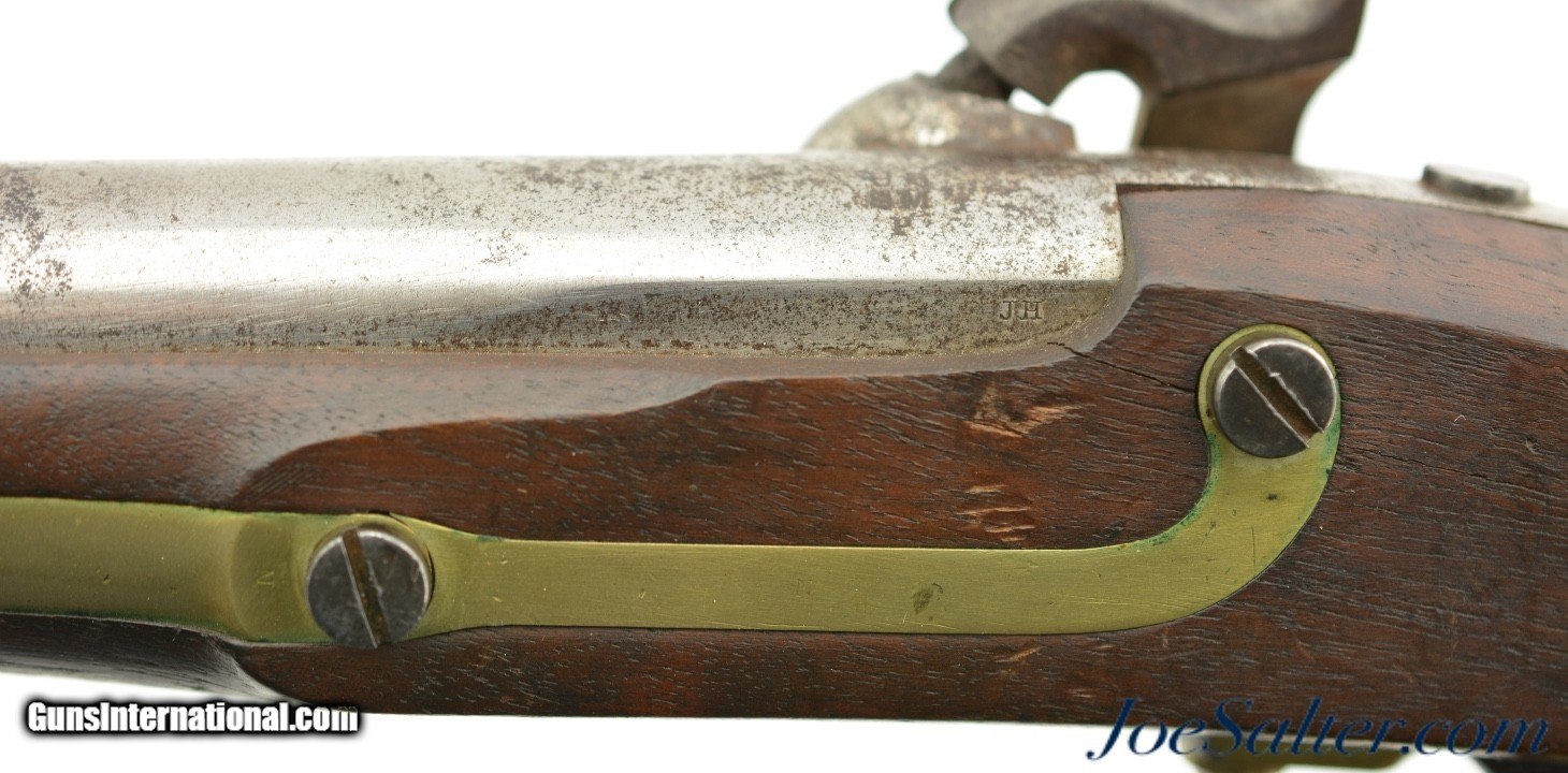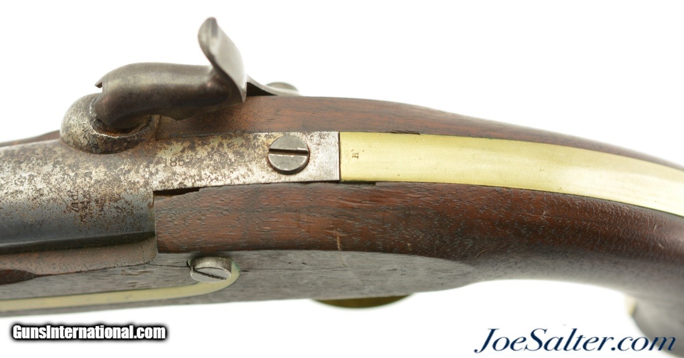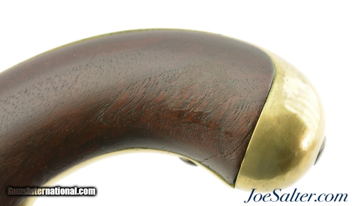 Description: This is a Henry Aston & Co. Model 1842 percussion .54 caliber pistol with an 8.5 inch barrel has an oxidized bore with spots of roughness manufactured in 1852. It is marked on the lock plate "US / H. ASTON & CO." and "MIDDtn / CONN / 1852" behind the hammer. This was part of production run from 1851-1852 of approximately 6000 total pieces and is Massachusetts "M.S." marked above the standard inspector and proof marks. In very fine to near excellent antique condition the well marked pistol has aged to a very even brown on the hammer and lock plate with crisp clear markings. The barrel has a mostly bright finish with areas of pitting toward the action and scattered carbon staining and is marked "M.S." in a slightly larger font above the standard "US / SM / P" proof and inspector marks with "1852" opposite the hammer and "JH" on the flat near the stock. The brass furniture has a bright appearance with visible "N" and "H" inspection marks. The pivoting ramrod has a slight bend but functions properly and is mostly plum-brown. The stock has several repaired and now stable cracks with the inspector cartouche just visible above the trigger. The action holds at half and full cock with a strong spring. A very fine / near excellent example of a Massachusetts marked Aston pistol that may have seen use in the Civil War. Antique Antique: Yes Price: $895.00 Contact Seller |
