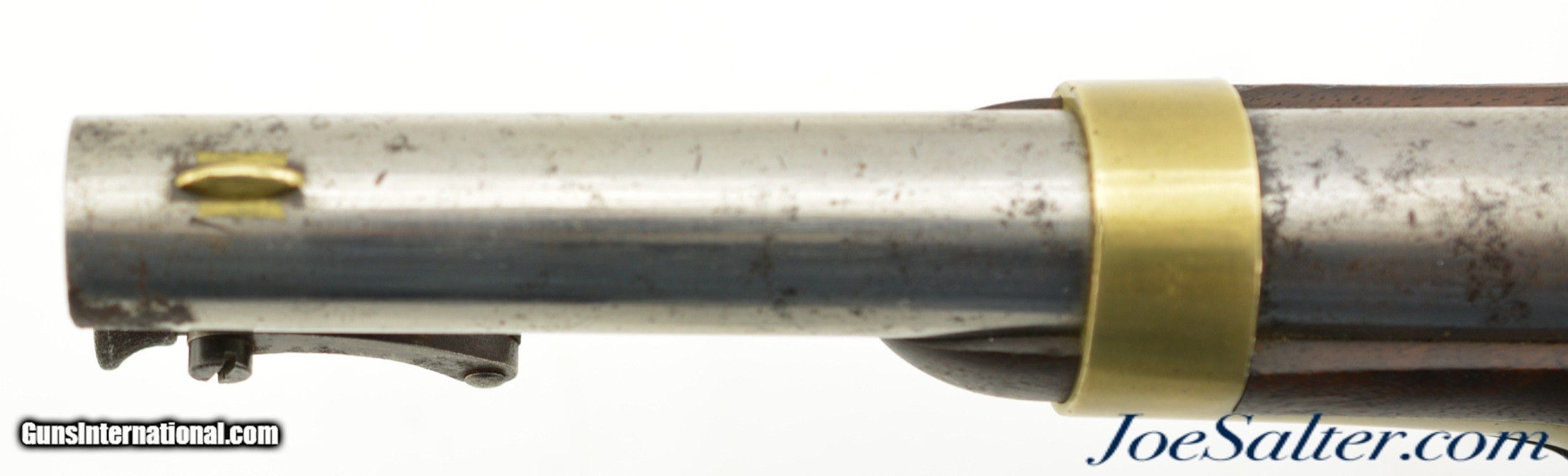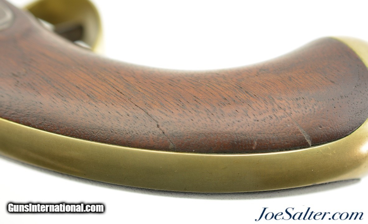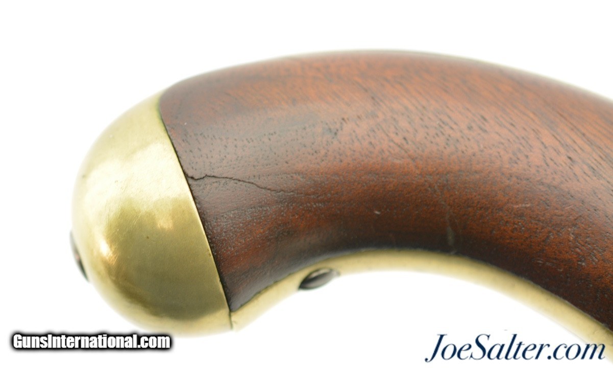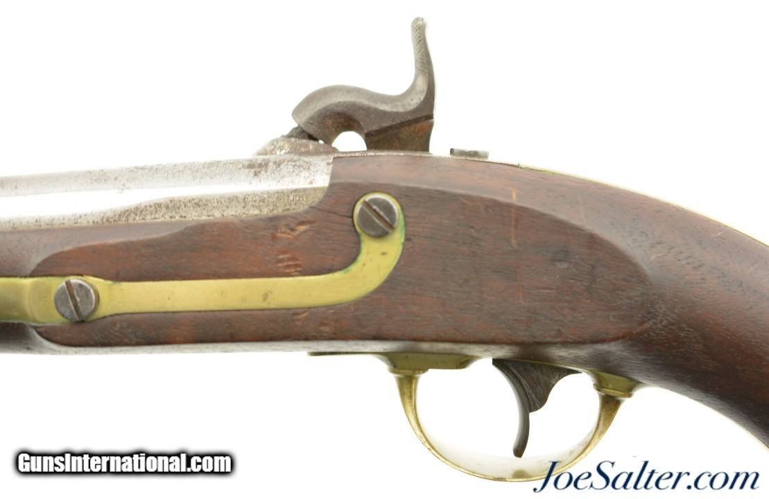 Description: This is a Henry Aston & Co. Model 1842 percussion .54 caliber pistol with an 8.5 inch barrel has an oxidized bore with spots of roughness manufactured in 1852. It is marked on the lock plate "US / H. ASTON & CO." and "MIDDtn / CONN / 1852" behind the hammer. This was part of production run from 1851-1852 of approximately 6000 total pieces and is Massachusetts "M.S." marked above the standard inspector and proof marks. In very fine to near excellent antique condition the well marked pistol has aged to a very even brown on the hammer and lock plate with crisp clear markings. The barrel has a mostly bright finish with areas of pitting toward the action and scattered carbon staining and is marked "M.S." in a slightly larger font above the standard "US / SM / P" proof and inspector marks with "1852" opposite the hammer and "JH" on the flat near the stock. The brass furniture has a bright appearance with visible "N" and "H" inspection marks. The pivoting ramrod has a slight bend but functions properly and is mostly plum-brown. The stock has several repaired and now stable cracks with the inspector cartouche just visible above the trigger. The action holds at half and full cock with a strong spring. A very fine / near excellent example of a Massachusetts marked Aston pistol that may have seen use in the Civil War. Antique Antique: Yes Price: $895.00 Contact Seller |