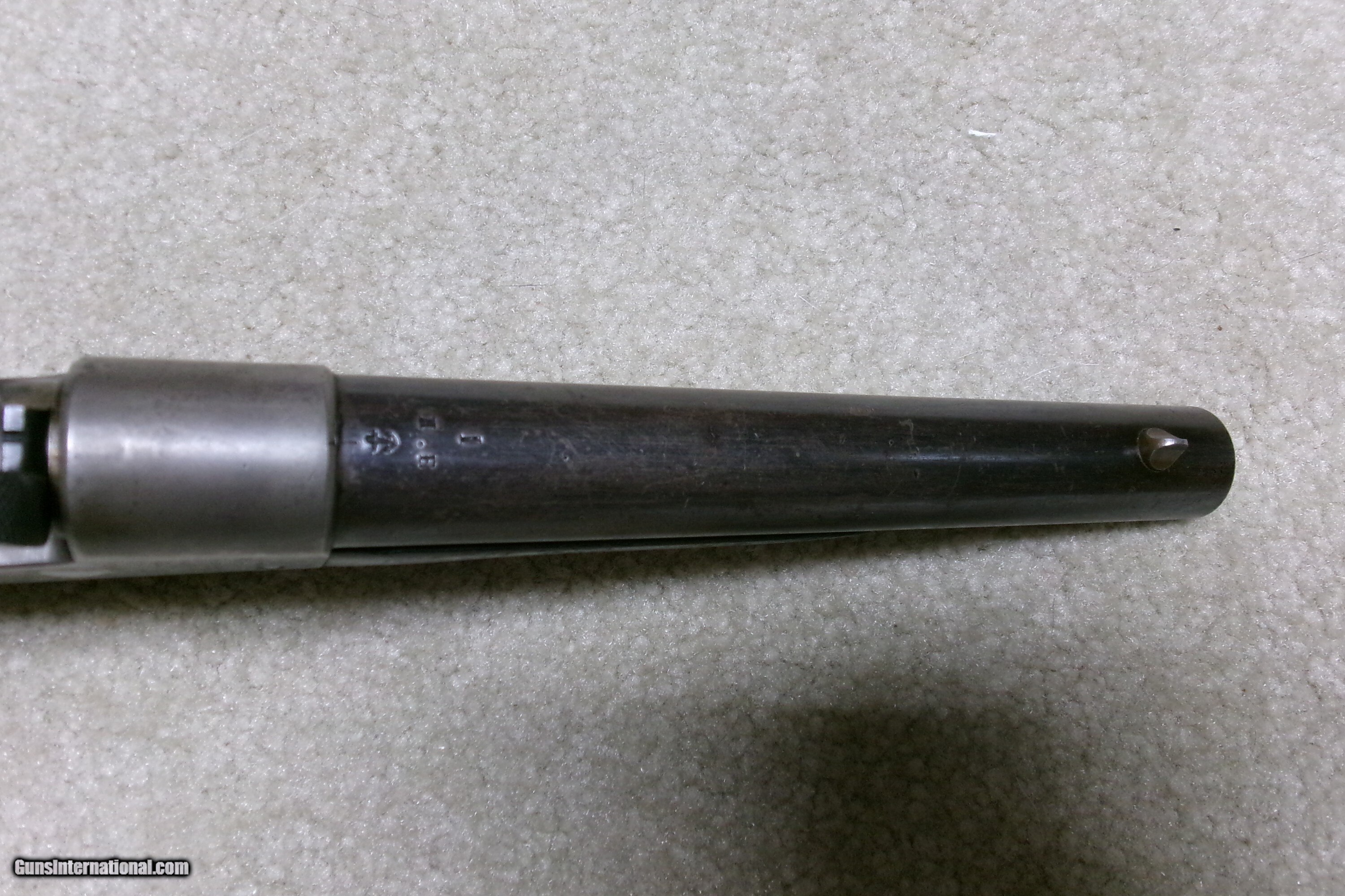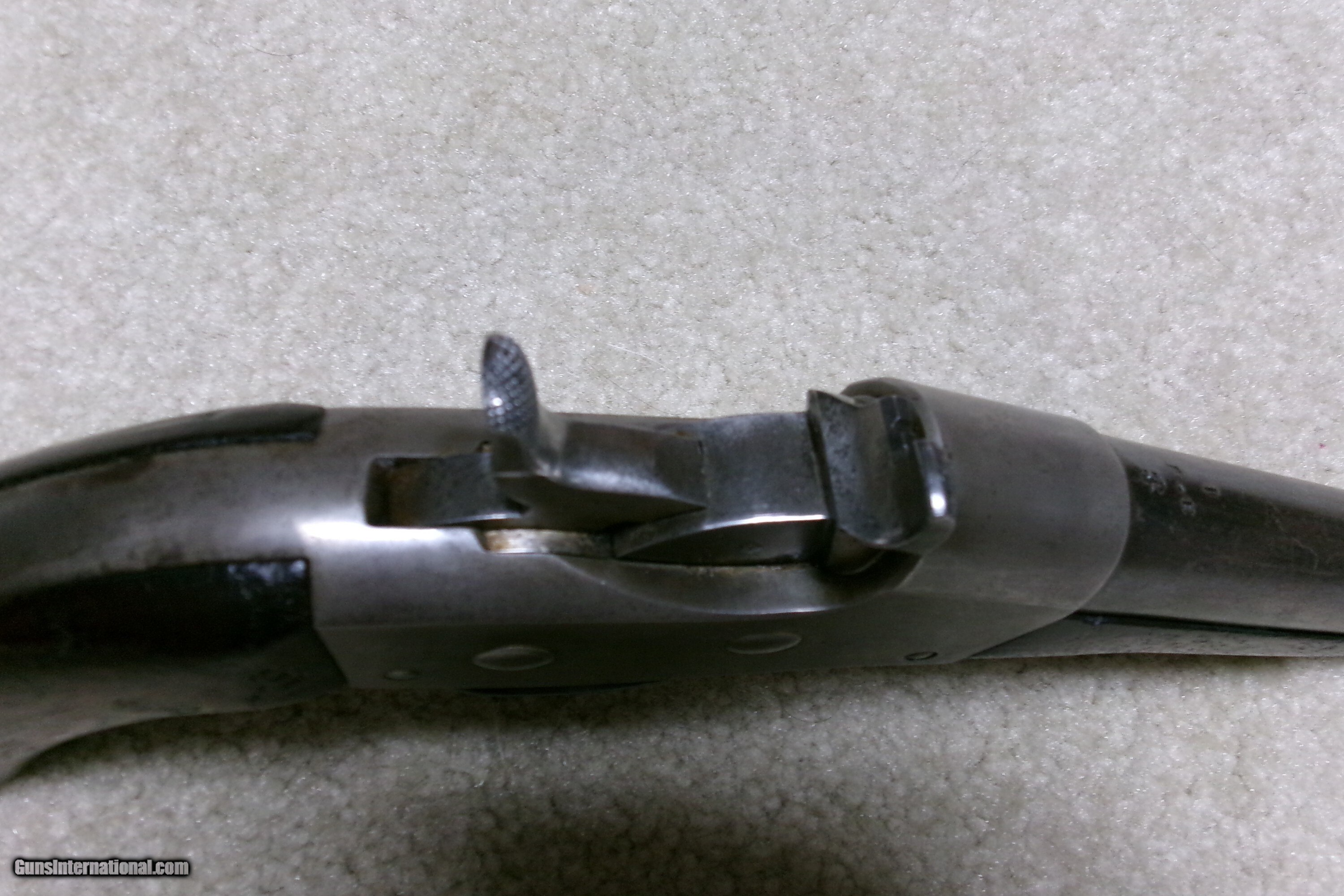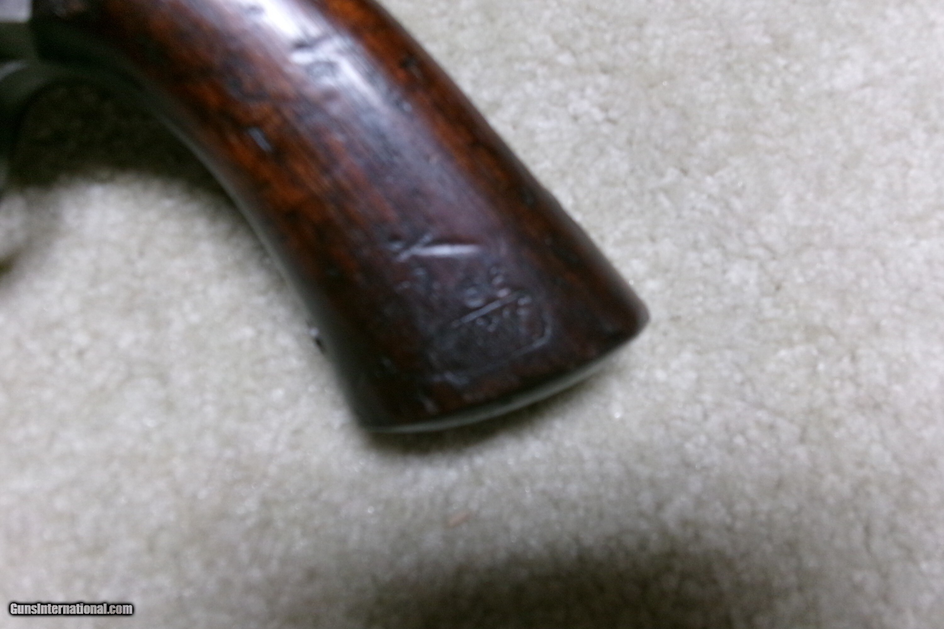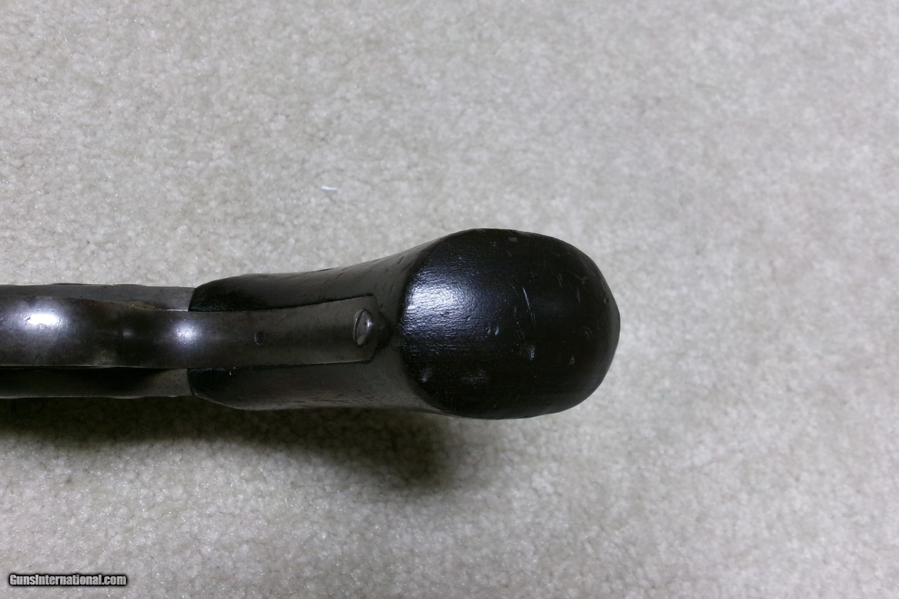 Description: REMINGTON U. S. NAVY MODEL 1867 ROLLING BLOCK PISTOL, #3XXX, .50 CENTER FIRE, MADE EARLY 1870s. A very scarce pistol as these were actually an alteration of the earlier Model 1865 model that was in .50 Rim Fire and had a sheath trigger (spur trigger). Only about 6500 of the Model 1865 were made. Many, but certainly not all, were altered to the 1867 model, like this one which makes the unaltered earlier Model extremely rare and this one also very scarce as so few were made in total. This is a particularly fine example that still retains some very light and cloudy case color on the receiver sides and protected areas with the balance an uncleaned mottled gray. The barrel retains fine only lightly thinning original deep blue. The forend is excellent. The grips show some handling marks and retain the correct cartouche in the left bottom side along with a couple of faint rack numbers. The hammer and breech block also retain some of the “straw” case hardening. The top rear of the barrel has the correct anchor and inspector marks “I” over “H. E.” and the right bottom of the frame has the correct “P” over “F. C. W.” stamping along with the Remington address and patent dates ending in 1866 on the bottom left side. Rifled bore is bright and excellent. This is a very fine unaltered example of an extremely scarce U. S. N. pistol that does not show up for sale often. Antique: Yes Handgun Caliber: .50 Manufacturer: REMINGTON Model: 1867 NAVY PISTOL Serial Number: 3XXX Barrel Length: 7 Condition: FINE+ Bore Condition: EXCELLENT Price: $2,250.00 Contact Seller |