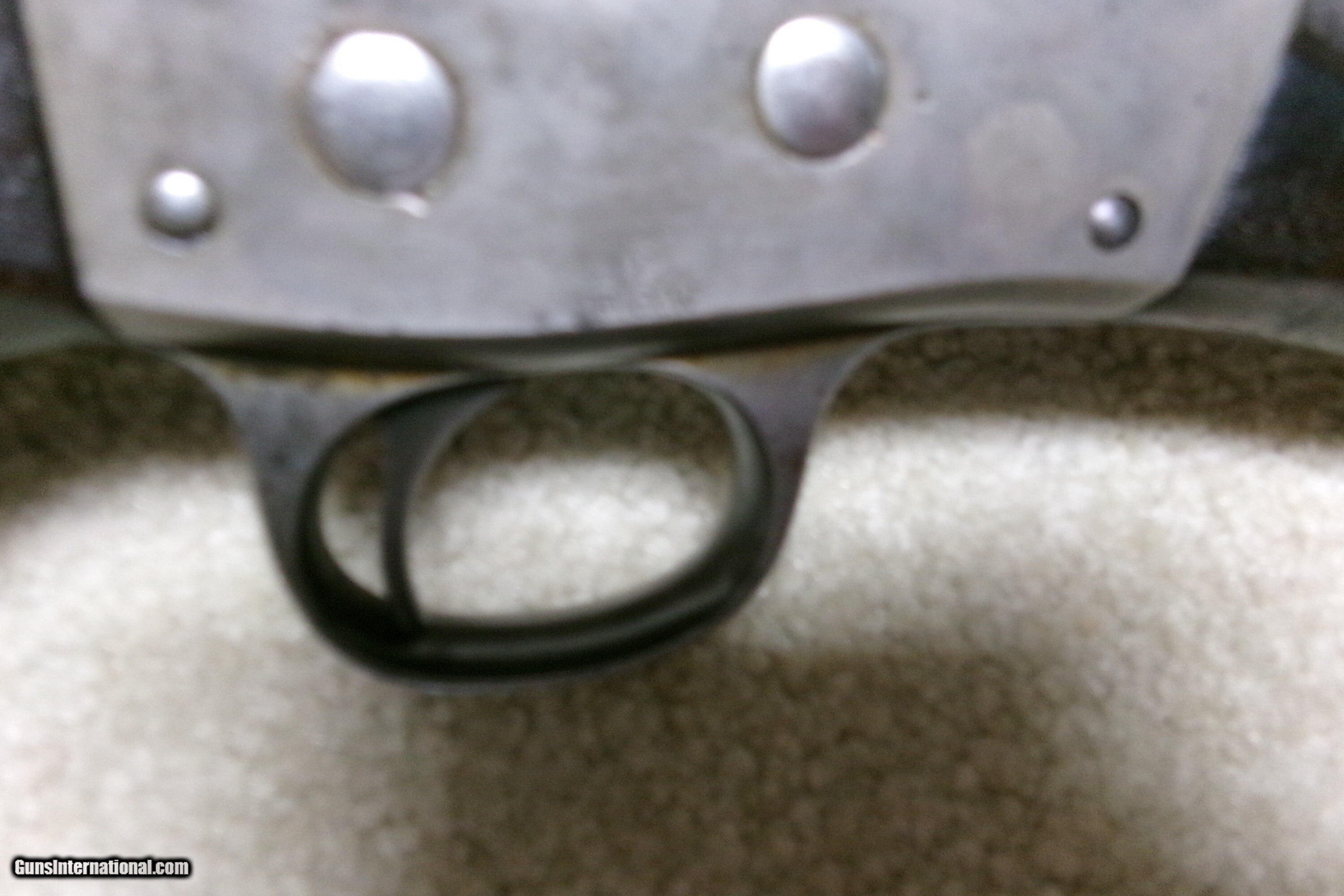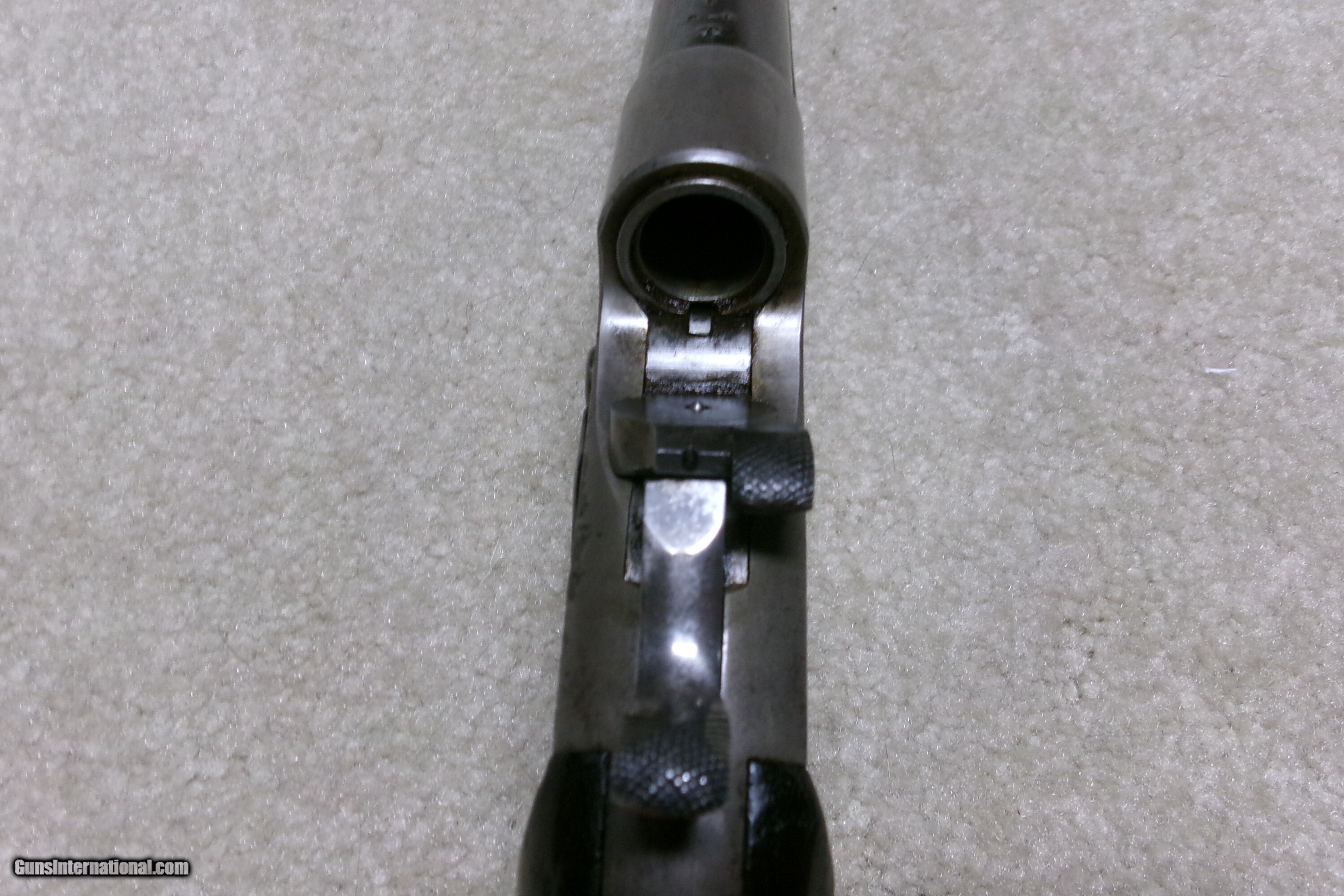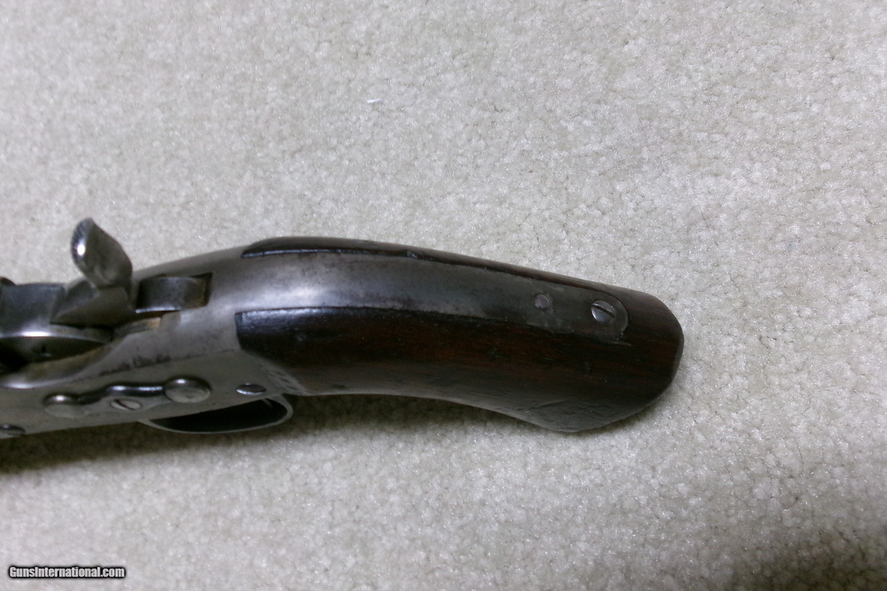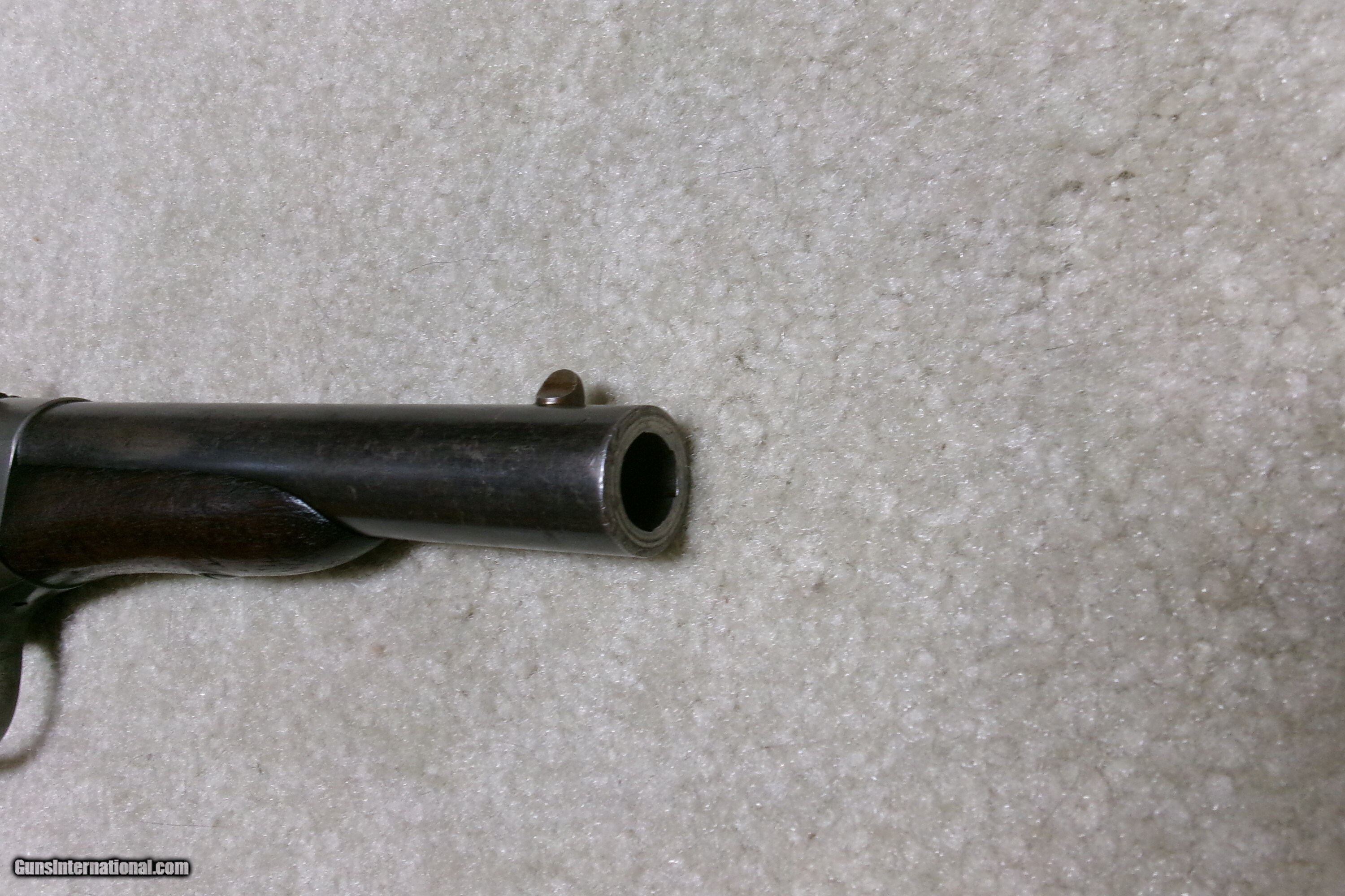 Description: REMINGTON U. S. NAVY MODEL 1867 ROLLING BLOCK PISTOL, #3XXX, .50 CENTER FIRE, MADE EARLY 1870s. A very scarce pistol as these were actually an alteration of the earlier Model 1865 model that was in .50 Rim Fire and had a sheath trigger (spur trigger). Only about 6500 of the Model 1865 were made. Many, but certainly not all, were altered to the 1867 model, like this one which makes the unaltered earlier Model extremely rare and this one also very scarce as so few were made in total. This is a particularly fine example that still retains some very light and cloudy case color on the receiver sides and protected areas with the balance an uncleaned mottled gray. The barrel retains fine only lightly thinning original deep blue. The forend is excellent. The grips show some handling marks and retain the correct cartouche in the left bottom side along with a couple of faint rack numbers. The hammer and breech block also retain some of the “straw” case hardening. The top rear of the barrel has the correct anchor and inspector marks “I” over “H. E.” and the right bottom of the frame has the correct “P” over “F. C. W.” stamping along with the Remington address and patent dates ending in 1866 on the bottom left side. Rifled bore is bright and excellent. This is a very fine unaltered example of an extremely scarce U. S. N. pistol that does not show up for sale often. Antique: Yes Handgun Caliber: .50 Manufacturer: REMINGTON Model: 1867 NAVY PISTOL Serial Number: 3XXX Barrel Length: 7 Condition: FINE+ Bore Condition: EXCELLENT Price: $2,250.00 Contact Seller |