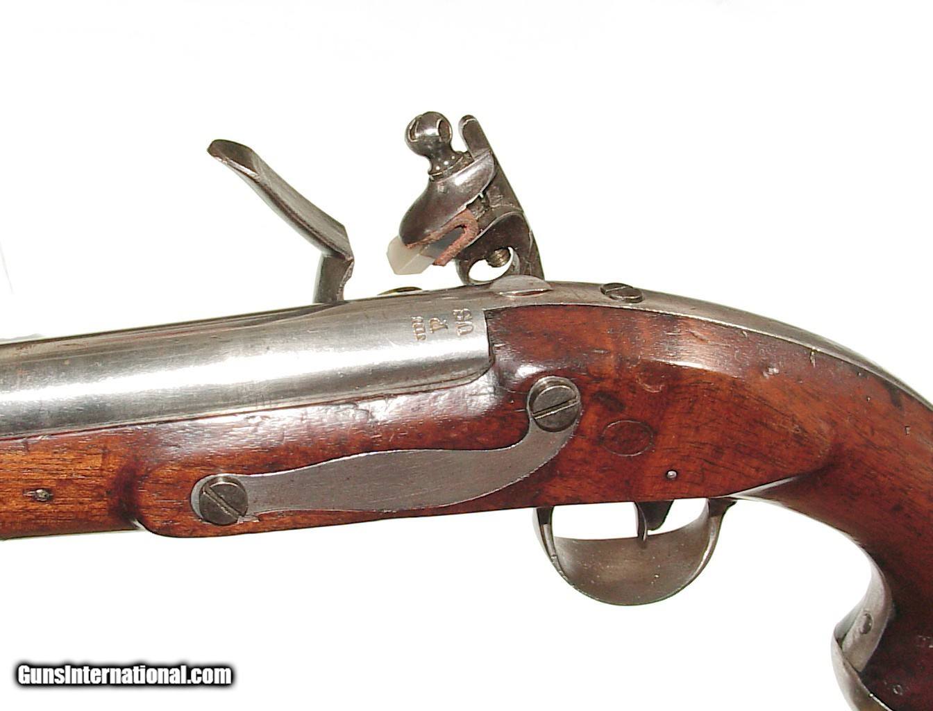 Description: .54 caliber, 10" round barrel with stirrup ramrod located underneath. Original flintlock with lock plate showing excellent crisp stampings and dated "1822". The brass pan showing a mellow patina and the remaining iron mounts appear to have been lightly cleaned. Very fine wood and excellent cartouche. Good bore. Mechanically excellent. SOLD Antique: Yes |