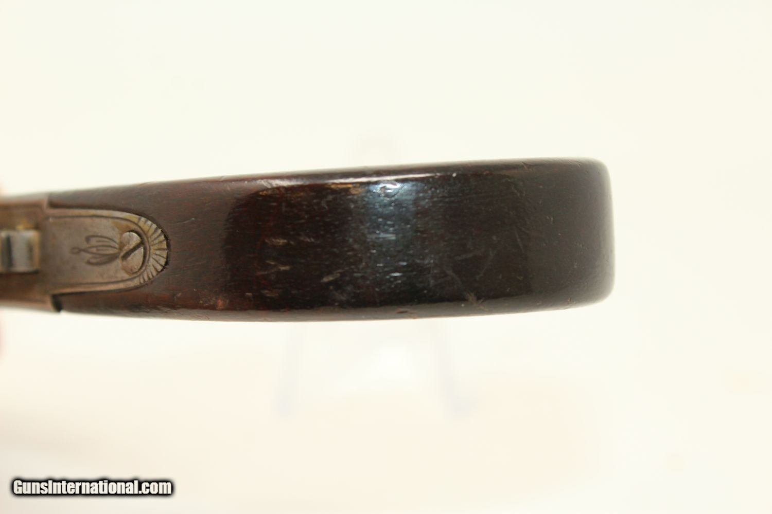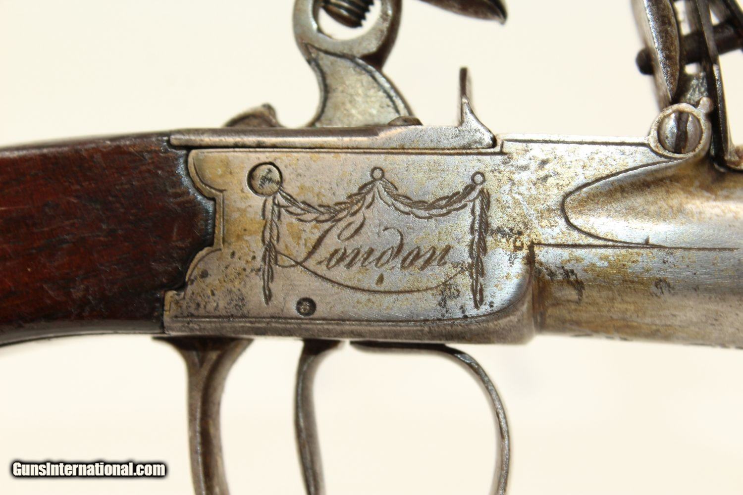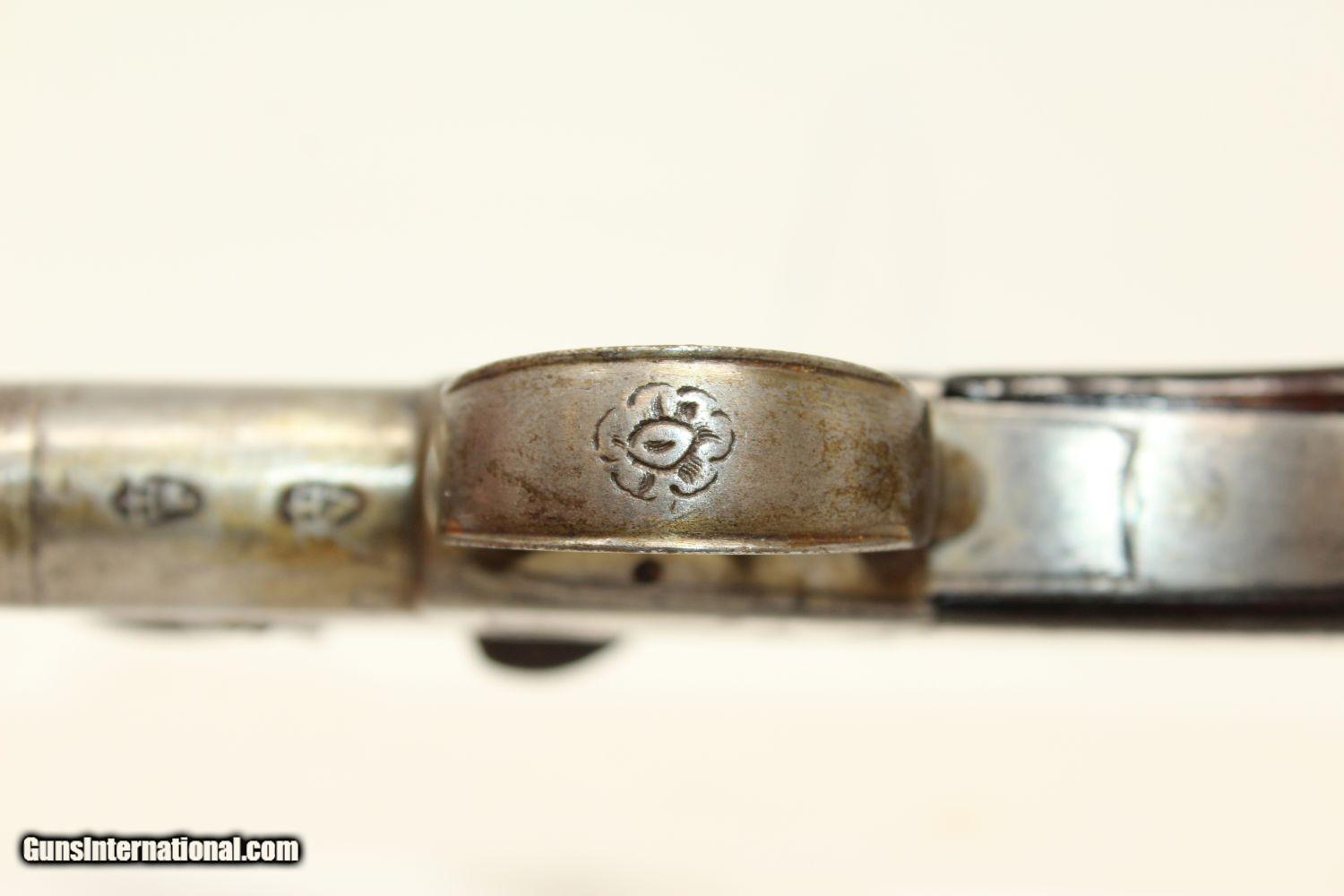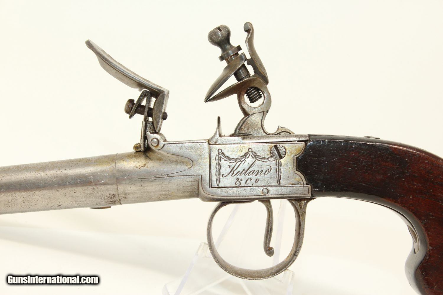Description: WAR of 1812 Period Antique KETLAND Flintlock Pistol Circa 1801 .40 Caliber Single Shot Sidearm! Here we present an antique Ketland & Co. Flintlock Pistol in .40 Caliber, made circa the early 1800s in England. The Ketlands were partnered with Ketland & Co. operated in Birmingham, England, from the late 1700s and to the early 1800s to become one of the most prominent and active British makers of the day. John and Thomas Ketland were the sons of Thomas Ketland and grandsons of William Ketland, who had been making locks and guns for the colonies since the early 18th Century. The left lock plate is marked "KETLAND/& Co". The right side of the lock is marked “LONDON”. The underside of the barrel is stamped with pre-1813 proof marks. The barrel, trigger, lock, barrel tang, hammer, frizzen, pan and spring are all iron. There is a flower engraved on the trigger guard. The barrel turns off so as to be loaded from the breech rather than the muzzle, an easier method and enabling of a better fit for the projectile to the bore. This was very much the predecessor to Henry Deringer’s pistols that would come into their own a few decades later. The overall condition is very good. The iron parts are smooth and show their markings well. The walnut grip is in great shape. The bore is smooth and clean. The action is excellent. Here is a fantastic flintlock pistol from the time of King George III! Own the original! This is a legitimate antique and not a reproduction. Barrel is 2-1/2 inches. Caliber: .40 Overall condition as seen in photos. Very Fast. Very Safe. FREE SHIPPING WORLDWIDE. Delivered directly to your door by express mail! Guaranteed AUTHENTIC & Includes CERTIFICATE OF AUTHENTICITY. ancestryguns $1450 #190416 SOLD Antique: Yes |