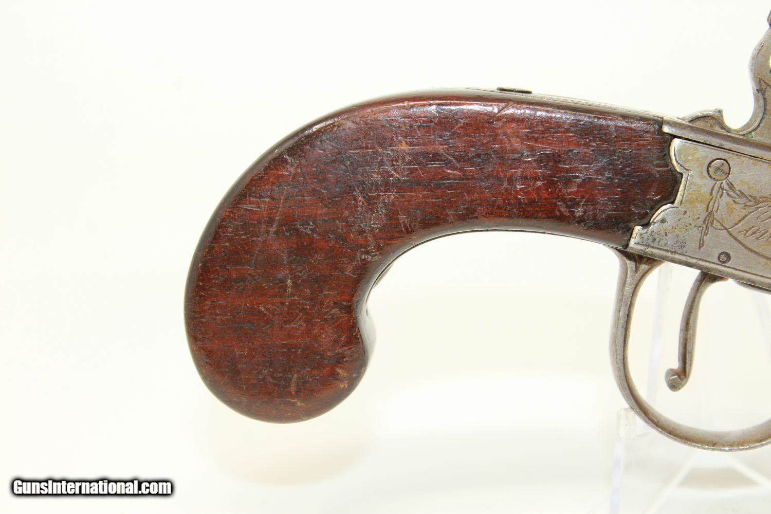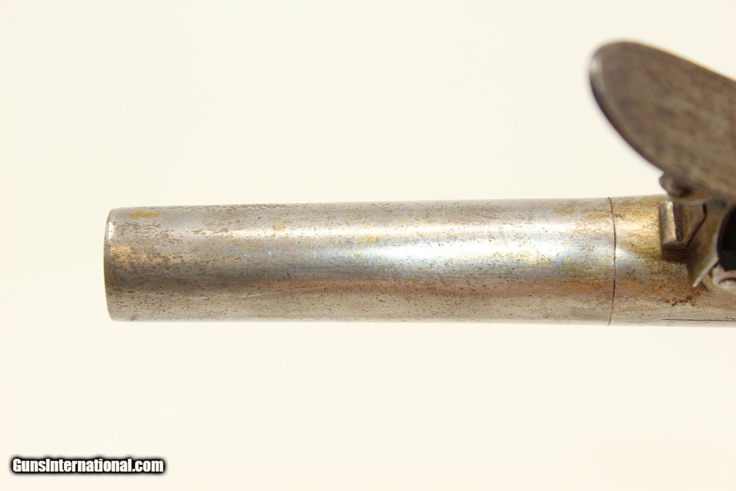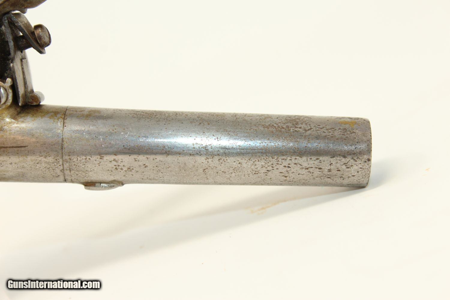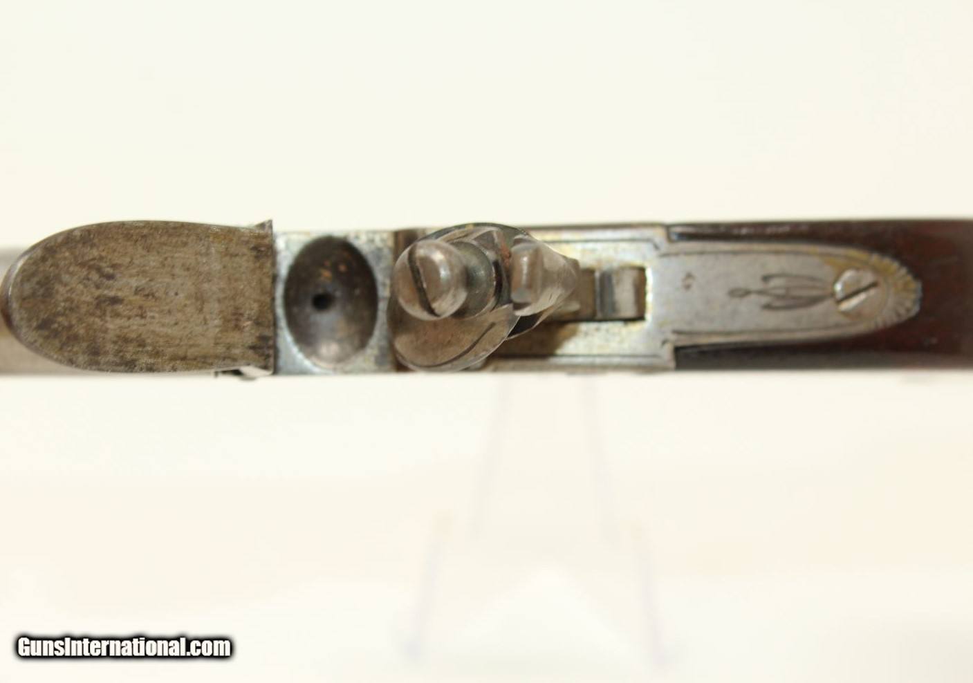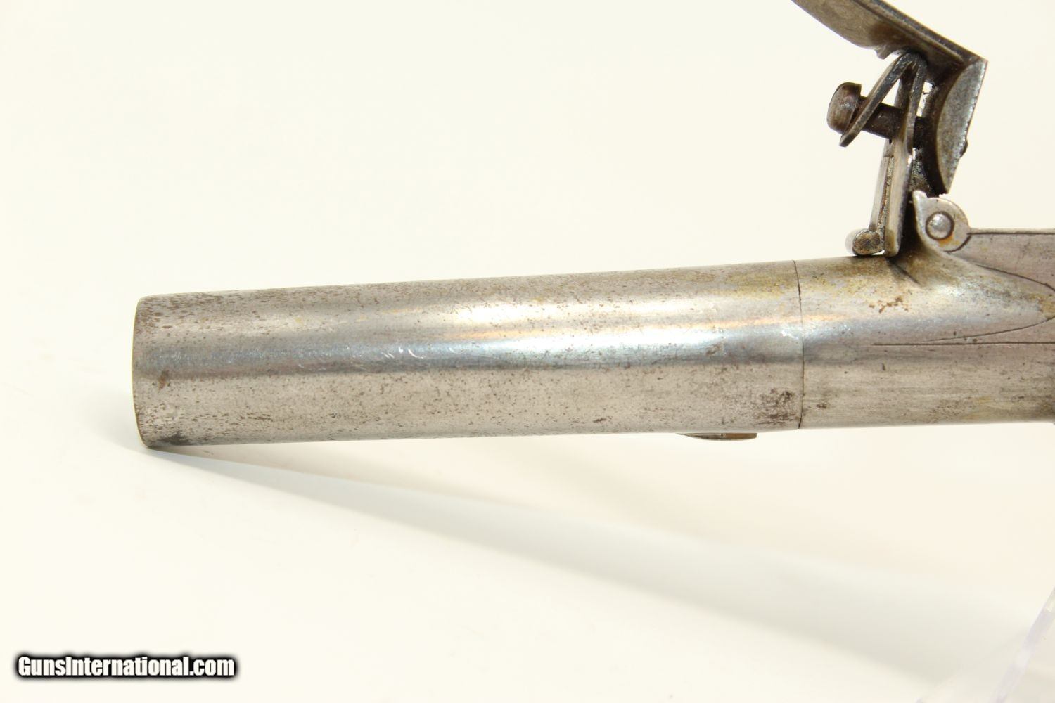 Description: WAR of 1812 Period Antique KETLAND Flintlock Pistol Circa 1801 .40 Caliber Single Shot Sidearm! Here we present an antique Ketland & Co. Flintlock Pistol in .40 Caliber, made circa the early 1800s in England. The Ketlands were partnered with Ketland & Co. operated in Birmingham, England, from the late 1700s and to the early 1800s to become one of the most prominent and active British makers of the day. John and Thomas Ketland were the sons of Thomas Ketland and grandsons of William Ketland, who had been making locks and guns for the colonies since the early 18th Century. The left lock plate is marked "KETLAND/& Co". The right side of the lock is marked “LONDON”. The underside of the barrel is stamped with pre-1813 proof marks. The barrel, trigger, lock, barrel tang, hammer, frizzen, pan and spring are all iron. There is a flower engraved on the trigger guard. The barrel turns off so as to be loaded from the breech rather than the muzzle, an easier method and enabling of a better fit for the projectile to the bore. This was very much the predecessor to Henry Deringer’s pistols that would come into their own a few decades later. The overall condition is very good. The iron parts are smooth and show their markings well. The walnut grip is in great shape. The bore is smooth and clean. The action is excellent. Here is a fantastic flintlock pistol from the time of King George III! Own the original! This is a legitimate antique and not a reproduction. Barrel is 2-1/2 inches. Caliber: .40 Overall condition as seen in photos. Very Fast. Very Safe. FREE SHIPPING WORLDWIDE. Delivered directly to your door by express mail! Guaranteed AUTHENTIC & Includes CERTIFICATE OF AUTHENTICITY. ancestryguns $1450 #190416 SOLD Antique: Yes |