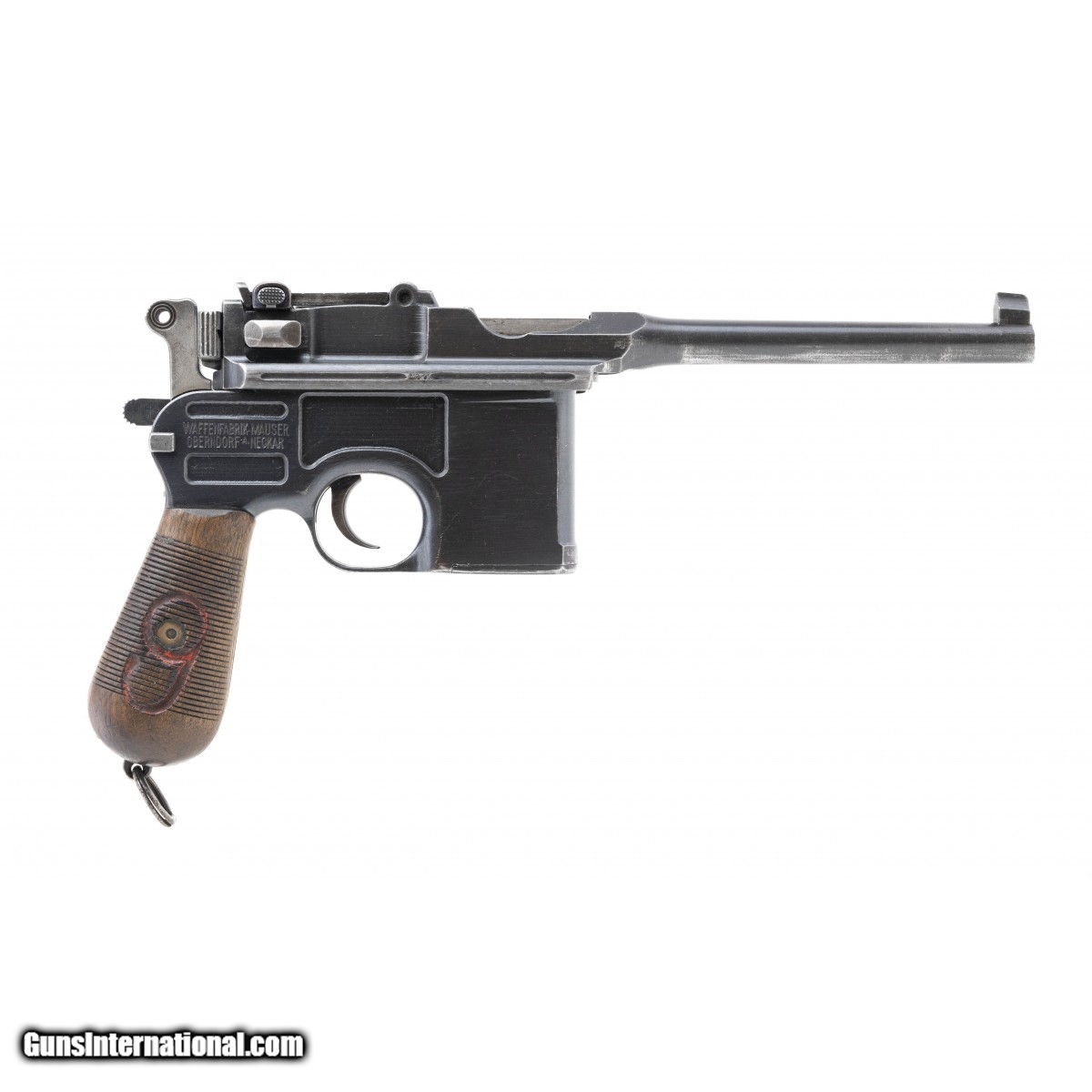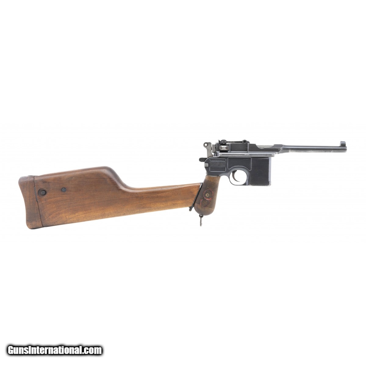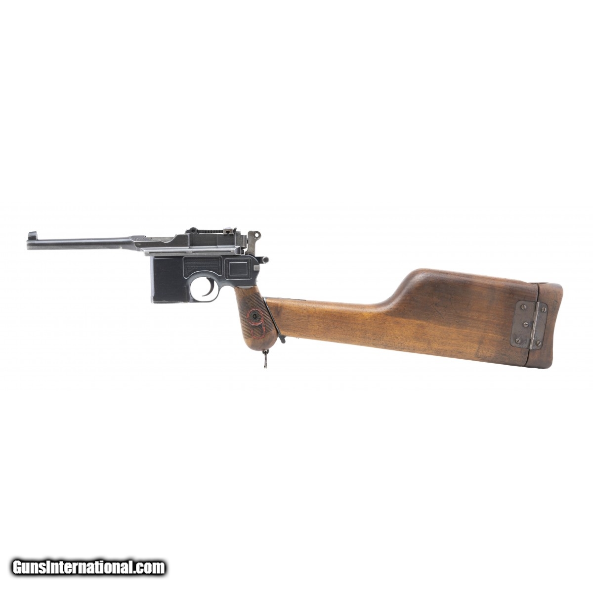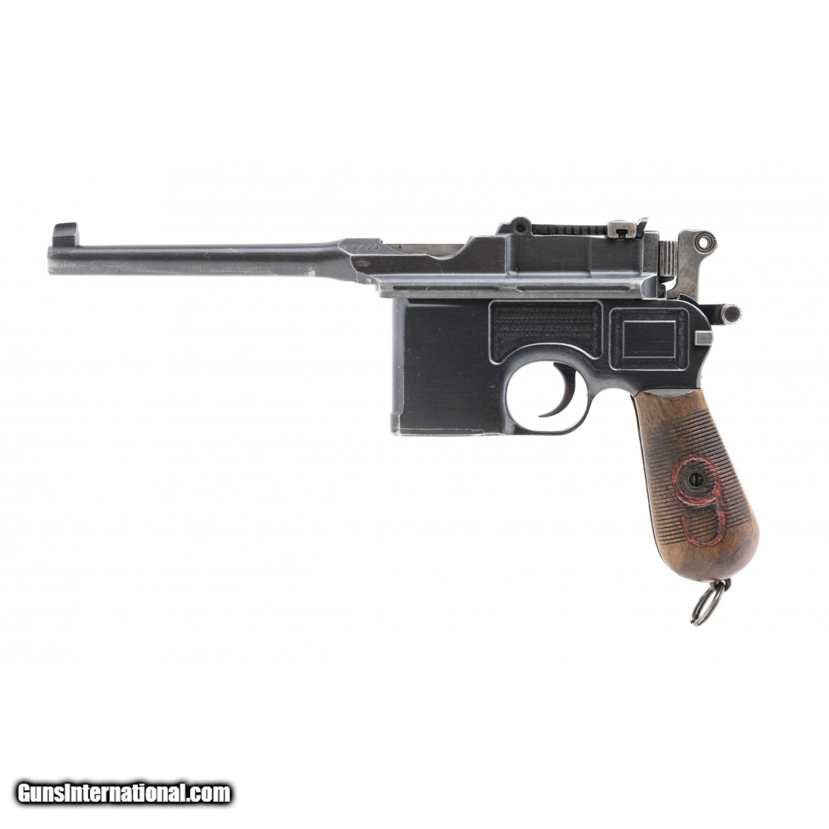 Description: " Very desirable WWI German Red Nine made by Mauser. Early production with serial number 20,605. Serial numbers are matching. Bore is excellent. Comes with an original shoulder stock. Leather strap on front of holster has broken off. Back of leather is dated 1917 and marked ""Sattler-Innung Osnabruck"". Front pouch has an extra spring. Shoulder stock is numbered, but not to pistol. Metal has approximately 95% original finish with some minor loss on underside of barrel due to being removed from shoulder stock holster. Right side of chamber is marked with a crown over a gothic M. Very good plus overall condition. A fantastic example. SOLD Curio/Relic: Yes |