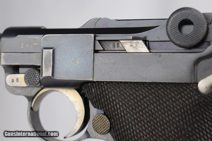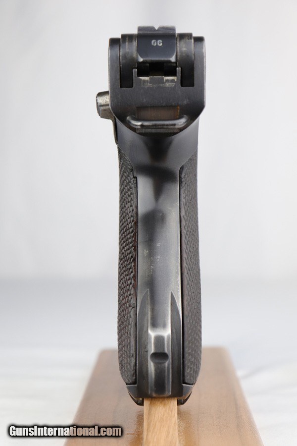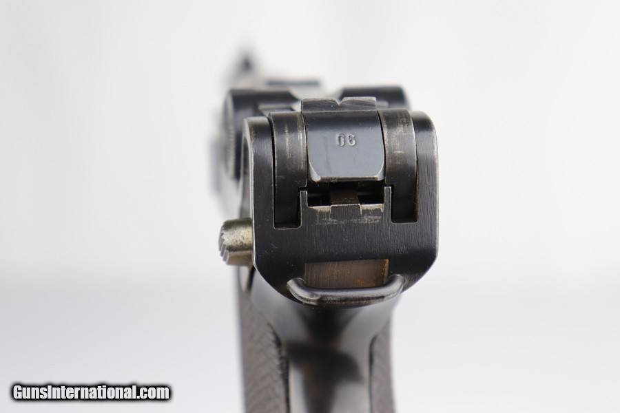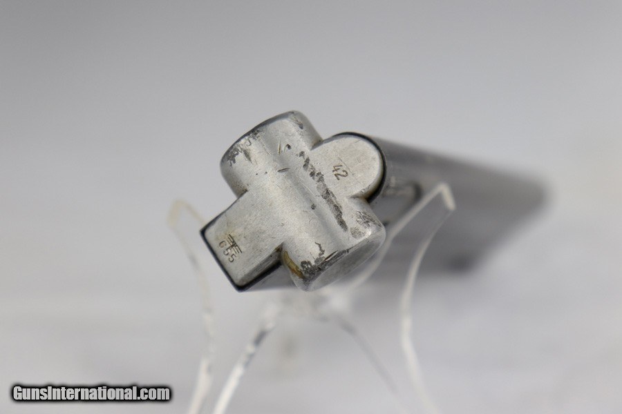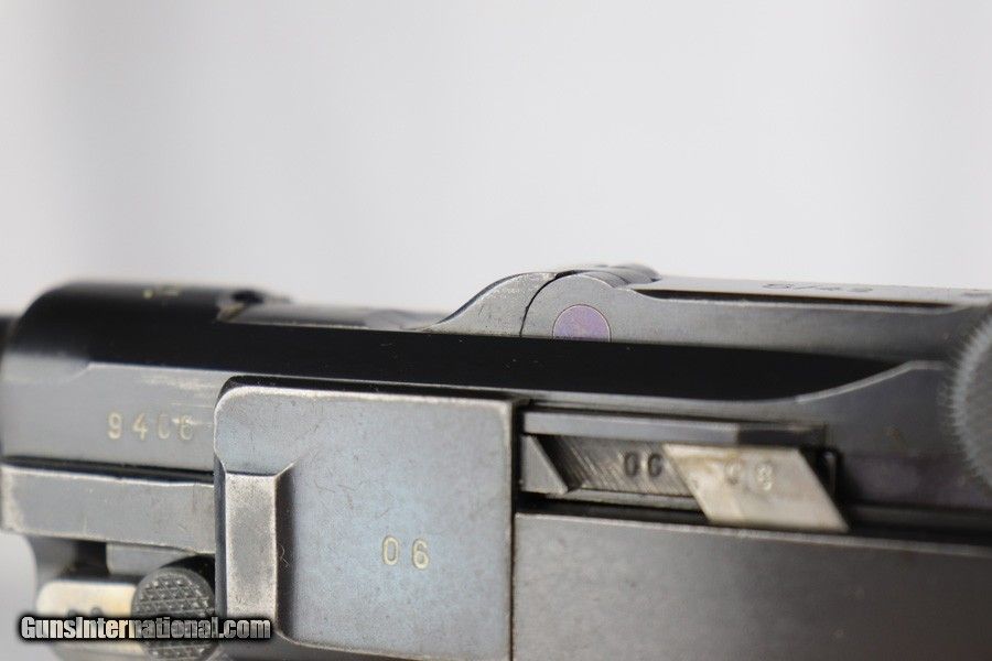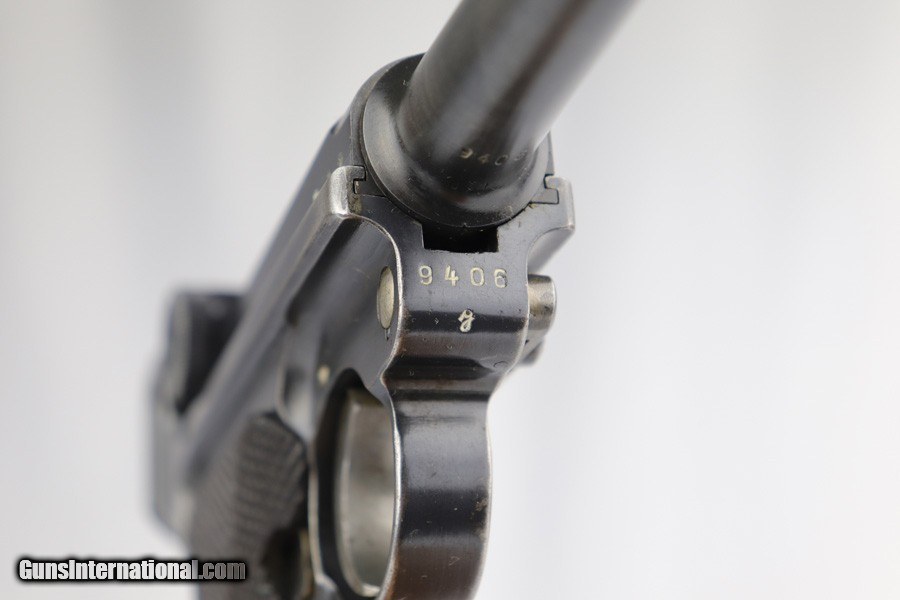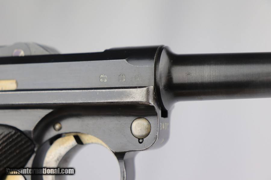 Description: This is an all matching and original Nazi Mauser Luger from 1936. Original bluing rates in the mid-90s with minor high edge wear and some patina under the finish. Also minor thinning to the barrel. Small parts still show 50-75% original straw. Grips are unmarked. The bore is good overall but does have some frost throughout. SOLD Curio/Relic: Yes Manufacturer: Mauser Model: P.08 Serial Number: 9406y Caliber Info: 9mm Bore: 7.5/10 Condition: 94-95% Manufacture Date: 1936 |