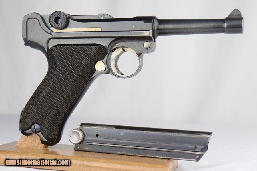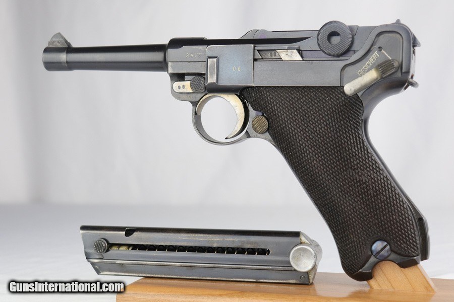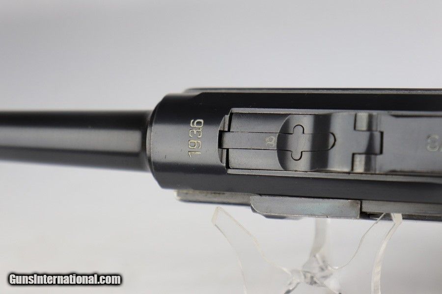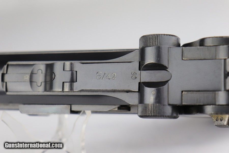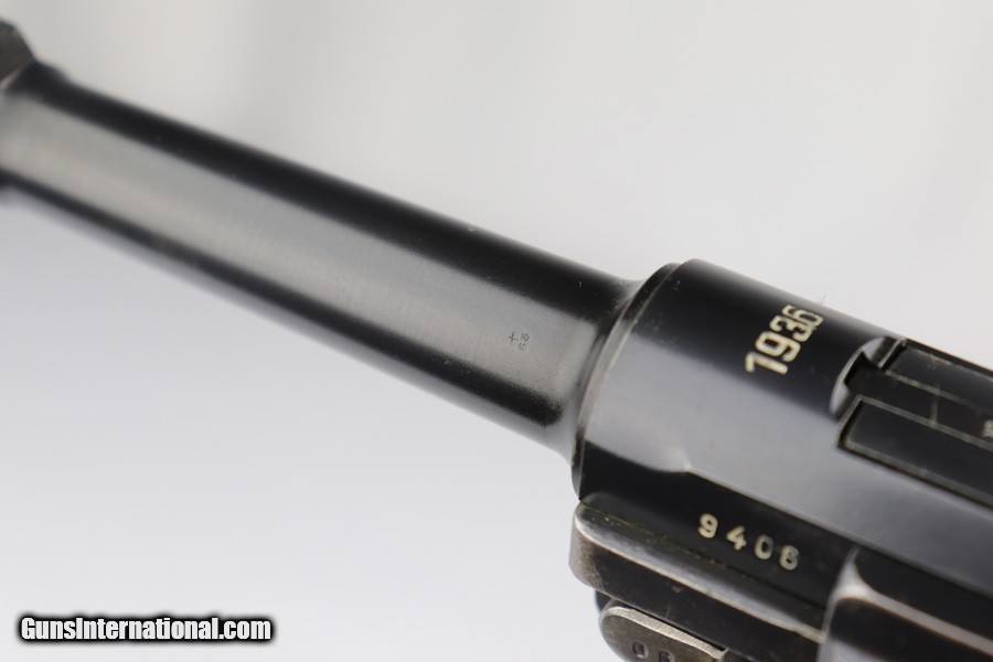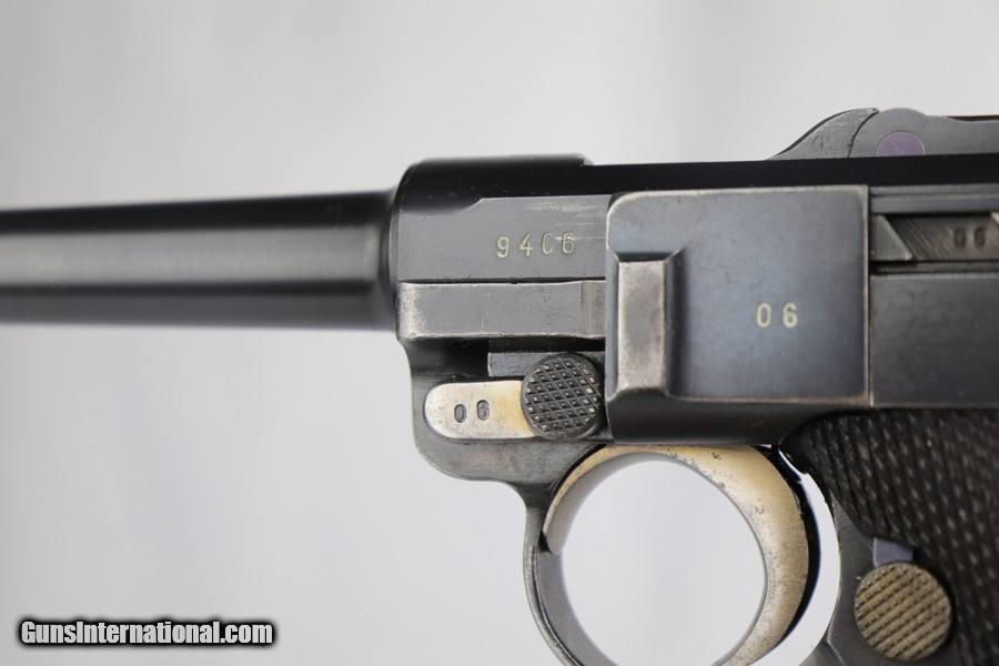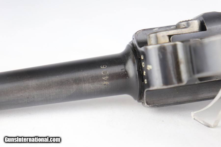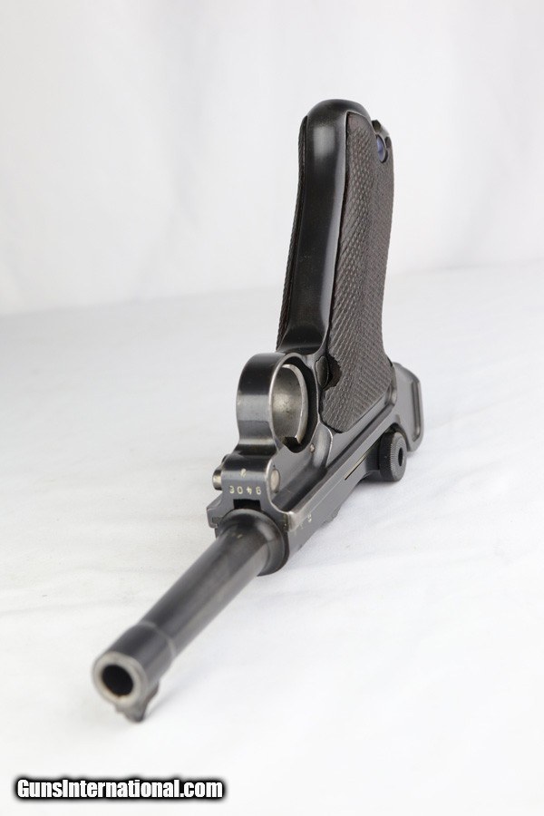 Description: This is an all matching and original Nazi Mauser Luger from 1936. Original bluing rates in the mid-90s with minor high edge wear and some patina under the finish. Also minor thinning to the barrel. Small parts still show 50-75% original straw. Grips are unmarked. The bore is good overall but does have some frost throughout. SOLD Curio/Relic: Yes Manufacturer: Mauser Model: P.08 Serial Number: 9406y Caliber Info: 9mm Bore: 7.5/10 Condition: 94-95% Manufacture Date: 1936 |