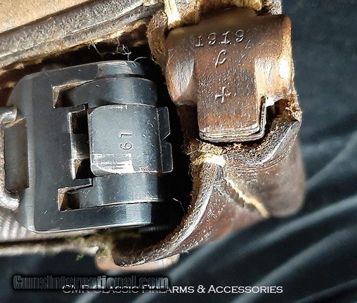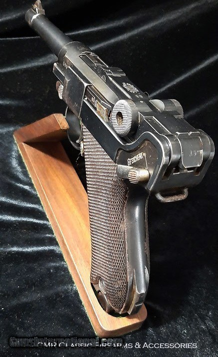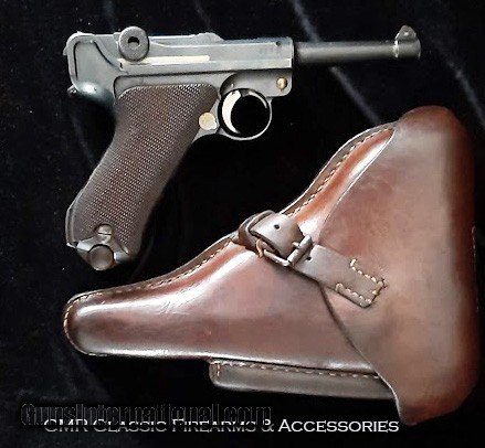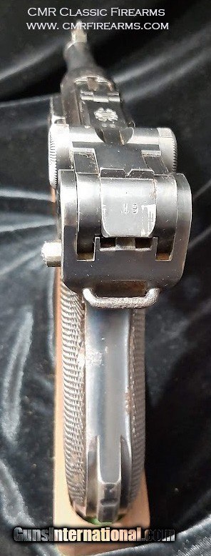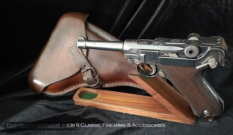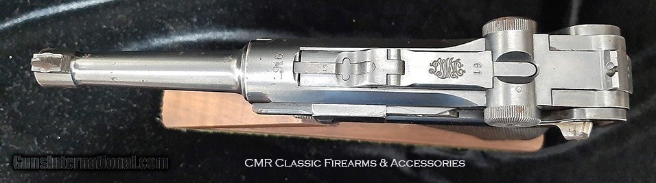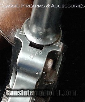Description: WWI DWM P.08 RIG DATED 1916 WITH MATCHING NUMBERS INCLUDING THE MAGAZINE IN VERY GOOD CONDITION. THE 90% BLUING SHOWS MODERATE HIGH EDGE WEAR. THE STRAW SMALL PARTS RETAIN APPROX 80% -/+ OF THEIR COLOUR. THE BORE IS MIRROR BRIGHT WITH VERY EXCELLENT + RIFLING. THE CHECKERED WALNUT GRIPS ARE IN EXCELLENT CONDITION WITH MATCHED NUMBER 19 ON THE INSIDE OF THE GRIP PANEL. COMES WITH ONE MATCHING MAGAZINE AND A LOVELY CONDITION HOLSTER WITH ITS ORIGINAL UNMARKED STRIPPING/LOADING TOOL. PROVENANCE: IT IS BELIEVED THIS PISTOL BELONGED TO A US NAVAL OFFICER WW1/WW11 AND WAS KEPT IN SAFE KEEPING AS A MOMENTO AND LATER DISCOVERED STORED FOR SAFE KEEPING. THERE IS AN INTERESTING INSCRIPTION ON THE REAR OF THE HOLSTER "G.BOWER E.F, HALE E. EDDY. N.Y." ON THE INNER FLAP G.BOWER C/o A.DAY. HALE EDDY. N.Y.USA. Some interesting research could be forthcoming to discover the origin of this Luger Pistoloand to whom it belonged to? DWM monogram on the Center toggle. Right receiver marked with Imperial proofs and miltary acceptance mark. Chamber Dated 1916. Collectors Grade Condition. Handling & Shipping - H&S not included. Recommended FFL Shippers provided. Curio/Relic: Yes Handgun Caliber: 9x19mm Parabellum (9mm Luger, 9x19mm NATO) Manufacturer: DWM Model: Luger P08 Bore Info: Mint Condition: Good Condition Metal Condition: Good Wood Condition: Good Bore Condition: Mint Action: Semi-auto Item Location: United Kingdom Grips: Walnut Price: $3,750.00 Buy Now Contact Seller |