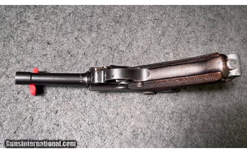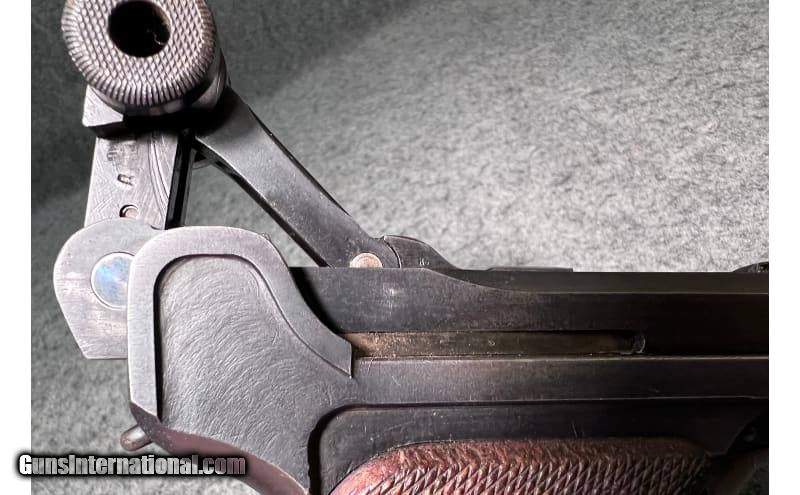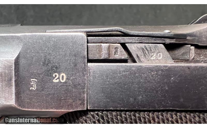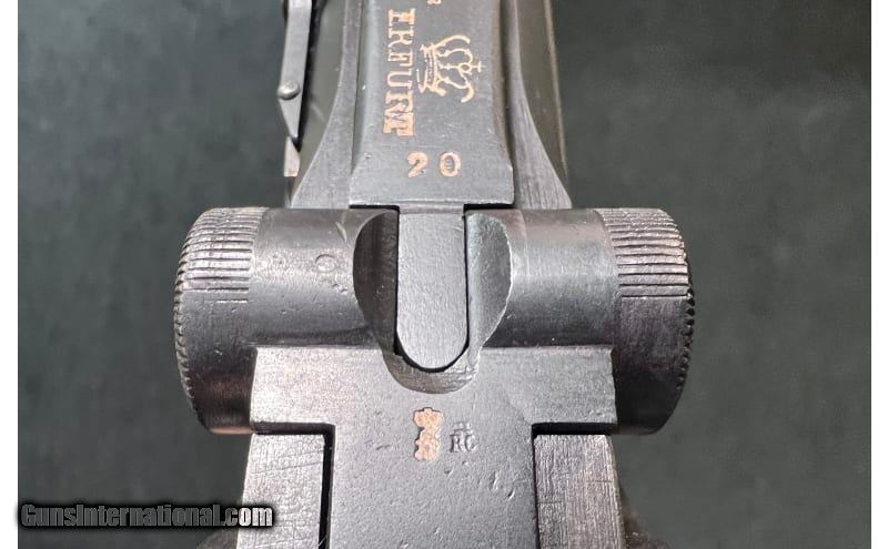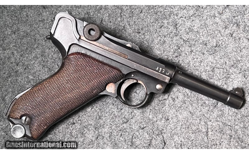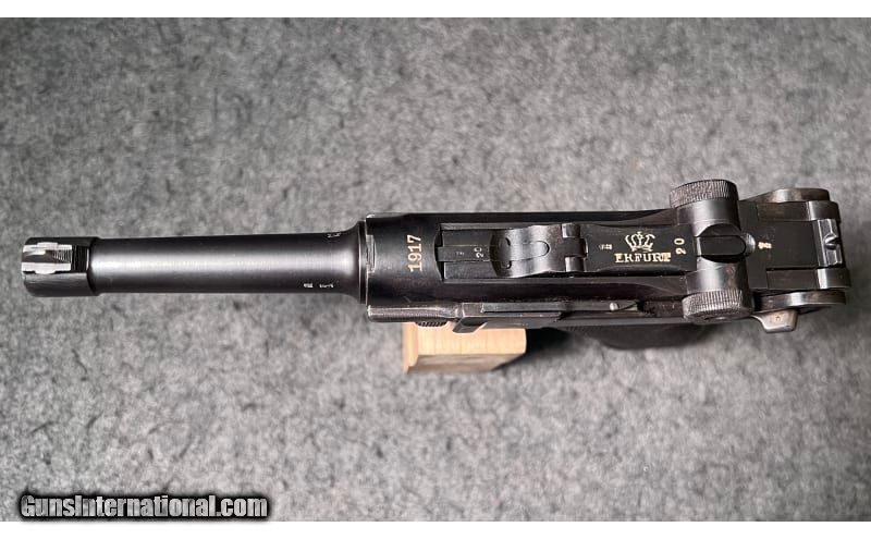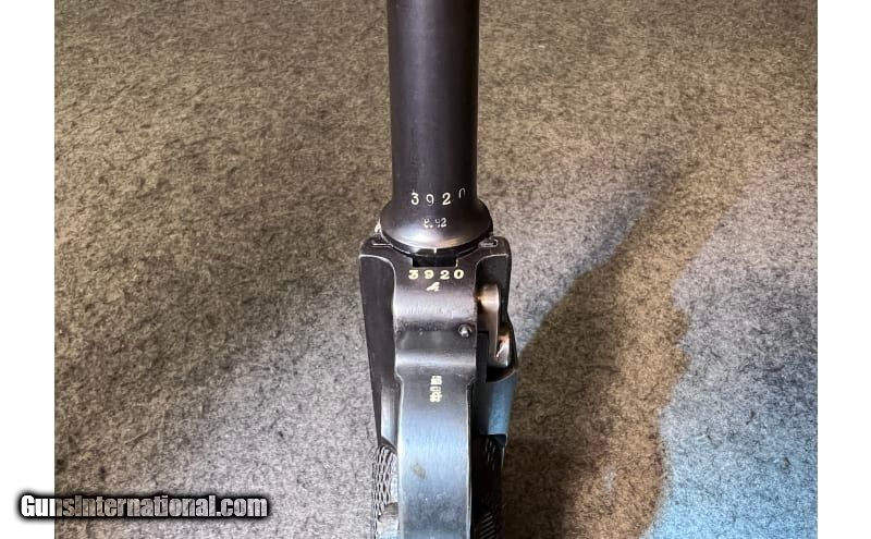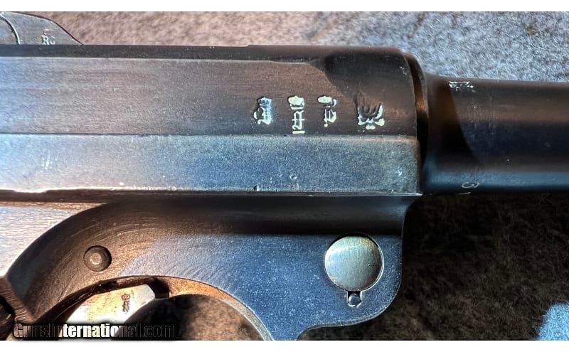 Description: This 1917 dated WWI era semi-automatic pistol is an Erfurt 1914 Model chambered in 9 MM. It has a fixed serrated dovetailed ramp inverted "V" front sight, a V-notch rear sight, a left side magazine release button, a lanyard loop, and a smooth round trigger and trigger guard. It contains extensive proof marks throughout. This is an example of a standard WWI 1914 Model German Luger pistol as manufactured by the Erfurt factory in 1917. The Erfurt Luger is a fairly scarce Luger to find as they had lower production numbers than the DWM models. The top of the chamber is marked "1917" for the year of manufacture and the front toggle is marked with the "Crown/ERFURT". The right side is marked with the three "Crown/Script" Letter proofs next to an "Imperial Eagle" proof. The rear of the barrel also has a single "Crown/Script Letter" proof with an "Imperial Eagle" proof on the right side. It has the standard military style numbers with the full serial number on the major parts with the various small parts all having the last two digits of the serial number along with the "crown Erfurt" acceptance proof mark. The ejector, magazine catch/release, takedown lever, thumb safety lever and trigger are all straw colored. The metal shows no signs of rust or pitting, and it has a great patina. The checkered wood grips are in very good condition, with no chips, marks, scratches, or cracks observable. It comes with an aftermarket leather holster and two magazines total (magazine serials do not match the gun). 9mm Parabellum SOLD Curio/Relic: Yes Metal Condition: "Metal shows no signs of rust or pitting, and with a great patina Wood Condition: "Checkered wood grips are in very good condition, with no chips, marks, scratches, or cracks observable Bore Condition: Bore is clean with strong rifling intact Barrels: 4 inch barrel Triggers: Smooth wide round trigger Stock Dimensions: 8¾ inches overall length Fore End: "The ejector, magazine catch/release, takedown lever, thumb safety lever and trigger are all straw colored. Weight: 1 Lb 14 Oz Sights: "Fixed serrated dovetailed ramp inverted ""V"" front sight, V-notch rear sight Item Location: Wichita, KS |