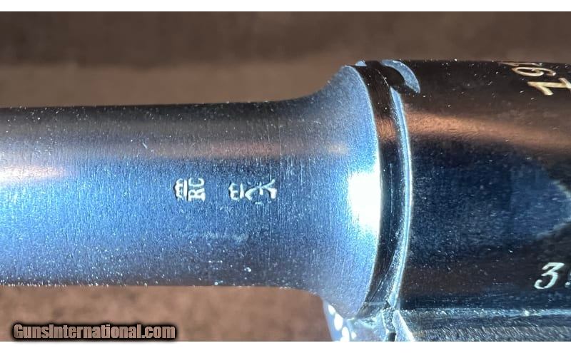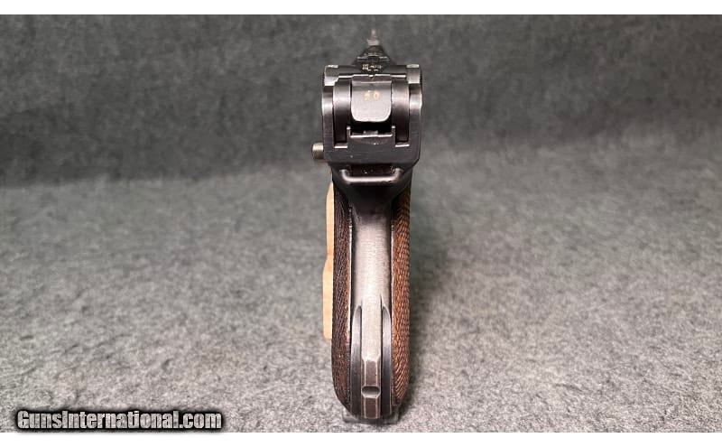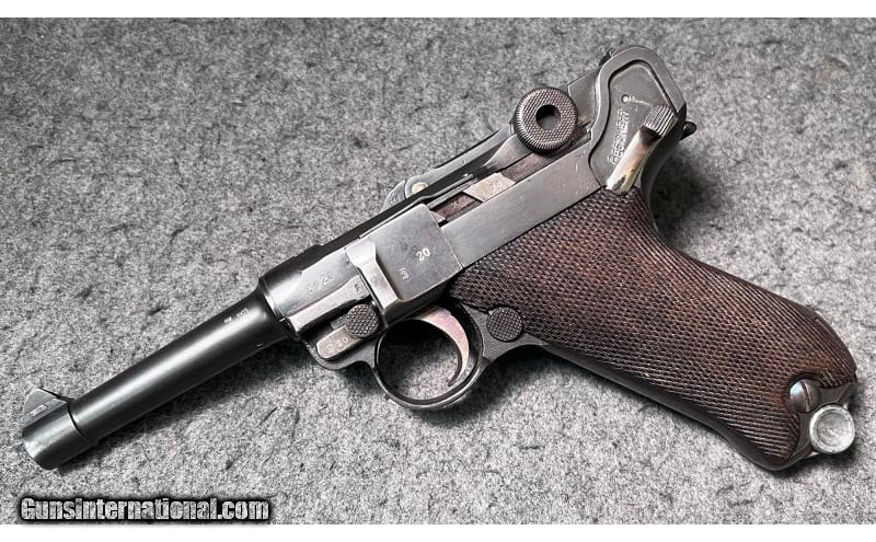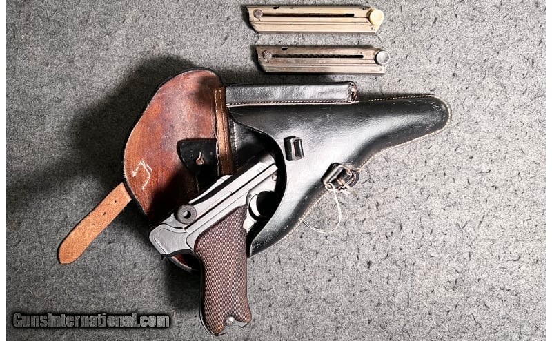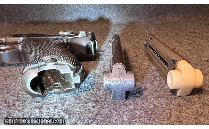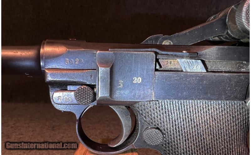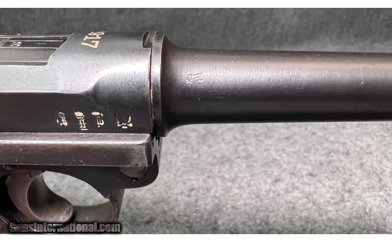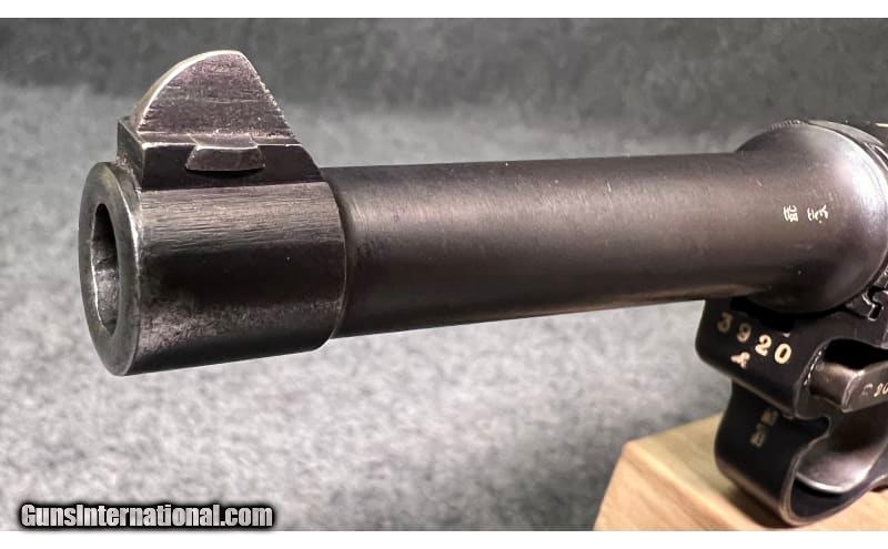 Description: This 1917 dated WWI era semi-automatic pistol is an Erfurt 1914 Model chambered in 9 MM. It has a fixed serrated dovetailed ramp inverted "V" front sight, a V-notch rear sight, a left side magazine release button, a lanyard loop, and a smooth round trigger and trigger guard. It contains extensive proof marks throughout. This is an example of a standard WWI 1914 Model German Luger pistol as manufactured by the Erfurt factory in 1917. The Erfurt Luger is a fairly scarce Luger to find as they had lower production numbers than the DWM models. The top of the chamber is marked "1917" for the year of manufacture and the front toggle is marked with the "Crown/ERFURT". The right side is marked with the three "Crown/Script" Letter proofs next to an "Imperial Eagle" proof. The rear of the barrel also has a single "Crown/Script Letter" proof with an "Imperial Eagle" proof on the right side. It has the standard military style numbers with the full serial number on the major parts with the various small parts all having the last two digits of the serial number along with the "crown Erfurt" acceptance proof mark. The ejector, magazine catch/release, takedown lever, thumb safety lever and trigger are all straw colored. The metal shows no signs of rust or pitting, and it has a great patina. The checkered wood grips are in very good condition, with no chips, marks, scratches, or cracks observable. It comes with an aftermarket leather holster and two magazines total (magazine serials do not match the gun). 9mm Parabellum SOLD Curio/Relic: Yes Metal Condition: "Metal shows no signs of rust or pitting, and with a great patina Wood Condition: "Checkered wood grips are in very good condition, with no chips, marks, scratches, or cracks observable Bore Condition: Bore is clean with strong rifling intact Barrels: 4 inch barrel Triggers: Smooth wide round trigger Stock Dimensions: 8¾ inches overall length Fore End: "The ejector, magazine catch/release, takedown lever, thumb safety lever and trigger are all straw colored. Weight: 1 Lb 14 Oz Sights: "Fixed serrated dovetailed ramp inverted ""V"" front sight, V-notch rear sight Item Location: Wichita, KS |