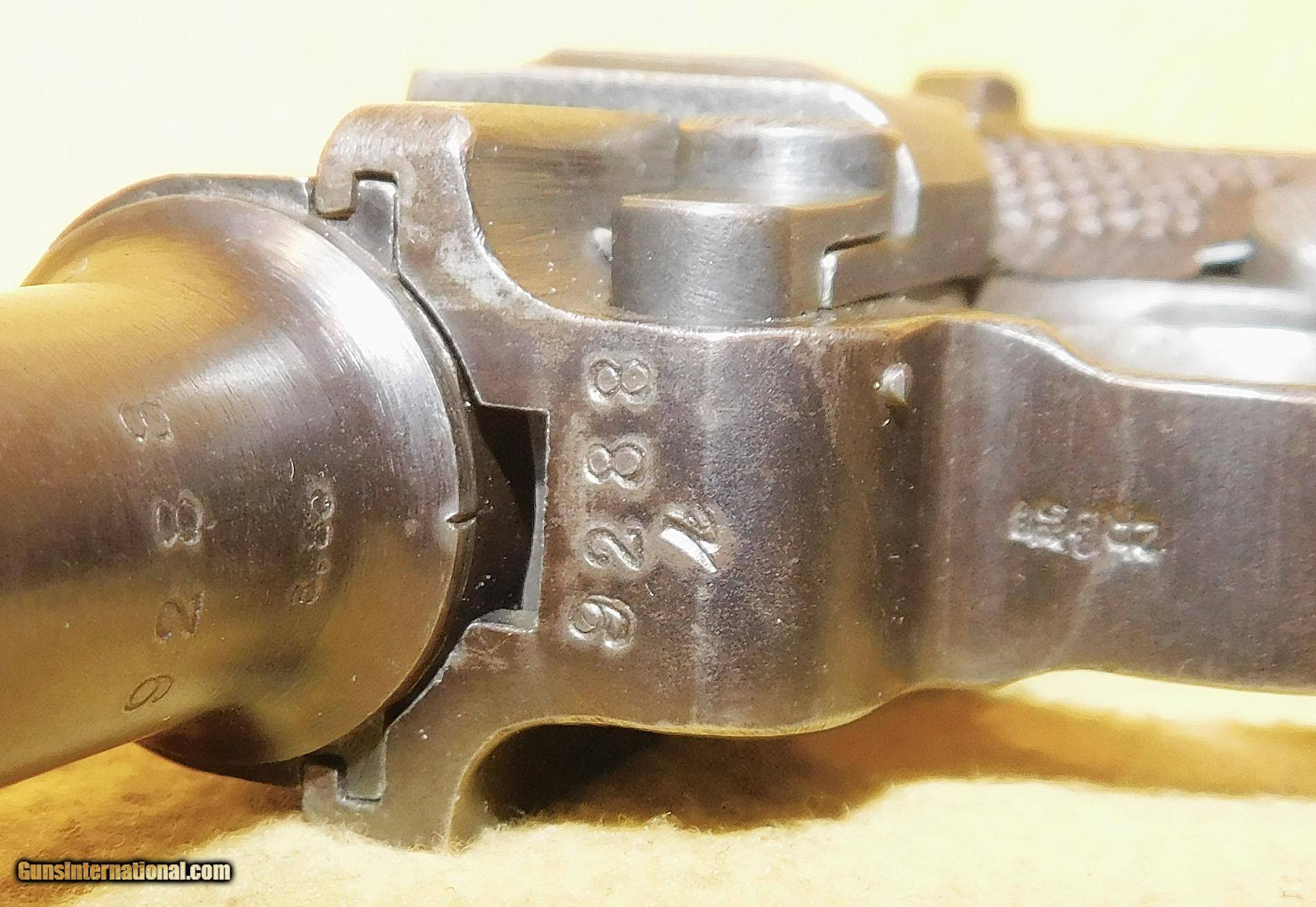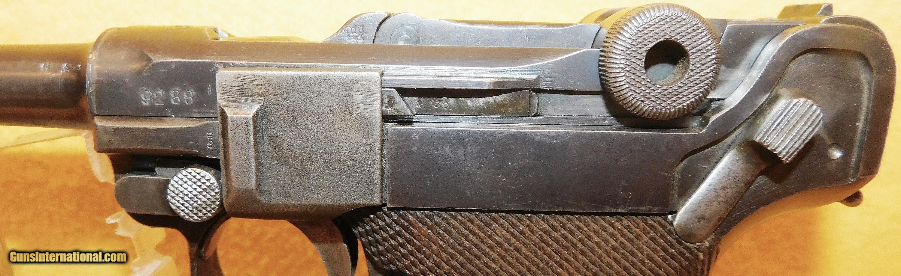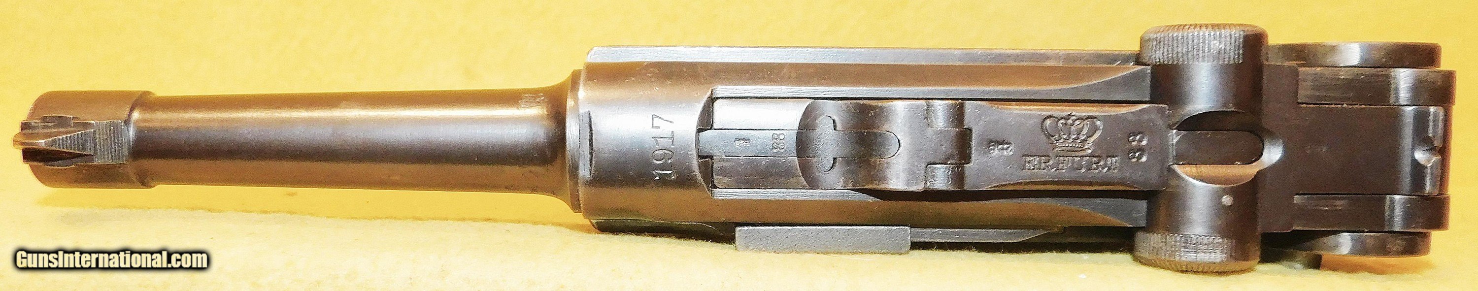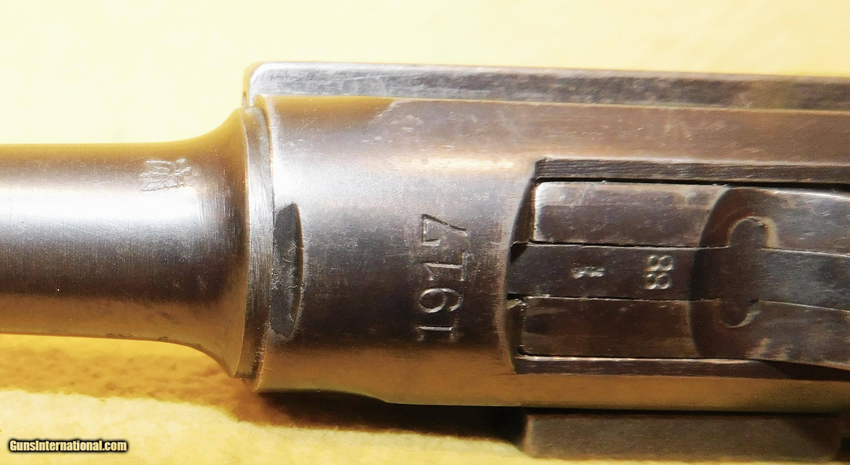Description: ERFURT 1917 P08 (LUGER) IN 9MM CAL., WITH 4" BARREL. COLOR BLUE. CONDITION 95%. SERIAL NUMBER 9288 i. ERFURT MODEL 1917 P08 LUGER (CIRCA 1917) IN 9MM CALIBER, MIRROR BORE, GRIPS ARE EXCELLENT AND SERIELD TO THE FIREARM, ALL MATCHING NUMBERS EXCEPT FOR THE SIDE PLATE AND TAKE DOWN LEAVER, FIRING PIN IS SERIAL TO THE P08, COMES WITH ONE WOOD BASE MAGAZINE WITH WRONG SERIAL NUMBER, 95% OVERALL CONDITION, OUR STOCK # D8116 Price: $1,395.00 Contact Seller |