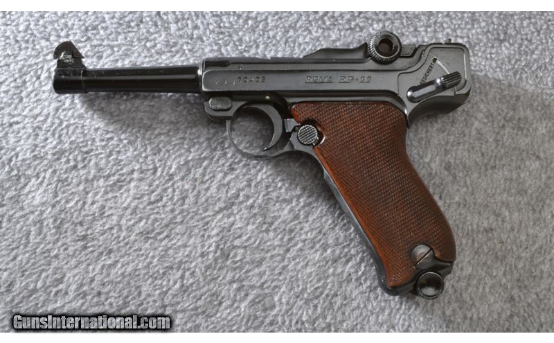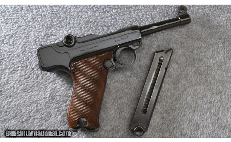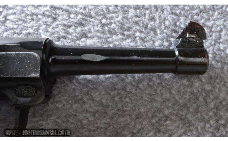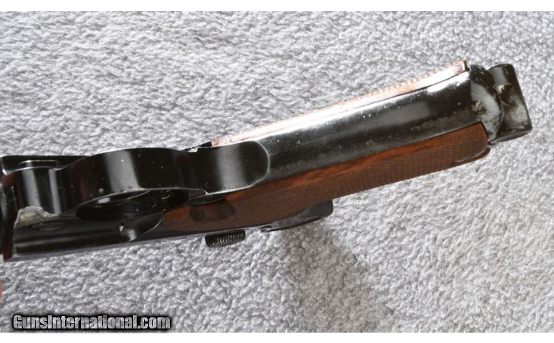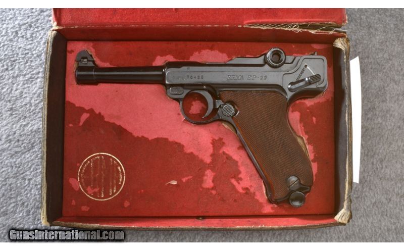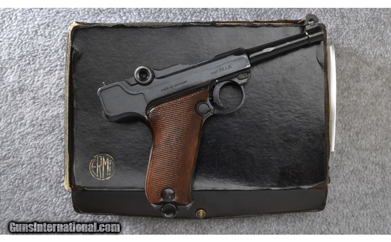 Description: This gun was manufactured in Germany by "Erma Werke Waffenfabrik" who manufactured inexpensive target and plinking pistols. Grips are solid and show light wear, and a cut to bare metal on right side of barrel. Blue is very good showing some holster wear. Front sight has been poorly replaced. Bore is excellent. Complete with original box! .22 Long Rifle SOLD Curio/Relic: Yes Barrels: 4.5" Barrel Triggers: Factory Weight: 26 Oz Sights: Ramp Front Sight - Fixed Rear Sight Item Location: Wheeling |