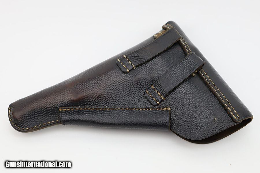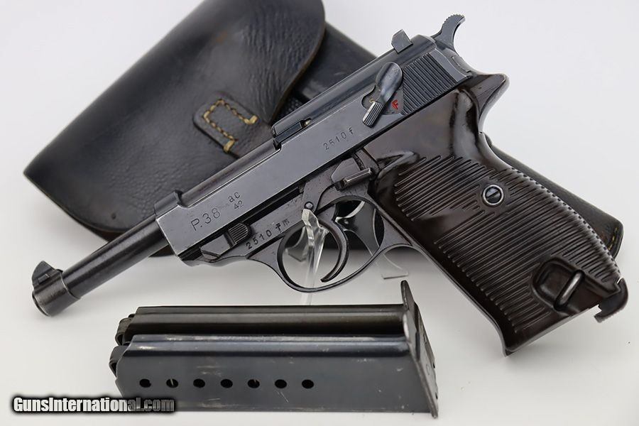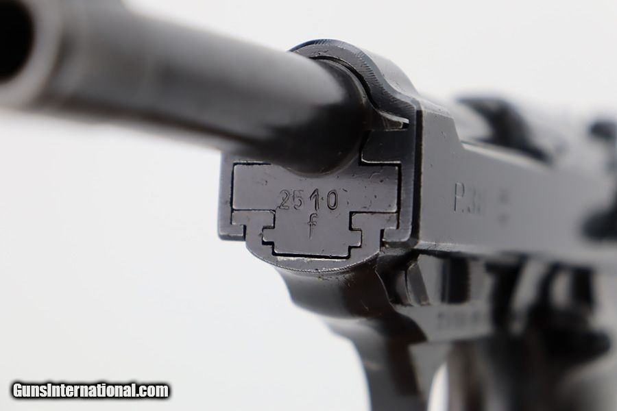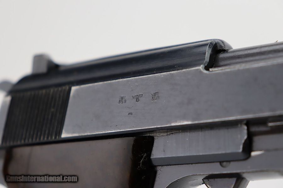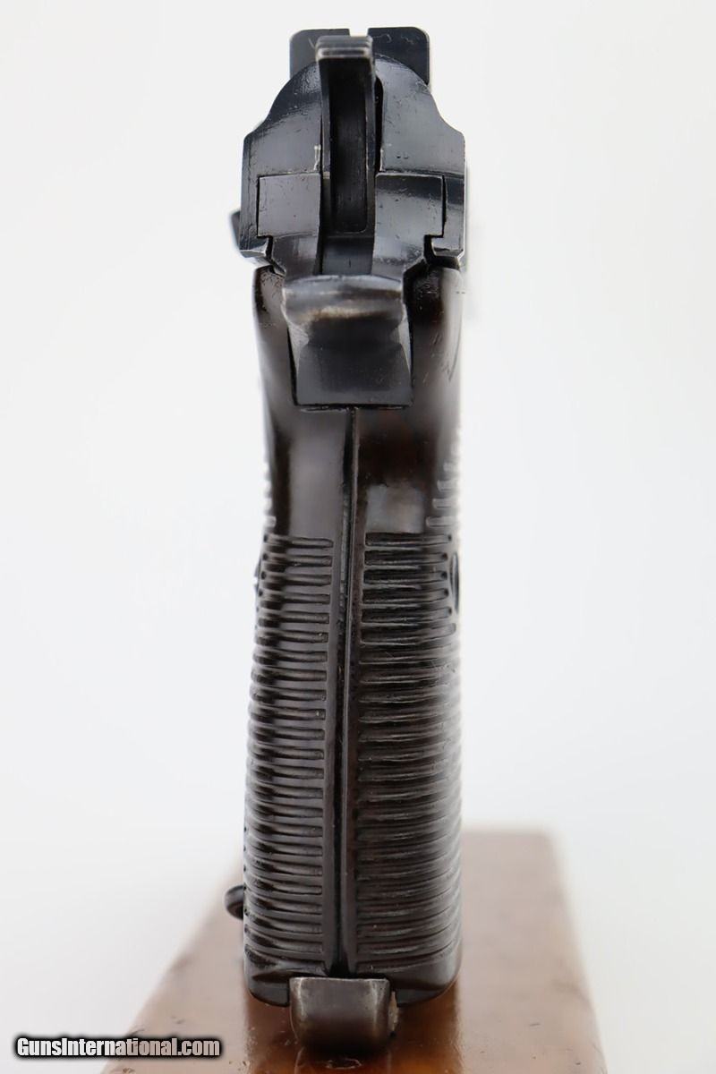 Description: This is an excellent example of an AC 42 Walther P.38 issued to the Nazi military in 1942. All matching with the proper "Eagle 359" military acceptance proofs throughout. It comes as a rig with a very nice 1944-dated pebble grain holster, one numbered but mismatched magazine, and one post-war magazine. The gun itself has retained about 96% of its original finish with just minor wear around the muzzle and front edges of the slide. Some very light freckling along the barrel and on small spot on the left side of the slide. Fitted with excellent period-correct bakelite grips. Very nice bore with great rifling. De-cocker is functional. SOLD Curio/Relic: Yes Handgun Caliber: 9x19mm Parabellum (9mm Luger, 9x19mm NATO) |