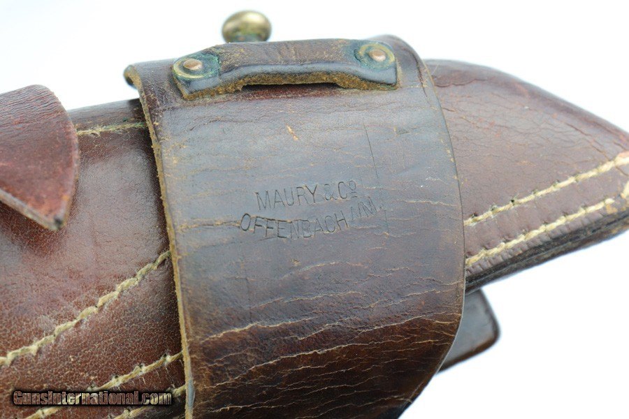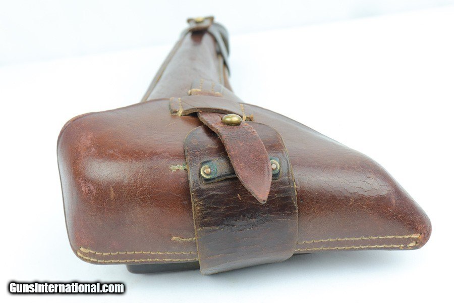 Description: This is a terrific example of a 1917 DWM Artillery Luger rig with matching magazine and stock, cleaning rod and holster. The pistol is all original and correct with about 97% blue remaining, with very minor edge wear from the holster and a little bit of finish loss on each strap. Small parts still show excellent straw, and the excellent grips are also matching to the pistol. The magazine is numbered to the pistol but as you can see in the photo, the last digit can't be seen easily as there is a large ding in the wood bottom there. The stock is also matching to the gun and has clear Imperial proof mark on the back. The leather on the stock attachments is original but the cup strap has been repaired. The holster is in excellent condition with clear 1917 date and maker mark on the back. We did swap in a nicer but original holster as the one that came with the pistol was worn and badly damaged. Original cleaning rod is present and in very good condition. Pistol bore is mint - hardly looks used. SOLD Curio/Relic: Yes Manufacturer: DWM Model: LP.08 Serial Number: 7485c Caliber Info: 9mm Bore: 10/10 Condition: 97+% Manufacture Date: 1917 |
