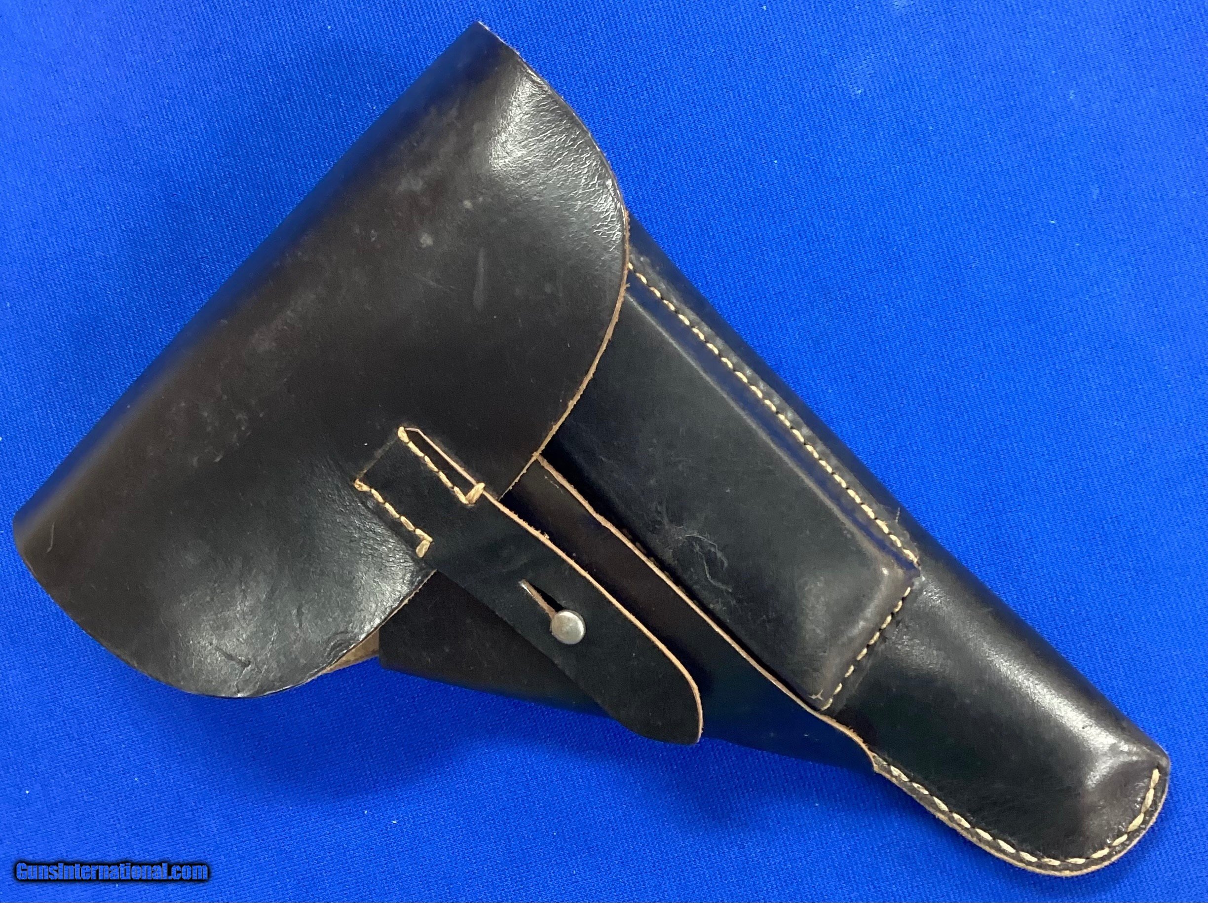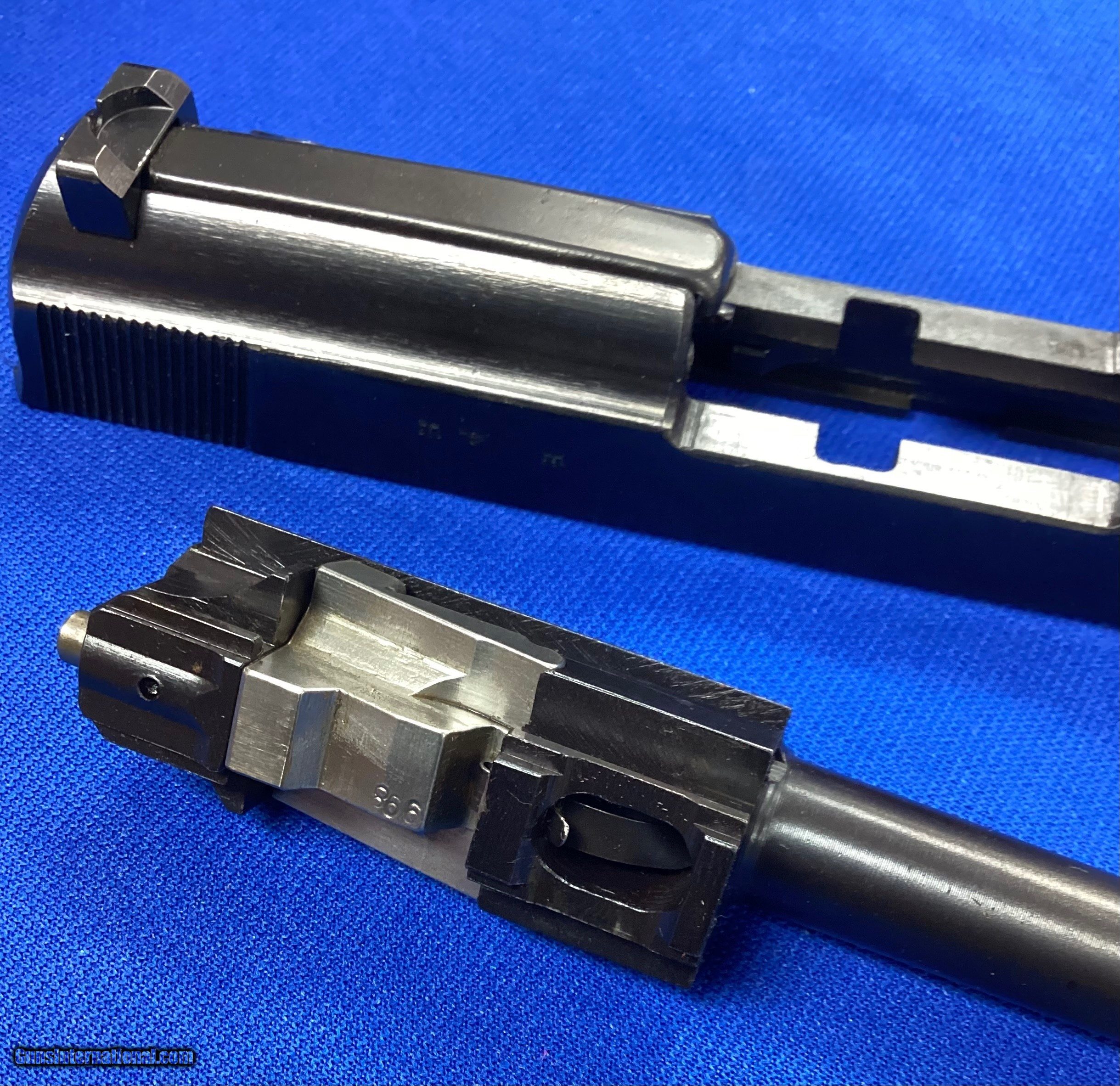 Description: German/Nazi WWII P.38 MFGR./DATE ‘’ac 44’’ Walther 1944, all matching thru-out! Everything, absolutely beautiful. COMPLETE W/MINT ORIGINAL ‘’gxy/1944’’ (Soft Shell) HOLSTER, 2 ORIGINAL WALTHER ‘’NAZI EAGLE/359/P.38v’’ proofed magazines. NOT IMPORT MARKED! Consignment - Just Here. This P.38 is part of a very large P/38 collection we have gradually been selling for the owner. With its ‘’1998f’’ serial number this ‘’ac/44’’ was potentially manufactured in earlier-1944. This variation saw much of the fighting right after the D-Day/Normandy Invasion, the Ardennes Offensive/Battle of the Bulge and the final battles of the ETO in WWII. VERY IMPORTANT FACTS: This P.38, as with all that we have handled for the owner remains absolutely 100% Walther Mid-1944, All Matching thru-out and not import marked and not Russian Capture ‘’X’’ marked! In carefully checking it over, all of the Walther Mid-1944 Factory ‘’In The White’’ parts remain so including a number of parts that were permanently assembled into the blued parts at the Walther Factory in 1944. These include: the barrel locking block release plunger that is Factory staked and non-removable (still ‘’in the white’’)! The Factory matching serial numbered ‘’in the white’’ locking blocks, all springs, all recoil plungers and pins and their springs, other pins etc. are ALL still ‘’in the white’’. Also, the rear barrel chamber beveled edge that is Factory machined is still ‘’in the white’’ being correctly machined bare metal. Book Reference: Please refer to the following fine books: ‘’Axis Pistols’’ by Jan C. Still pages 22-34 on P.38 Pistols and especially the chart on page 23. Also, for more specific information refer to the fine book ‘’The P.38 Pistol’’ (Volume one) by Warren Buxton. Matching/Originality: This most outstanding Walther ‘’ac 44’’ P.38 variation is absolute ALL MATCHING in its originality thru-out right down to its two 1944 Factory original Walther ‘’NAZI EAGLE over 359’’ Proofed (Same as Pistol) magazines! All still in its Original ‘’gxy 1944’’ marker marked and dated (soft shell) Holster! Finish & %: The Pistols metal finish at this period of manufacture by Walther is the ‘’Full Blued’’ coloring All finish is un-touched, no cleaning, touch-up or messed with in any way. Overall, it rates easily at 99%+ and simply magnificent! Even the sharp outer edge of the safety lever shows virtually no wear and even the grip straps rate at 99%+! Proofs/Markings: All markings are also all Walther 1944 Factory perfect thru out with the left slide having the ‘’P.38’’ followed by the ‘’1998 f’’ serial number, followed by the (in line) ‘’ac 44! On the right slide is the Walther ‘’NAZI EAGLE over 359, NAZI EAGLE SWASTIKA, NAZI EAGLE over 359’’ Proofs! All Proofing and markings remain of course absolutely untouched, deep, sharp, crisp and Walther 1944 Factory perfect. Bore: Remarkably even the BORE with only a patch ran through it rates absolutely Beautiful Bright, Shiny and MINT! This is outstanding for any Nazi WWII Pistol, especially an actual Military Issued pistol due to the highly corrosive German ammo! Action/Mechanically: Added to all the above even in this area it is perfect and basically ‘’As New’’! Grips: The original grips are also simply magnificent and even these also rate every bit MINT and fit perfectly. They are in the un-mistakable (Bakelite) reddish brown color. Even the grip screw is outstanding rating as Mint and 99%+ with perfect slot! History/Use: This era/period ‘’ac 44’’ P.38 pistol being manufacture in earlier 1944 is the exact variation that was encountered by most GI’s just before and after the D-Day/Normandy Invasion and throughout all the continuous hard Battles fought including those continuing in Italy, the D-Day/Normandy Invasion thru France, Belgium, Ardennes Offensive/Battle of the Bulge and the final battles of the ETO in WWII. then into the till the end of the War. This is simply as good as it gets! Curio &Relic FFL Item SOLD Handgun Caliber: 9x19mm Parabellum (9mm Luger, 9x19mm NATO) Manufacturer: Walther Model: P38 |
