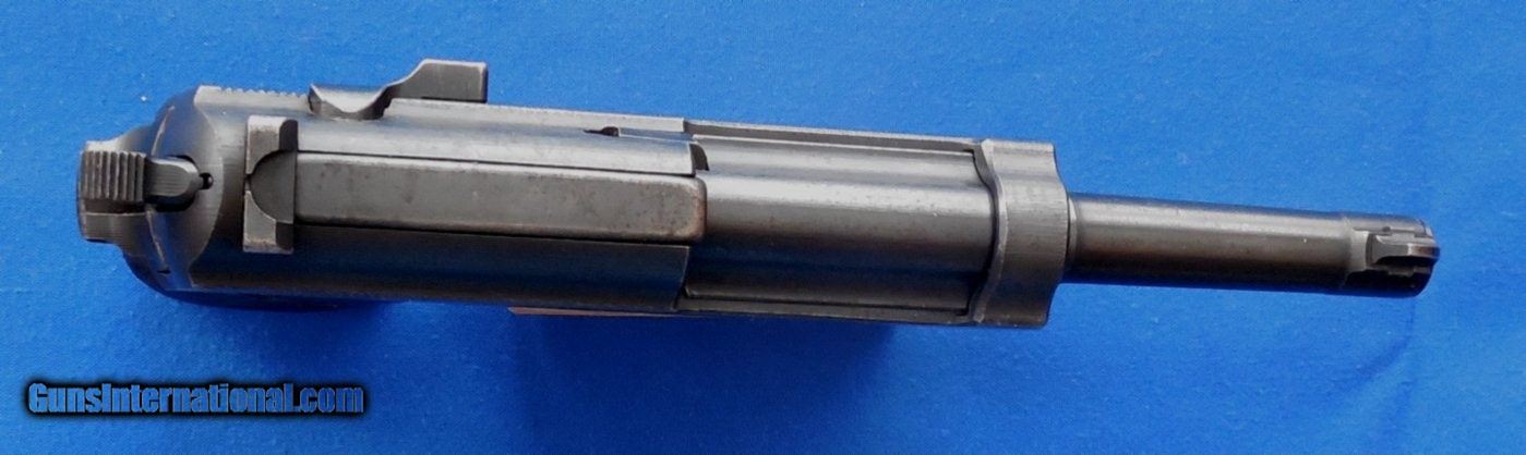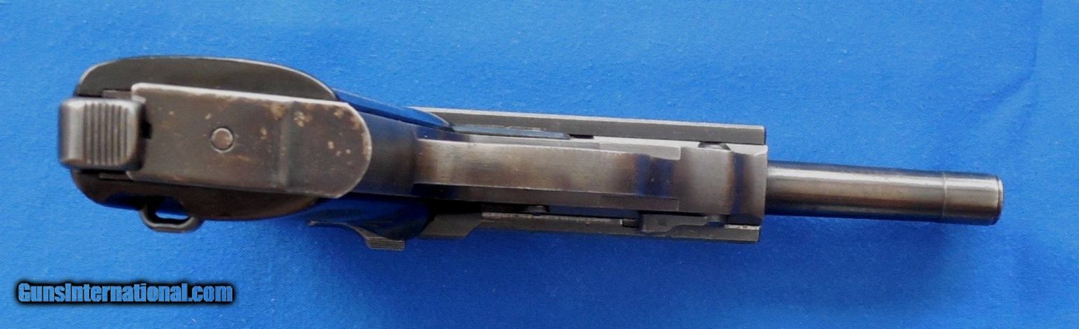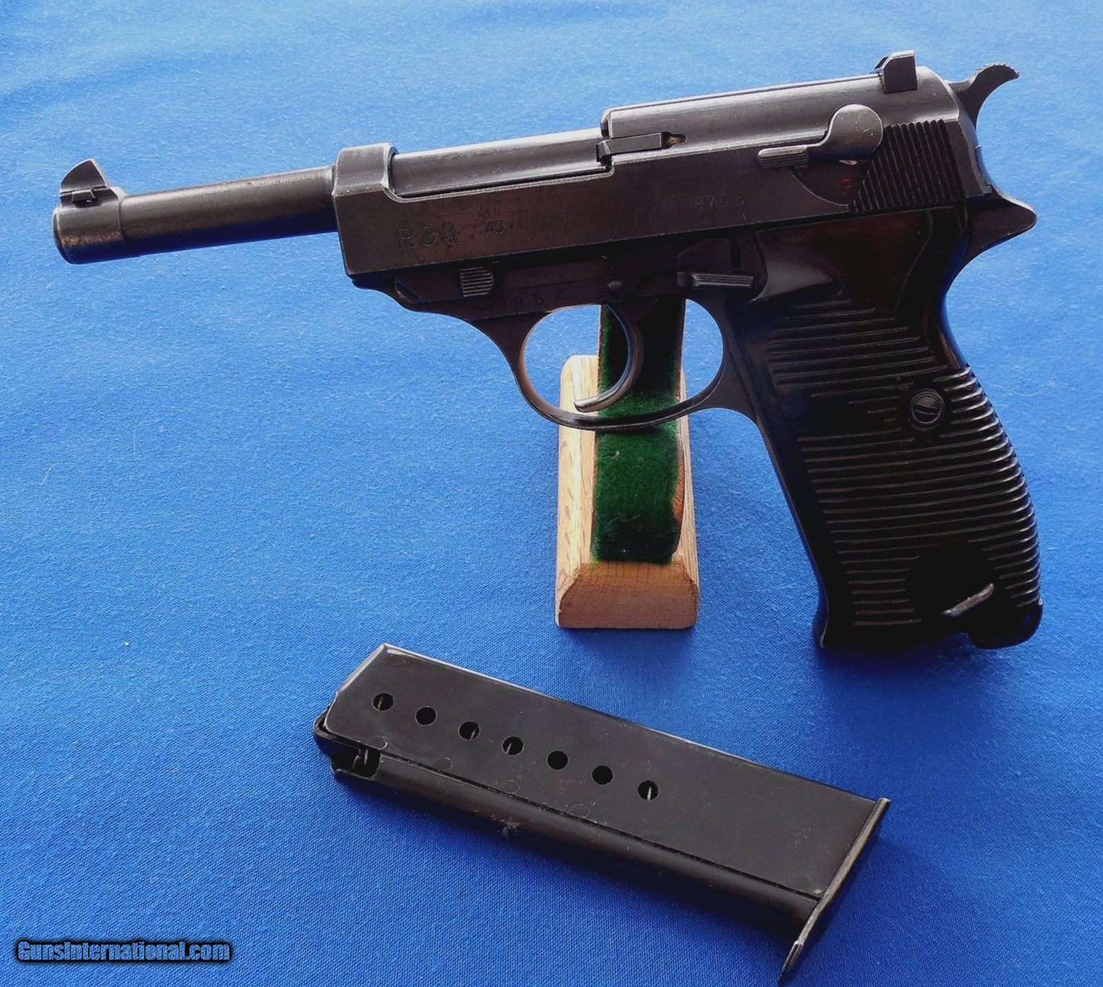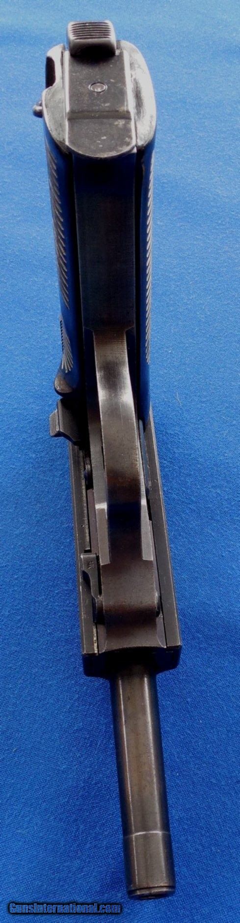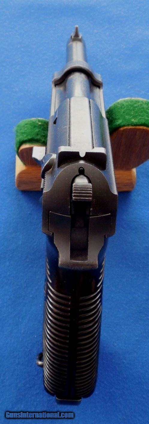 Description: German P.38 Semi-Auto Pistol, serial # 879 b, cal. 9 mm, manufactured by Walther, with a 5" barrel and a bright near excellent bore showing some very fine frosting within the grooves. The metal surfaces on this ac 43-coded pistol retain about 85% original blue toning to plum with scattered fine oxidation and pinprick pitting but nothing alarming, the grip straps toning to pale gray. The grooved phenolic resin grips rate near excellent. The markings remain clear and have "(eagle) / 359" Waffenamts, the serialized numbered parts matching and a single "(eagle) / 359" P.38 magazine is included. The overall condition as described and photographed is very good - very good plus.{C&R} Inv. : # 1-1377 SOLD Curio/Relic: Yes |