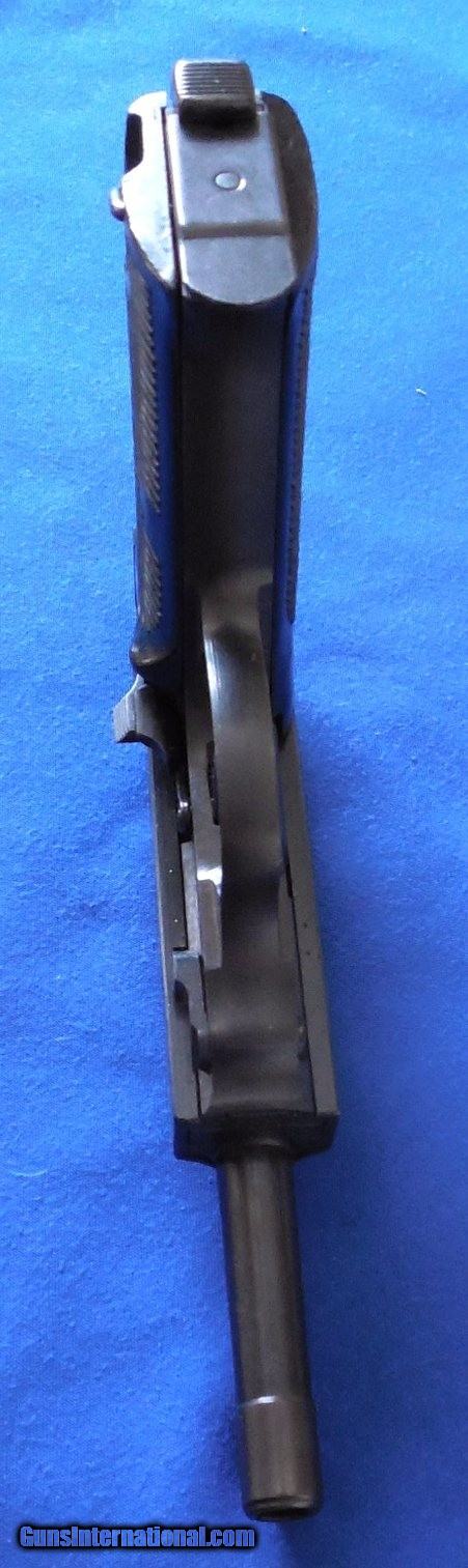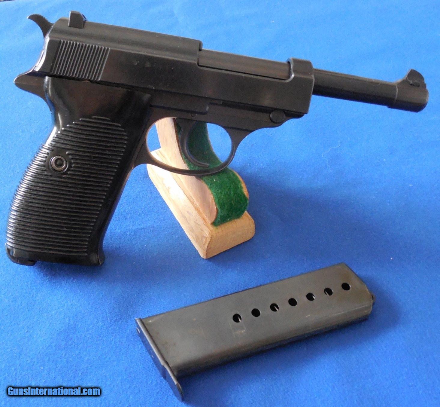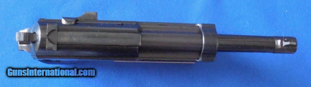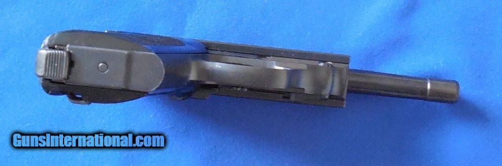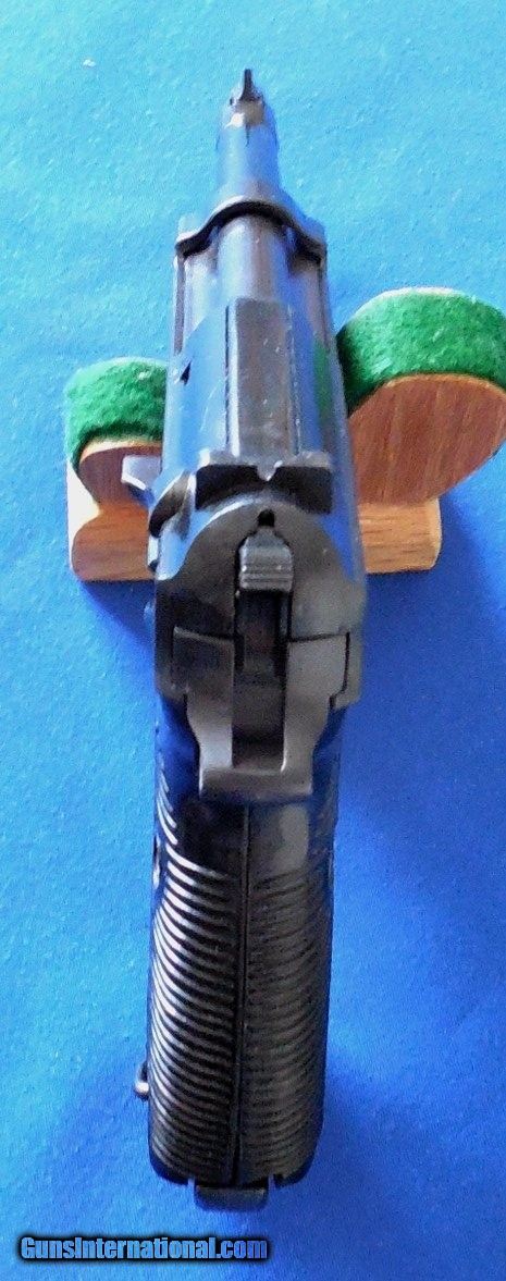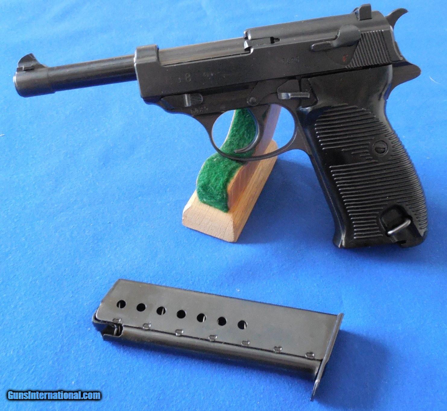 Description: Sold / Pending Funds / German P.38 Semi-Auto Pistol, made by Spreewerk, code: cyq, serial # 6425, 9 mm, 5" barrel with a very good bore showing strong rifling with some light frosting and oxidation. The metal surfaces on this non-suffix letter pistol retain 98-99% dark arsenal quality blue with some tiny impact marks and scratches still visible. The grooved black resin grips rate excellent with a couple tiny handling marks. The pistol is "(eagle) / 88" Waffenamt marked, serialized parts are matching and included is a single magazine marked "(eagle) / 88" on the spine only. Overall an excellent non-suffix Spreewerk pistol. {C&R} Inv.: # 1-1376 SOLD Curio/Relic: Yes |