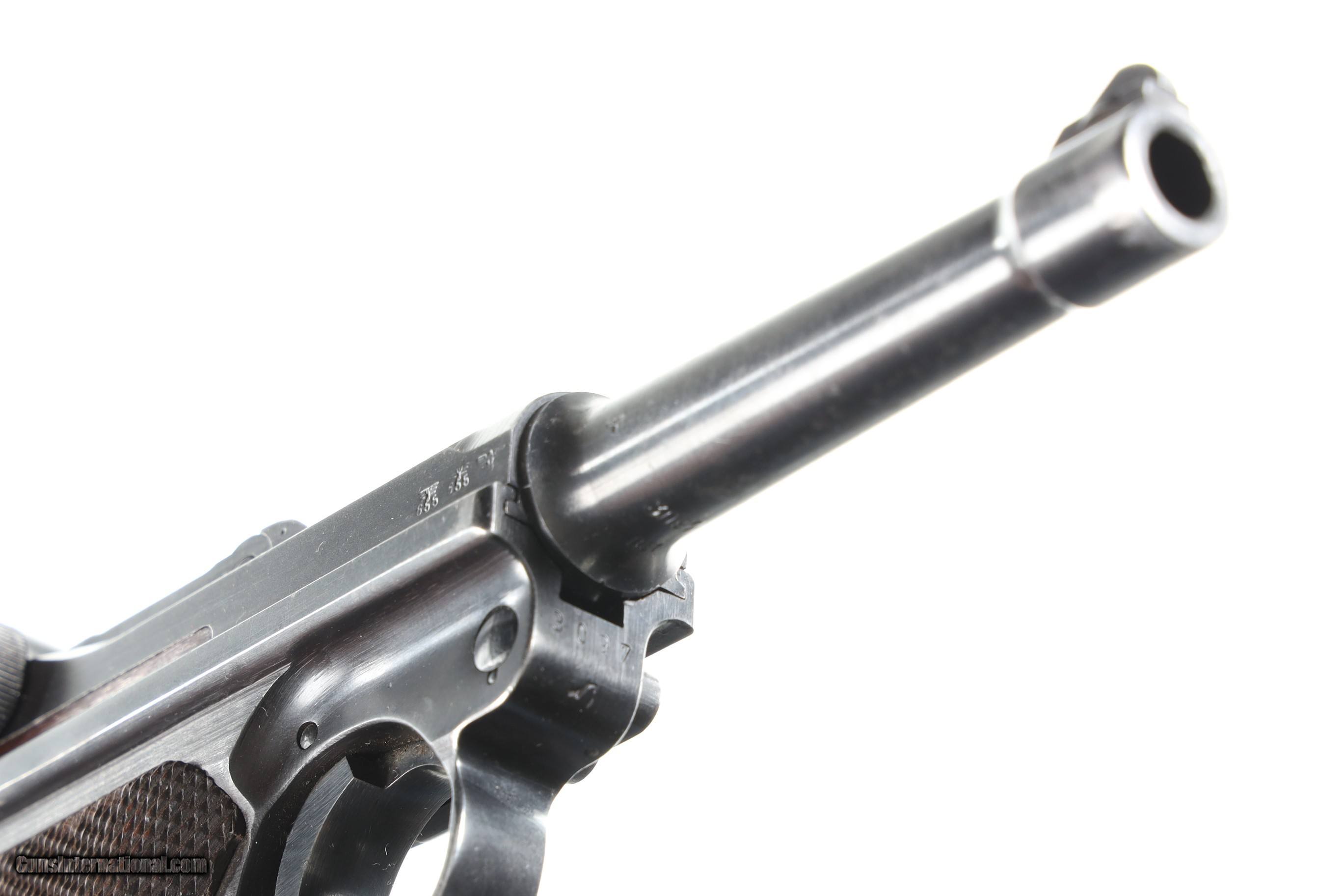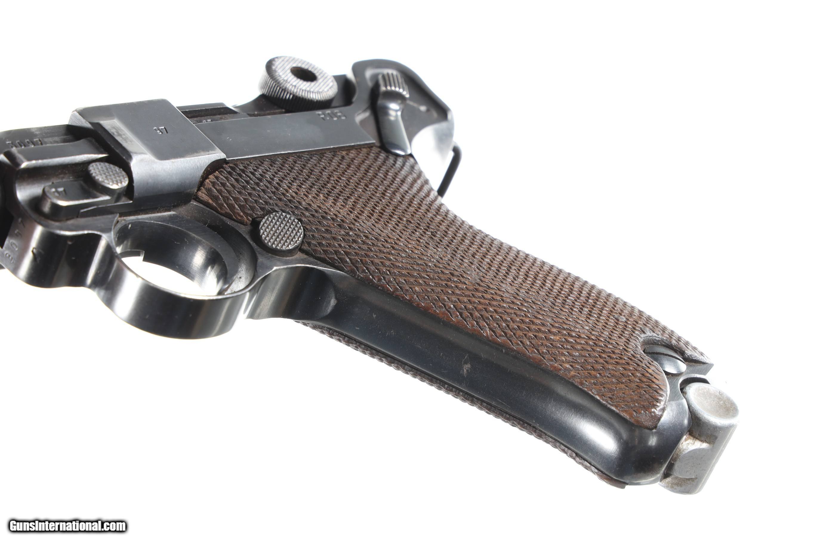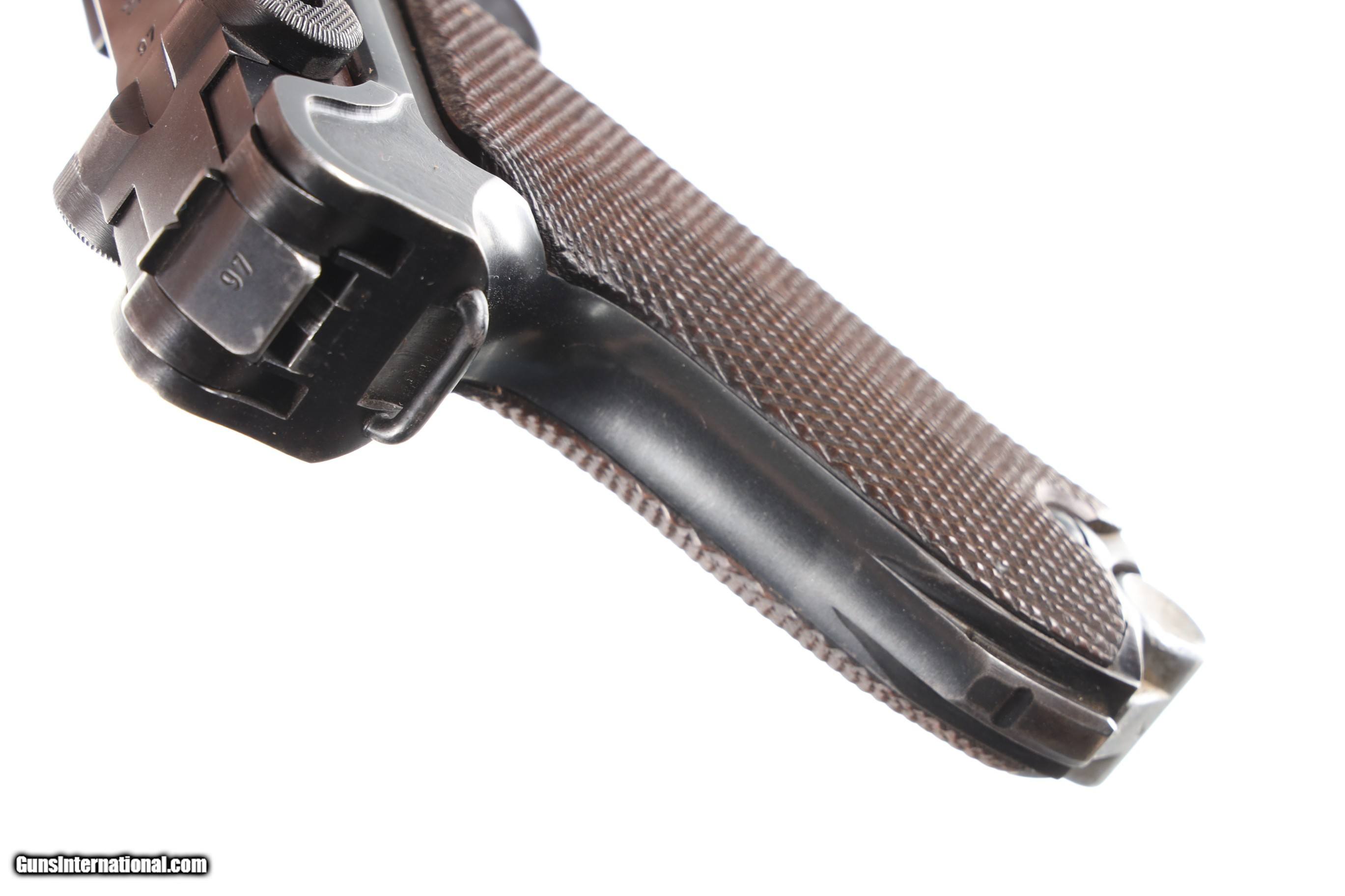Description: Mfg, by Mauser using the German byf Code and chamber dated 41. 9mm with Eagle 655 inspections. All numbers matching with exception of alloy based magazine numbered to another gun. Blue finish with 2 piece matching numbered walnut grips. Comes in gxy Code 41 dated P-38 clamshell holster with white stitching. Condition, Very fine with pistol having bright sharp bore and matching numbers. Over 85% blue finish with losses on Bbl from exposure to elements. All markings remain crisp and legible. Holster is very good with solid stitching and light scuffing for period use. Markings crisp. Mechanically excellent. • Free Shipping, No Credit Card Fees. • Lay-a-way available for this firearm. • 1/3 Down, a 1/3 in 30 Days, 1/3 in 60 Days. SOLD Curio/Relic: Yes Manufacturer: German Model: Luger Serial Number: 3097 Barrel Length: 4 |