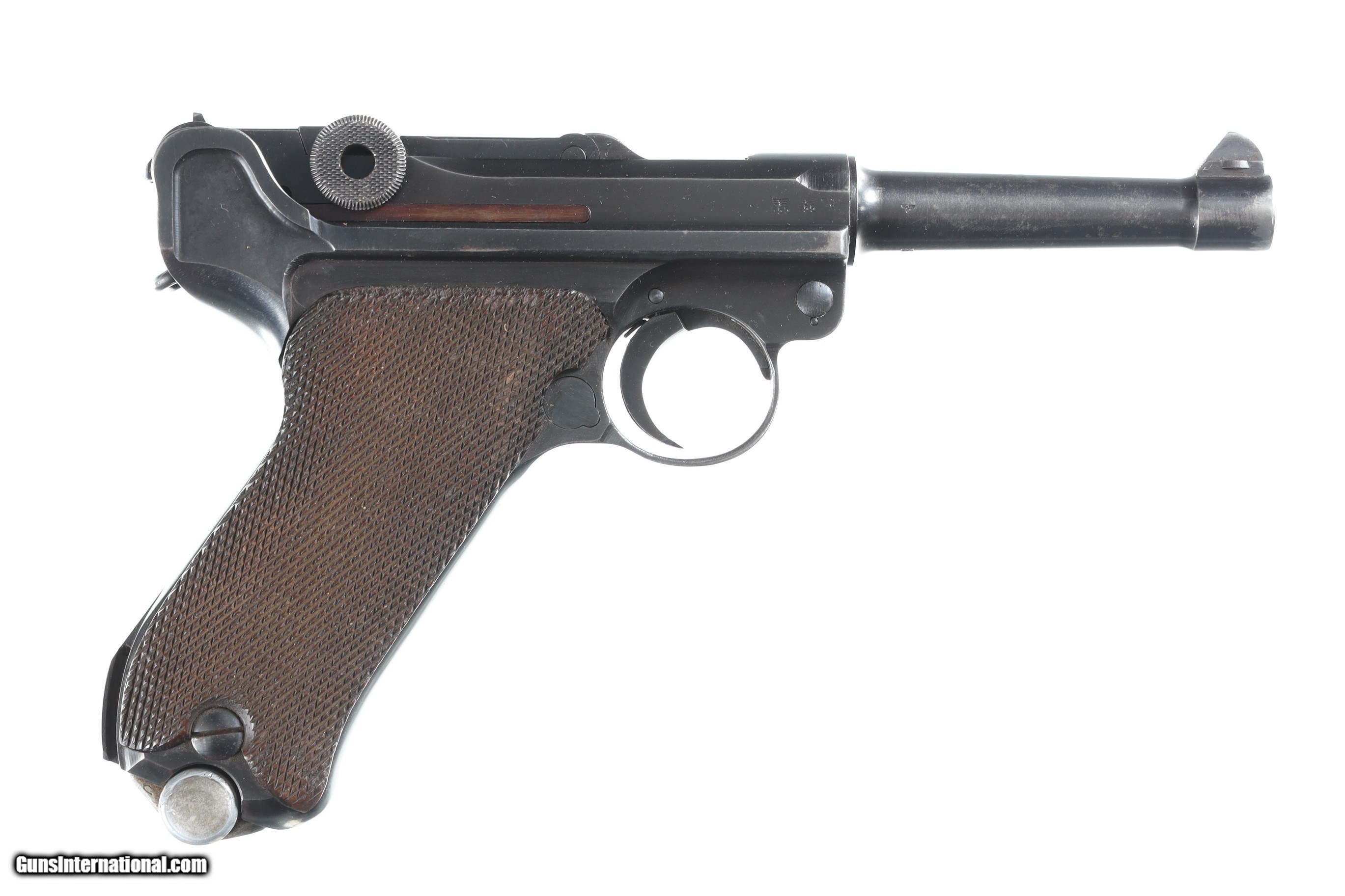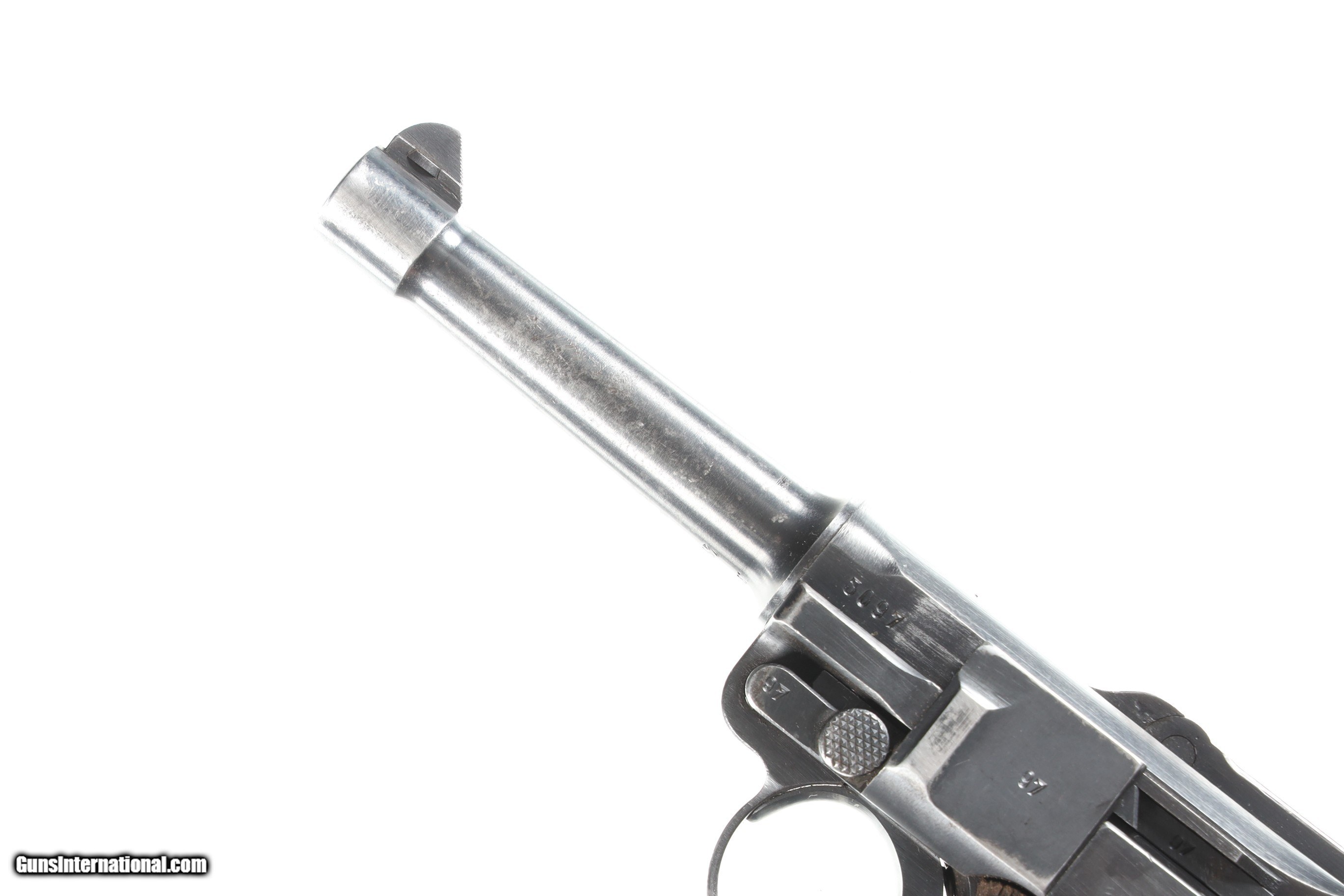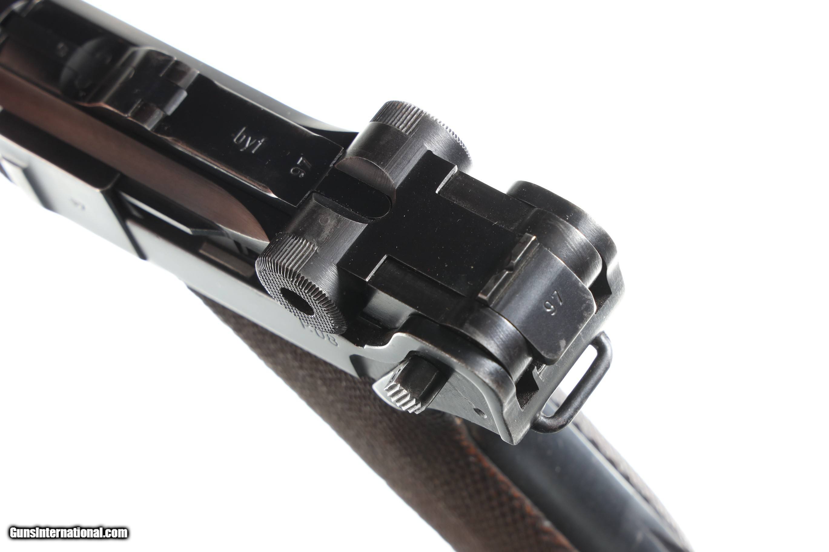 Description: Mfg, by Mauser using the German byf Code and chamber dated 41. 9mm with Eagle 655 inspections. All numbers matching with exception of alloy based magazine numbered to another gun. Blue finish with 2 piece matching numbered walnut grips. Comes in gxy Code 41 dated P-38 clamshell holster with white stitching. Condition, Very fine with pistol having bright sharp bore and matching numbers. Over 85% blue finish with losses on Bbl from exposure to elements. All markings remain crisp and legible. Holster is very good with solid stitching and light scuffing for period use. Markings crisp. Mechanically excellent. • Free Shipping, No Credit Card Fees. • Lay-a-way available for this firearm. • 1/3 Down, a 1/3 in 30 Days, 1/3 in 60 Days. SOLD Curio/Relic: Yes Manufacturer: German Model: Luger Serial Number: 3097 Barrel Length: 4 |