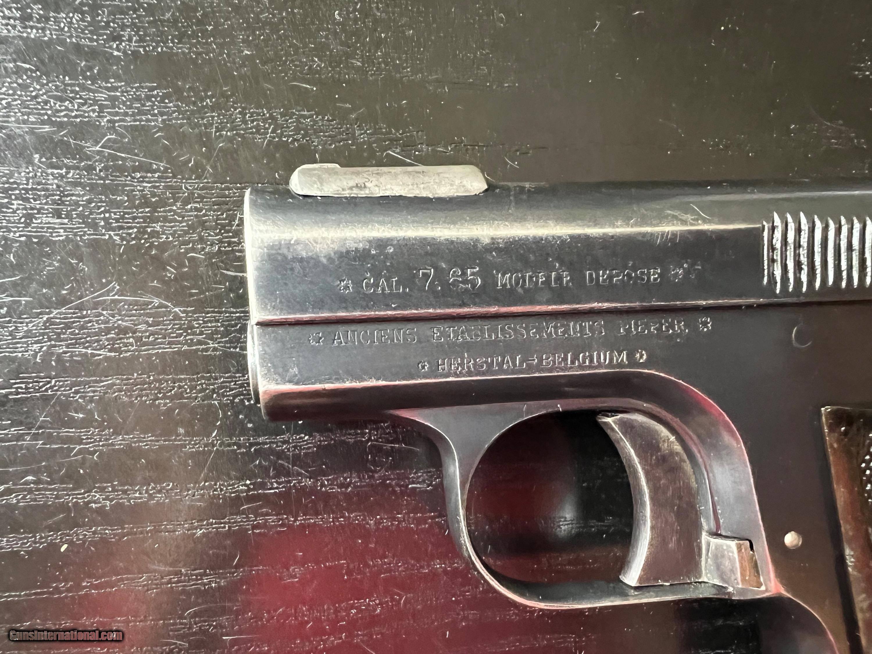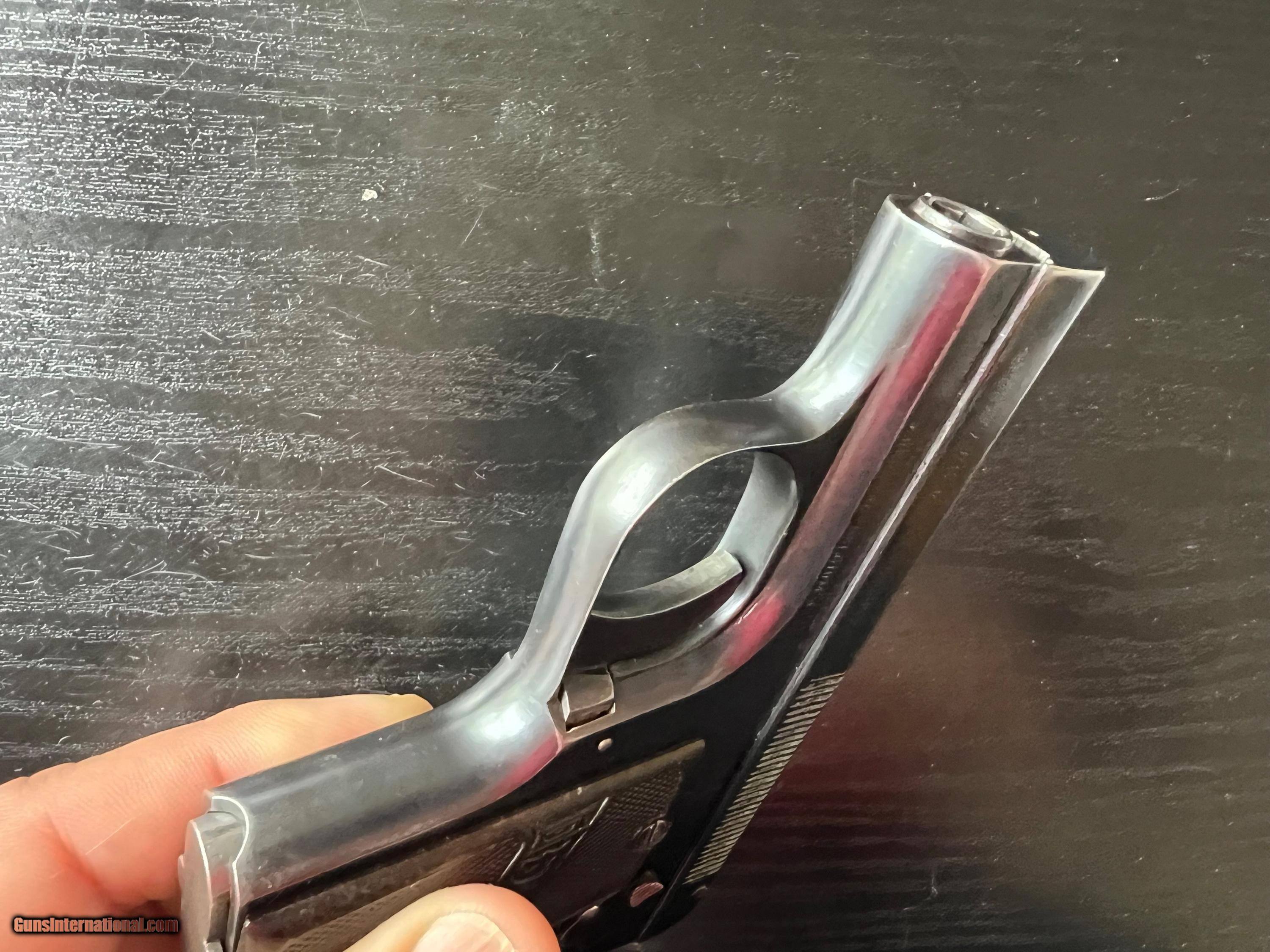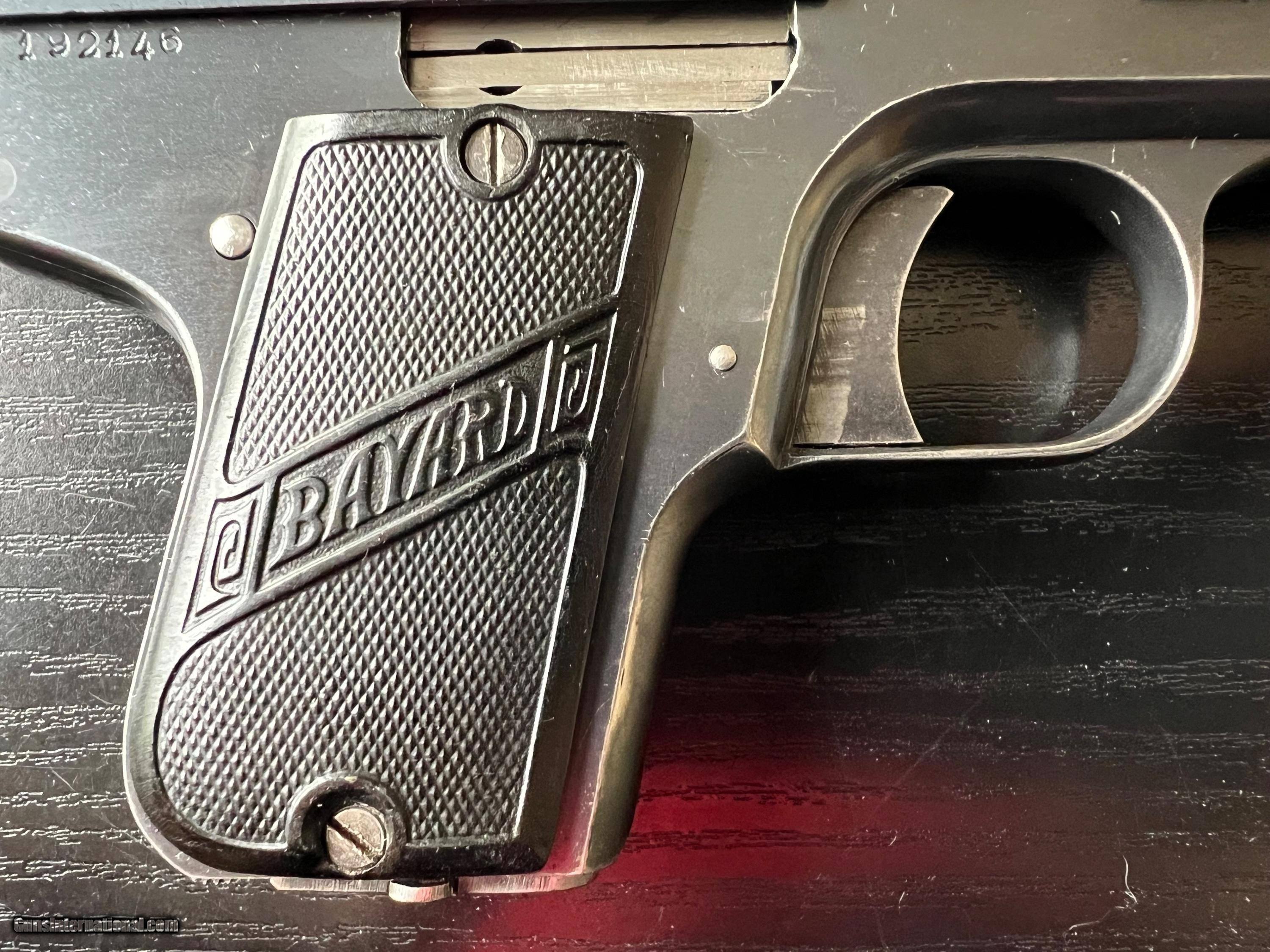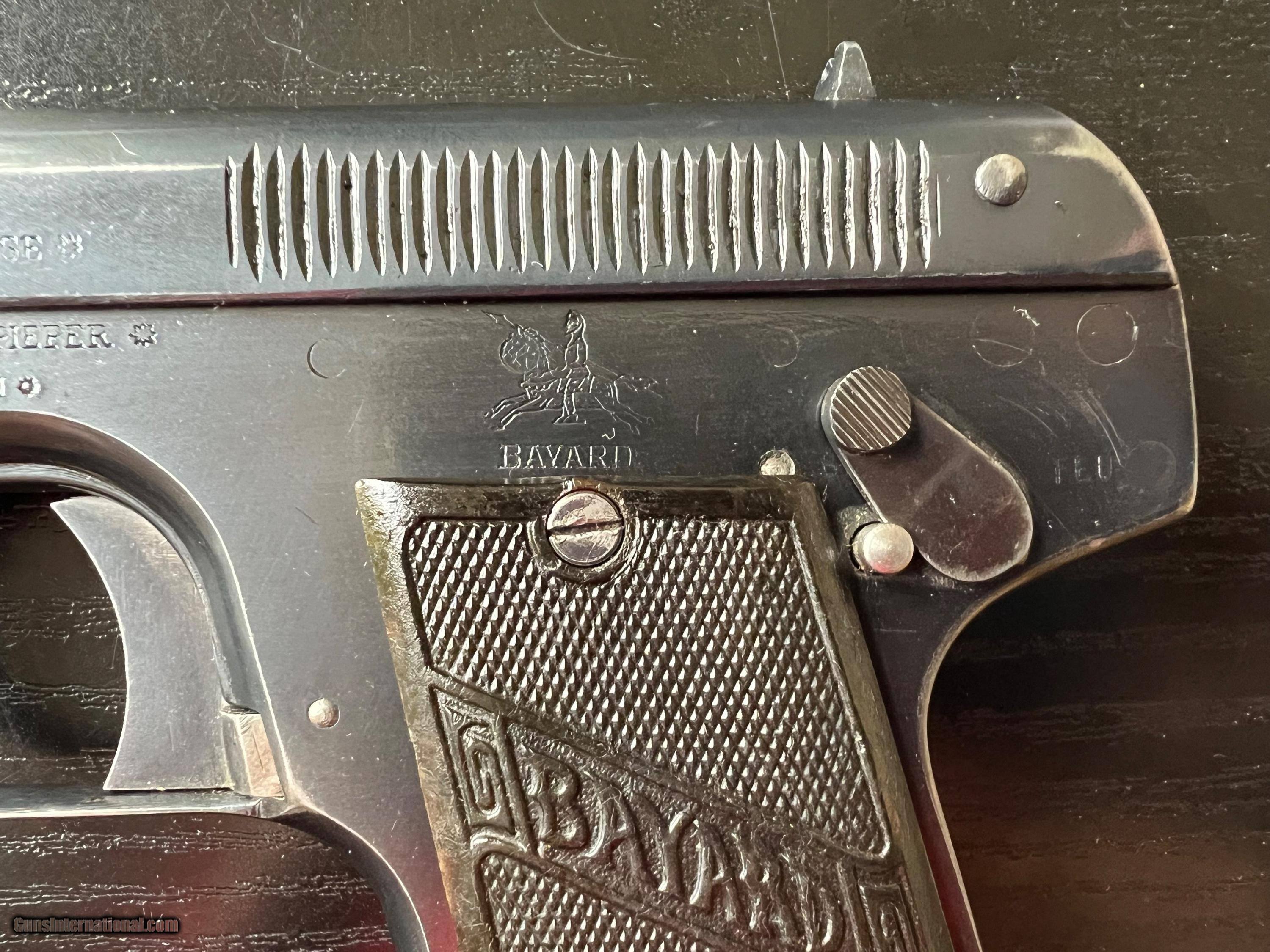 Description: This is an excellent example of an Imperial German Army Bayard pistol, chambered in .32ACP and made during WWI. It is in excellent condition, retaining around 97% of its original blue with just a touch of high edge wear from being holstered. Near perfect blueing on grip straps. Excellent bore and grips. Prominent Bayard "horseman" logo on the left side. Sharp German imperial proofs on the right side of the slide and frame. A difficult to find WWI military gun in such wonderful condition. 3-day inspection. FFL or C&R(where allowed) $25 shipping in CONUS. SOLD Curio/Relic: Yes Handgun Caliber: .32 ACP (7.65x17mm Browning SR) |