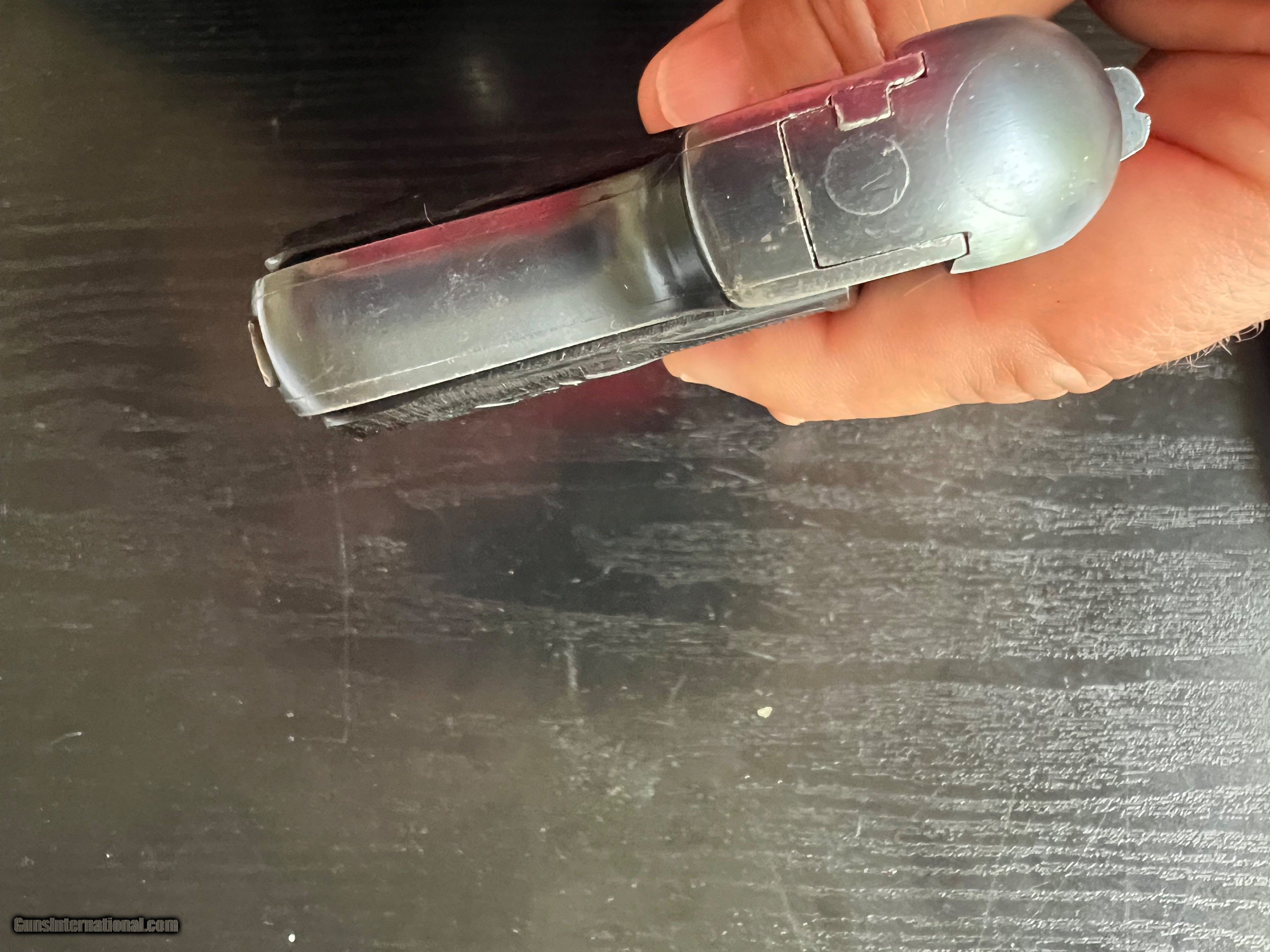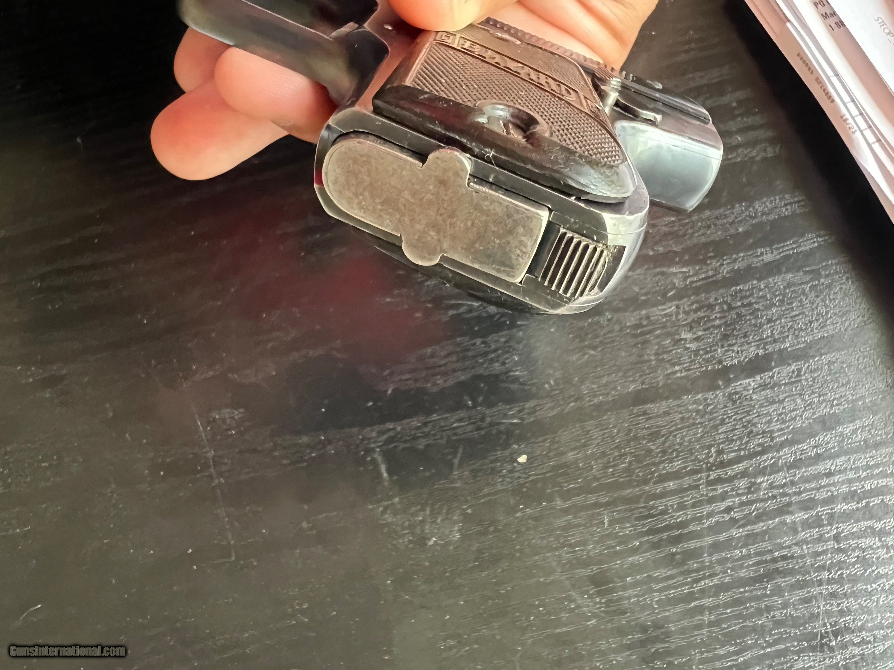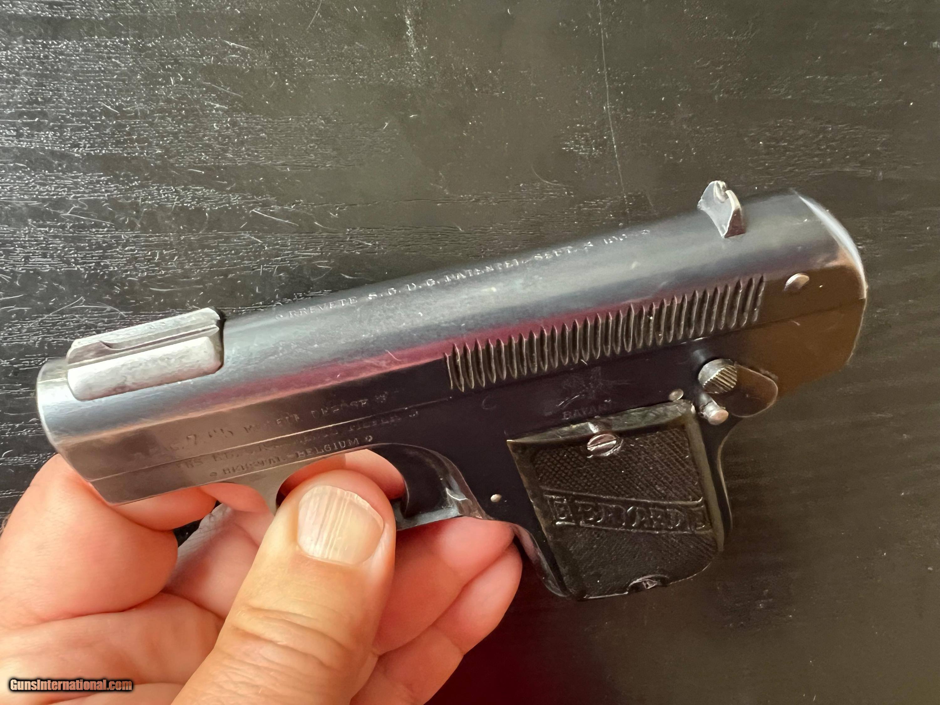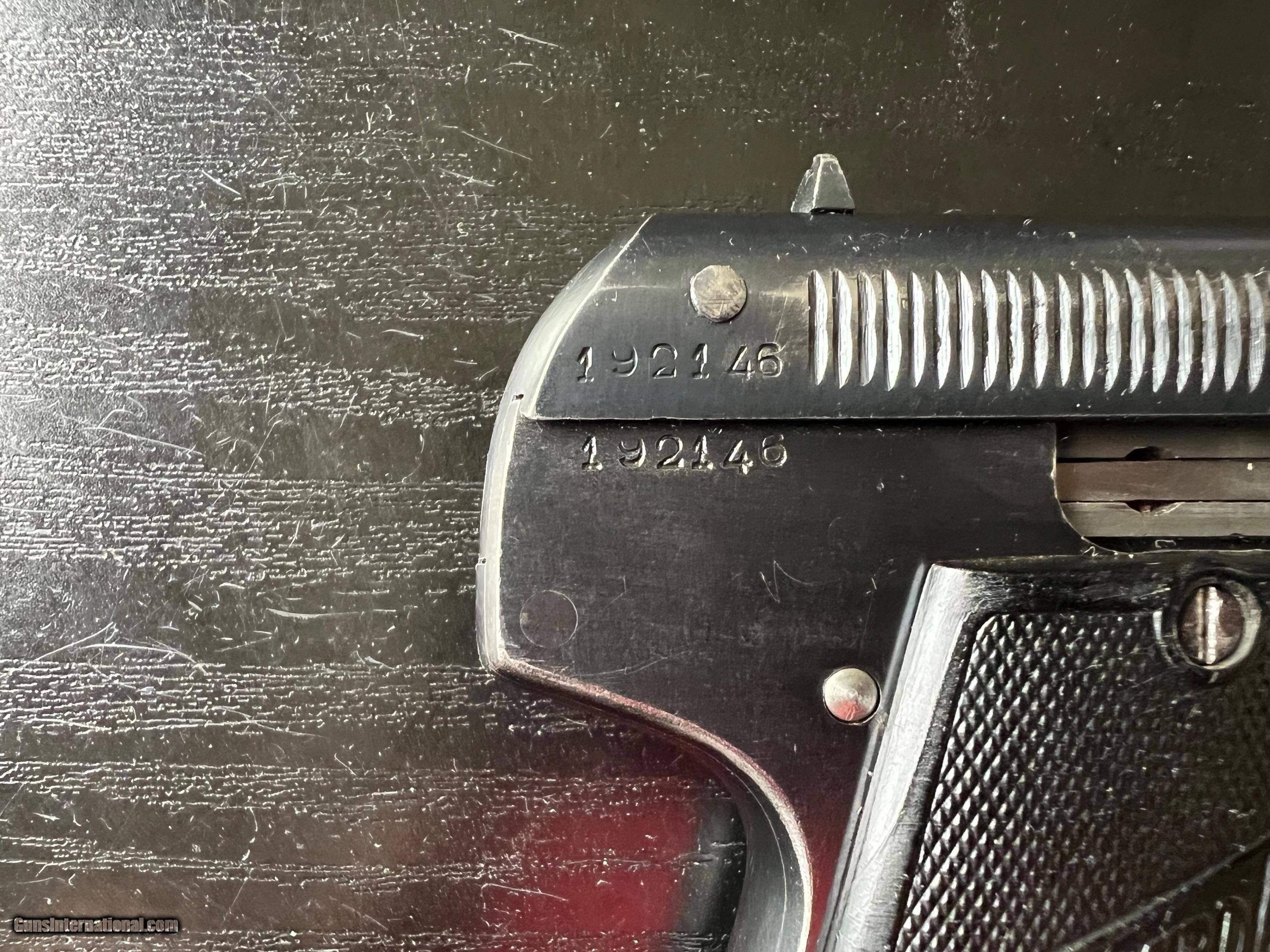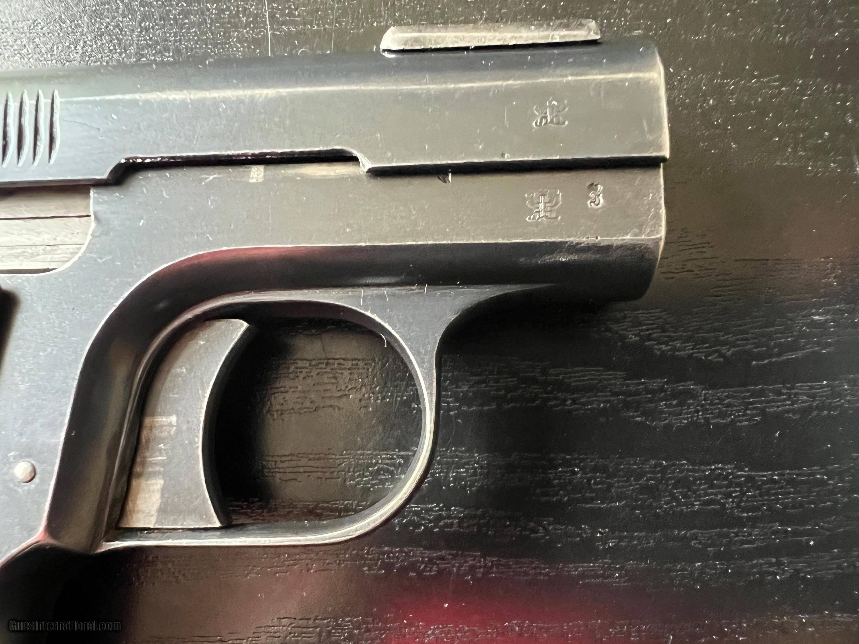 Description: This is an excellent example of an Imperial German Army Bayard pistol, chambered in .32ACP and made during WWI. It is in excellent condition, retaining around 97% of its original blue with just a touch of high edge wear from being holstered. Near perfect blueing on grip straps. Excellent bore and grips. Prominent Bayard "horseman" logo on the left side. Sharp German imperial proofs on the right side of the slide and frame. A difficult to find WWI military gun in such wonderful condition. 3-day inspection. FFL or C&R(where allowed) $25 shipping in CONUS. SOLD Curio/Relic: Yes Handgun Caliber: .32 ACP (7.65x17mm Browning SR) |