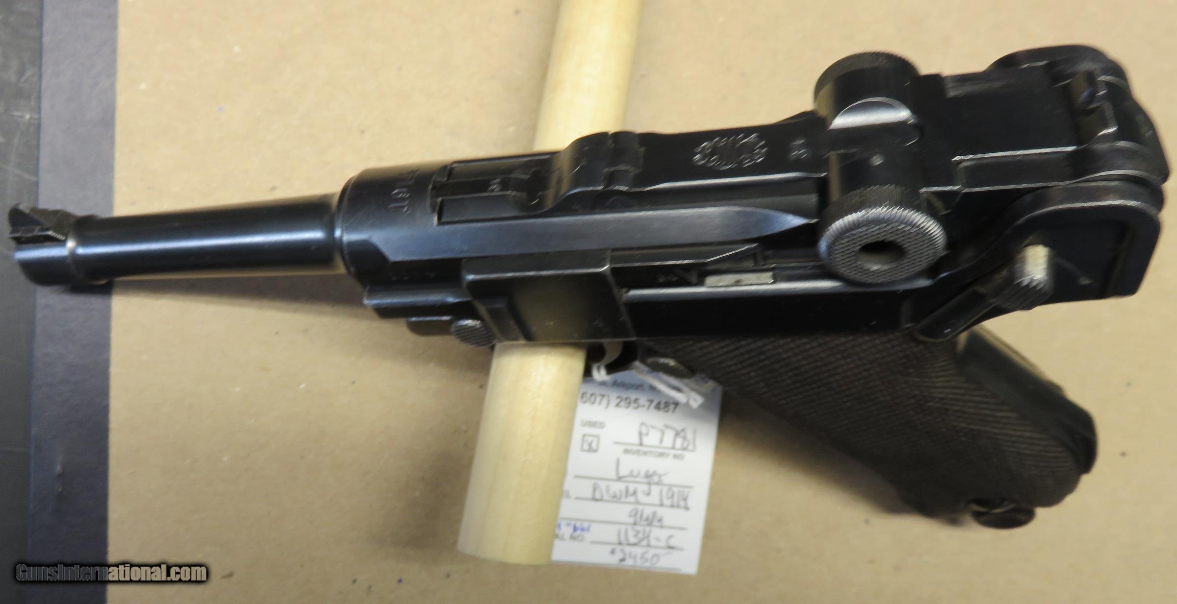 Description: Luger DWM 1914, 9mm, serial #11XX-c, 4 military proofs on the right front side of the receiver, all matching numbers except for the magazine, 4" barrel, stock lug, 95% blue, 60% straw finish, excellent bore. SOLD |