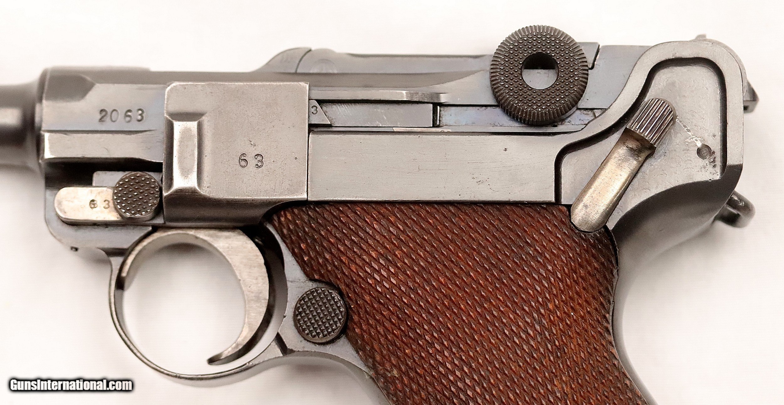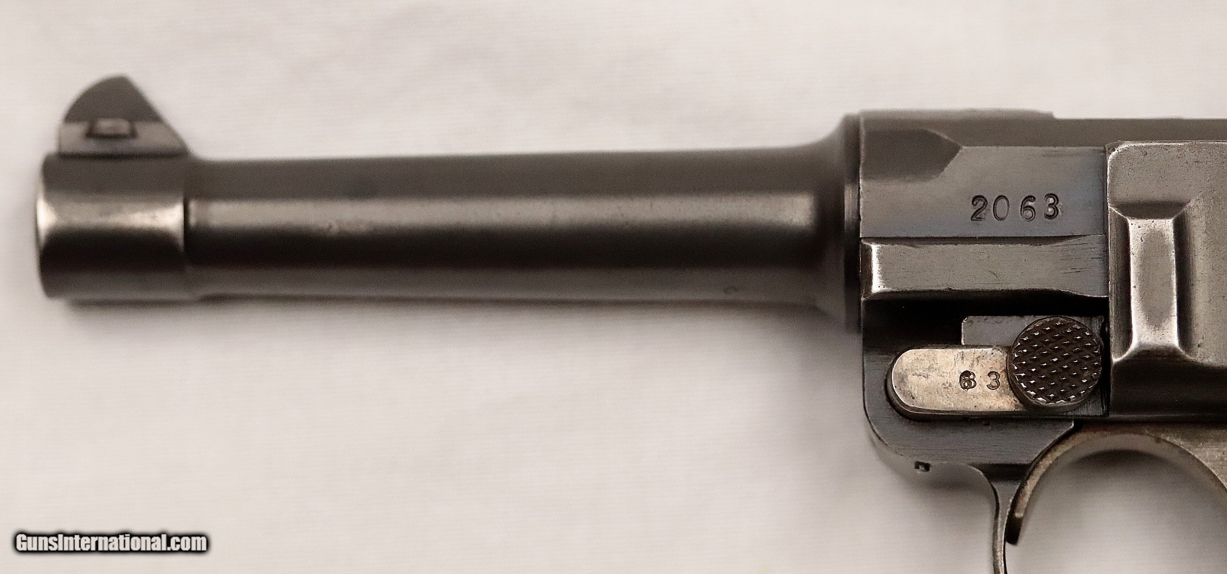 Description: This RARE 1921 dated Luger (Pistole Model 08) survives in remarkable condition. The original finish remains largely intact with minor holster wear showing on the high edges. The straw-colored small parts retain excellent color. The grips appear period original but are not numbered. The mag. is a wood bottom without numbers or markings. All other parts have matching serial numbers. Notice the proof marks on the right side of the frame: “E/ArA4, Dove/WaA4, E/ArA4”, correct Weimer period markings. A unit assignment mark was applied to the front grip strap. It is “1 / J. R. 6. 37”. The back of the frame above the lanyard ring is marked “1.37”. This is NOT an imported Russian capture gun, no rust and no pitts. Its’ excellent condition suggests it saw limited service in the Weimer period and perhaps in WWII as well. Most likely a G.I. bring back. The bore is excellent, and the function is flawless. This is an exceptional example of a rare Weimer period 1921 dated luger with unit I.D. Markings. This provides a great research opportunity and an addition to the finest collection. 9mm with a 4” barrel. Serial Number 2063a FFL or C&R Required. Beaver Creek Arms TERMS & CONDITIONS Objective: As a collector of 35 years and Licensed Firearms Dealer since 1989 I have a clear definition of a satisfactory transaction. I will be paid as we agreed to, and you will be satisfied with your purchase. My goal is to establish a client list of satisfied repeat customers who will recommend me to other collectors. It’s just that simple. Exiled Saudi princes with secret funds needing change from an over paid purchase need not apply. Notice: ALL Federal, State, & Local firearms laws will be followed. I will take NO shortcuts in the process of a legal sale or transfer, so please don’t ask. SHIPPING: Normally shipments are made via U.S.P.S. Priority Mail, Insured, with a return receipt. Packing, Shipping and Insurance cost for this handgun is $40.00, Checks are to be made out to : STEVE CLARK Address: 380 Beaver Creek Rd. Dillsburg PA 17019 Availability: All items are in stock and available for immediate shipment. Please call or email and an Item will be held up to a week with your Name, Address, & Phone Number. Items marked Reserved are being held for awaiting payment or on layaway. If you are interested in a reserved item, please call or E-Mail to be placed on a backup list. FIREARMS: Modern firearms, post 1898, can only be shipped to a Type 01 Federal Firearms License address. Curio-Relic firearms, as defined by the BATF list, can usually be shipped to a Type 03 Collectors License address. Some states have additional restrictions such as CA, CT, DC, IL, MD, NJ and NY. A signed valid FFL license copy either mailed or emailed will be required for shipment to only the license address. Antique firearms, pre 1898 do not require a Federal License. For purchase, a copy of a Government Issued Identification (Driver’s License, Etc.), showing date of birth and current address will be required. GUARANTEE: Your complete satisfaction is assured, see objective above. If you are not satisfied, please contact me within 3 days of receipt. Please don’t fire the weapon, safety, function and accuracy are NOT Guaranteed. Any weapon offered by Beaver Creek Arms is never test fired nor is there any representation the gun is functional and safe to fire. These guns are sold for collectors and only represented as used firearms that must be checked by a competent person, observe all the necessary safety precautions prior to attempting to load and fire one of these weapons RETURNS: Returns must be made within 3 days of receipt. They must be received in exactly the same condition with no parts exchanged. If it has been altered, damaged, or fired, a refund will not be made. Packing, shipping and insurance cost will not be refunded. All layaway purchases are returnable for merchandise credit only. PAYMENT: Bank check, Personal check, and Money Orders are preferred. Visa and MasterCard are accepted with a 3% processing fee. For Visa and MasterCard orders please provide the account number, code number, expiration date, name on card, phone number and card billing address. This information can be phoned in, or E-Mailed. All orders must be paid in advance, C.O.D. orders are not accepted. Checks, both Bank and Personal must clear before the order will be shipped, usually a 2 week delay. LAYAWAYS: A 20% deposit is required. Balance is due in 30 days. Deposits are non-refundable and are forfeited after 30 days. Layaway sales are returnable for merchandise credit only. SALES TAX: Pennsylvania state sales tax is 6% for in state purchases. The payment of other states sales tax, if applicable, for shipped items is the buyer’s responsibility. DISCREET: Client information will remain Confidential. Your privacy is protected. SOLD Curio/Relic: Yes |