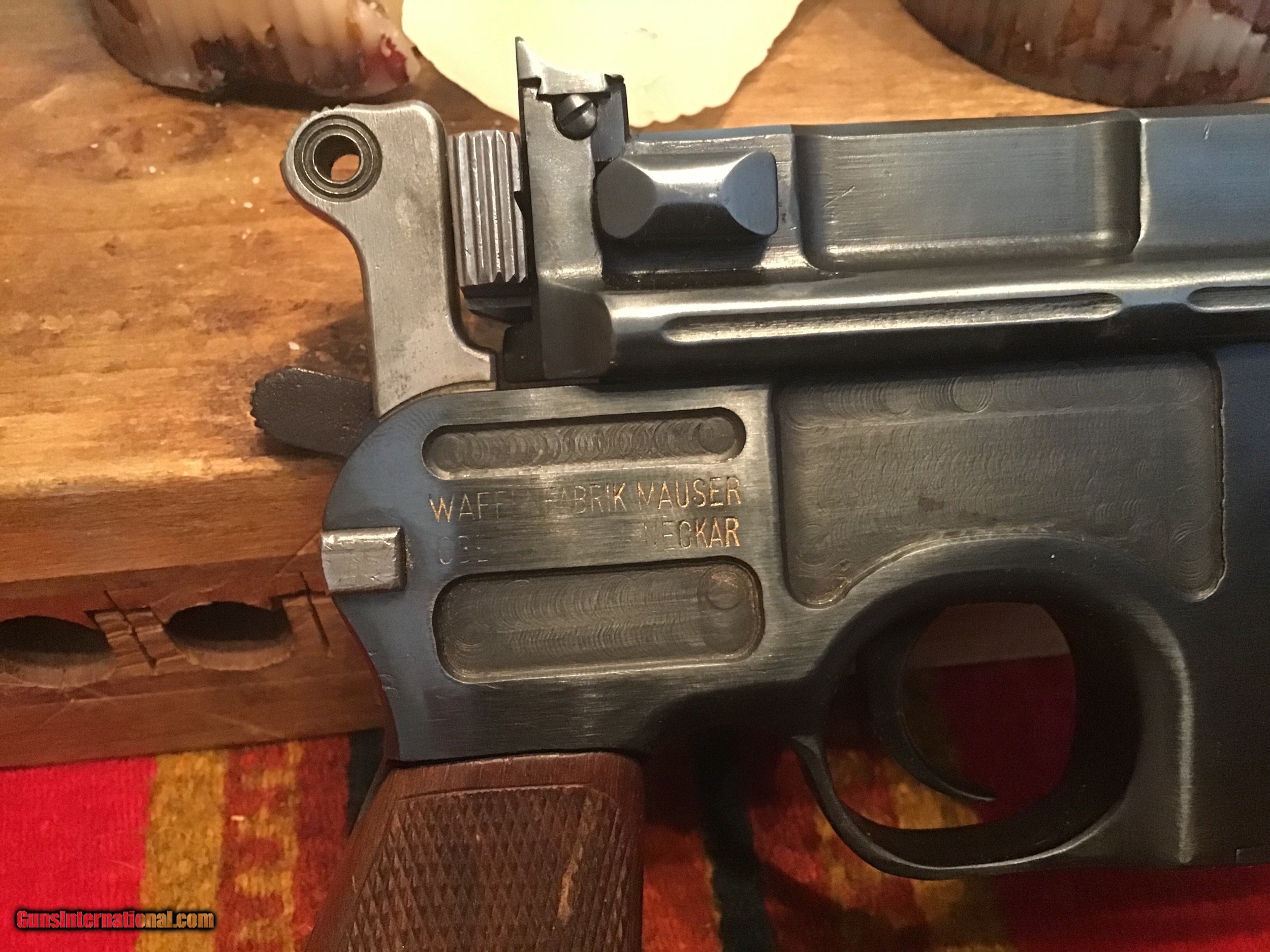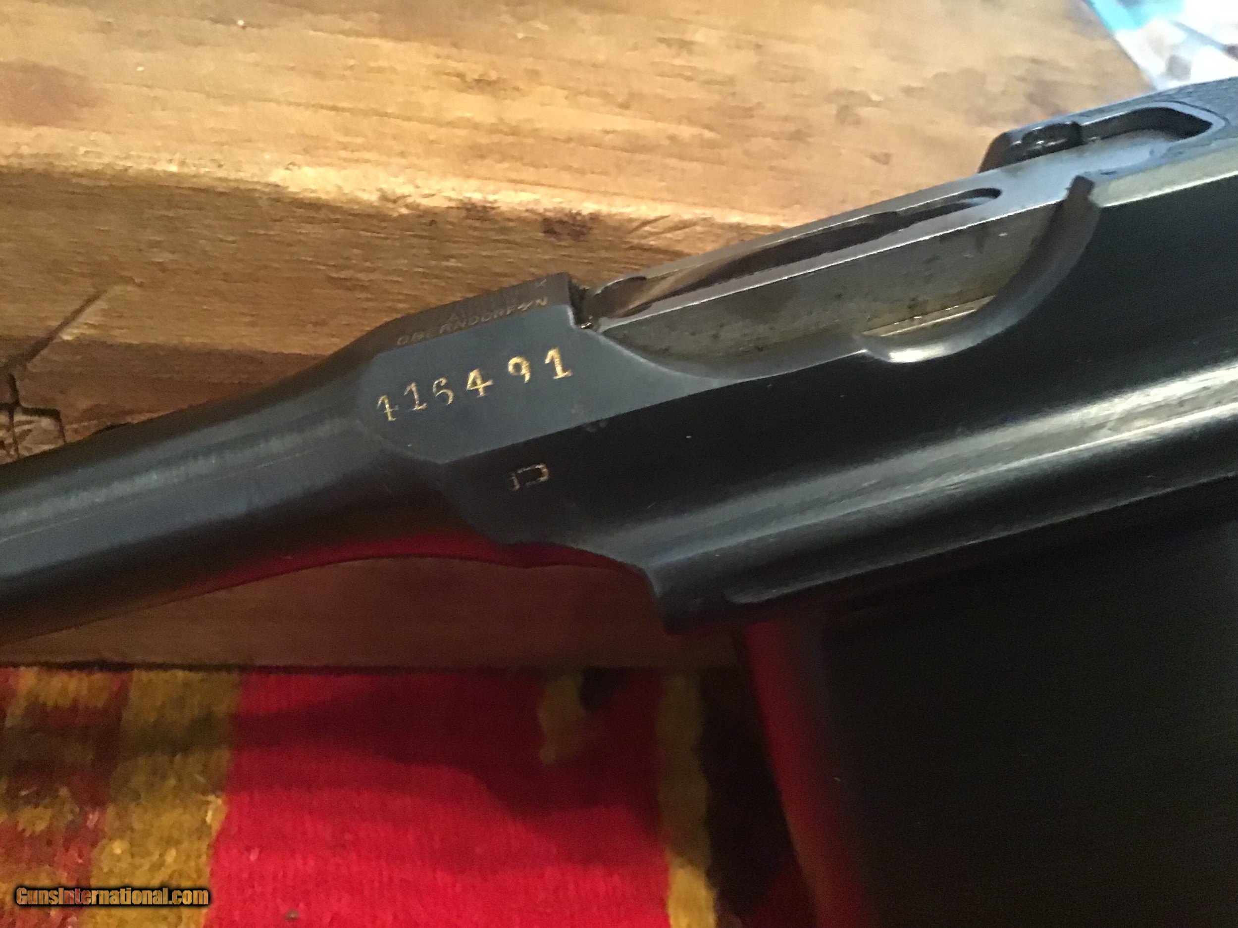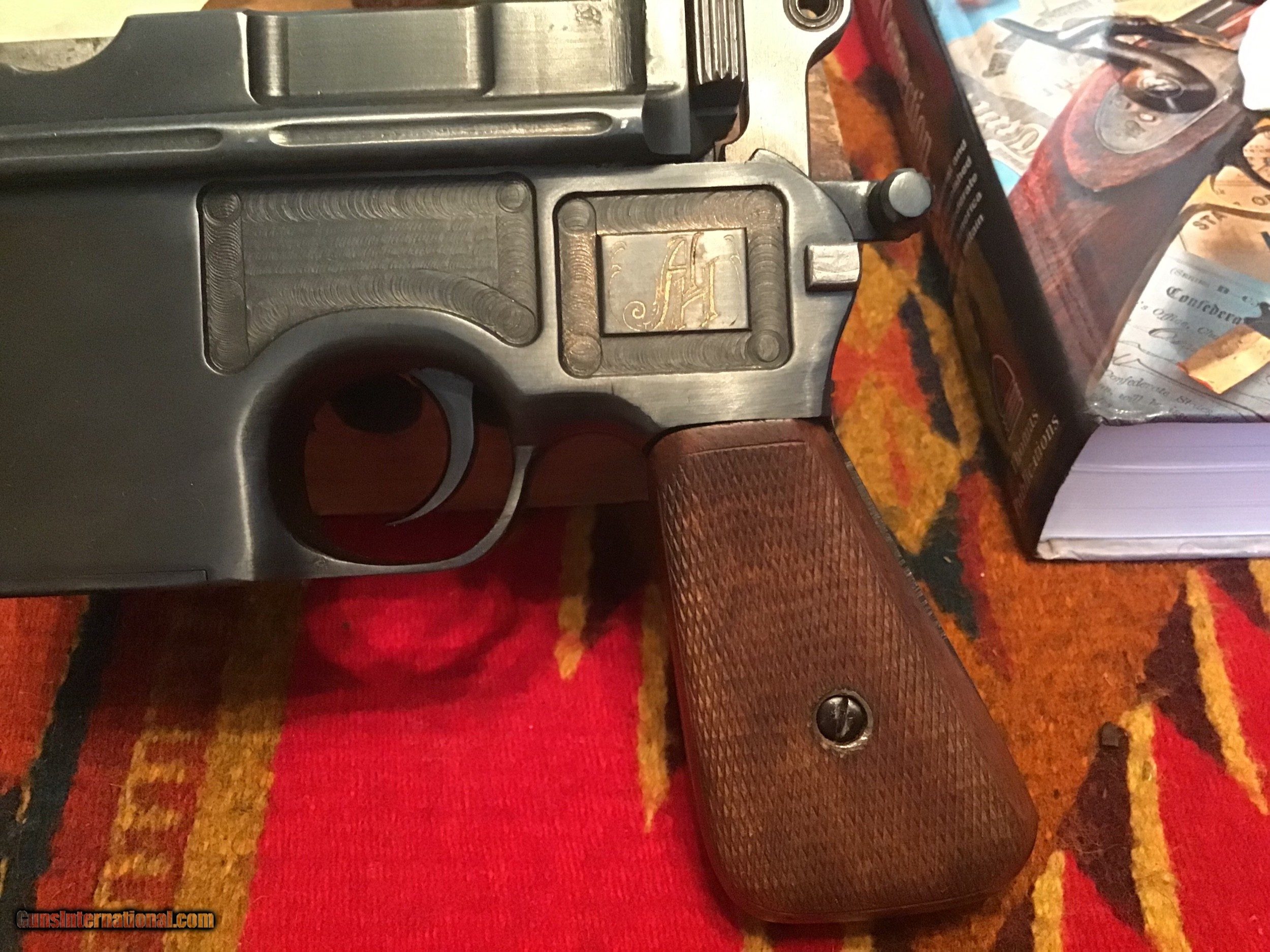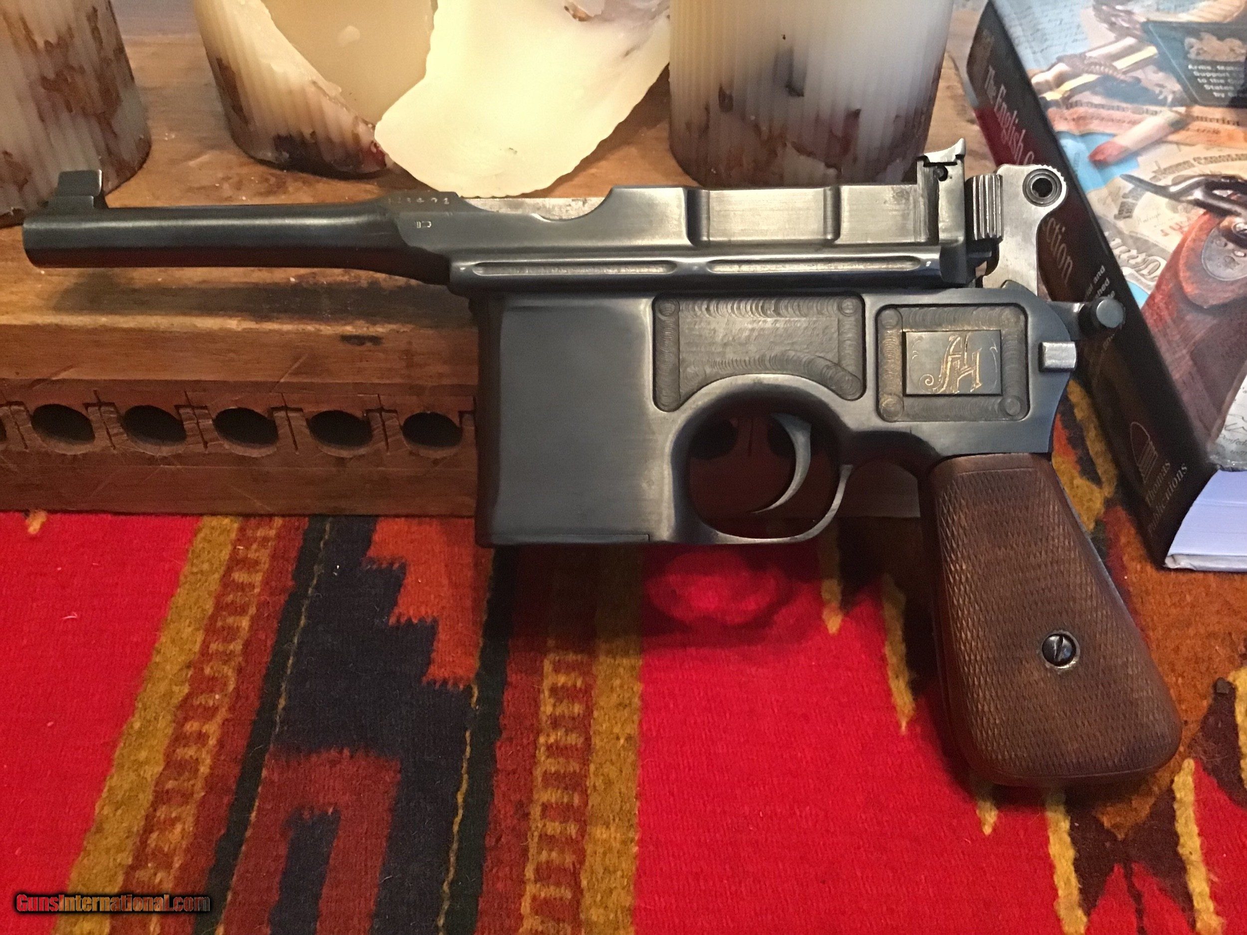 Description: HOLD! Fine condition Mauser Bolo pistol in 7.63mm modified to a presentation gun. Whenever this was done it was professionally done as the grip required a lot of work to give it the wider contour. The rear sight assembly was removed at some time and replaced with a fixed sight added along with the added engraving. Action is very smooth and the gun functions fine. Would be a great shooter. Bore is bright with strong rifling and no import marks are present. Pistol is serial #416491 with all visible matching numbers. This is WW1 War time production gun. Gun has been professionally refinished with a deep blue. Some of the original Mauser markings are light and all markings are finished in gold. Left side of the frame has a beautiful scroll engraved intertwined "AH". Great old WW1 gun that easily could have seen used in WW2 as well. Priced fairly. Ships from my FFL. Buyer pays shipping. Bought this from Larry Eisel. Selling off a good part of my collection. SOLD Curio/Relic: Yes |