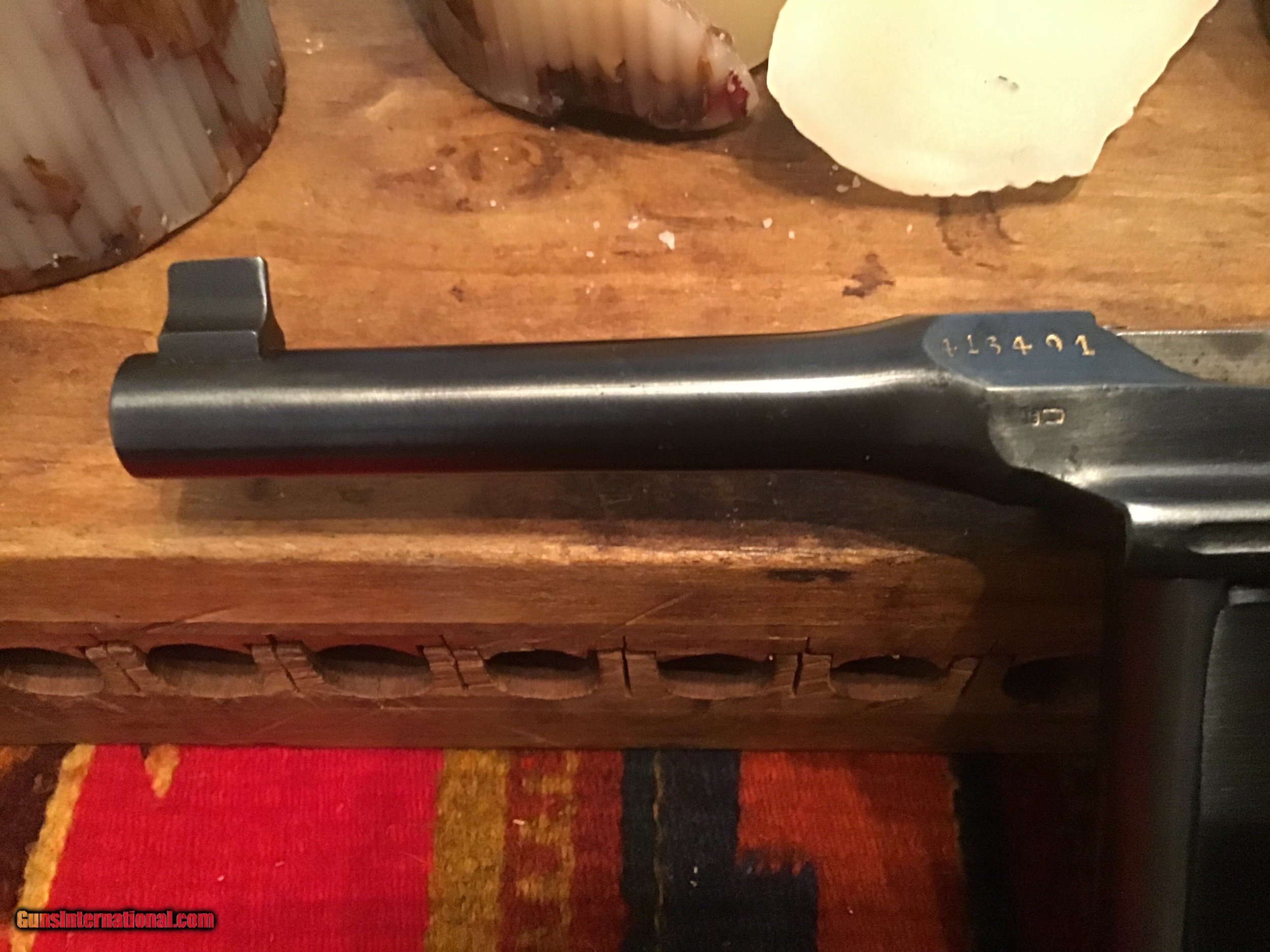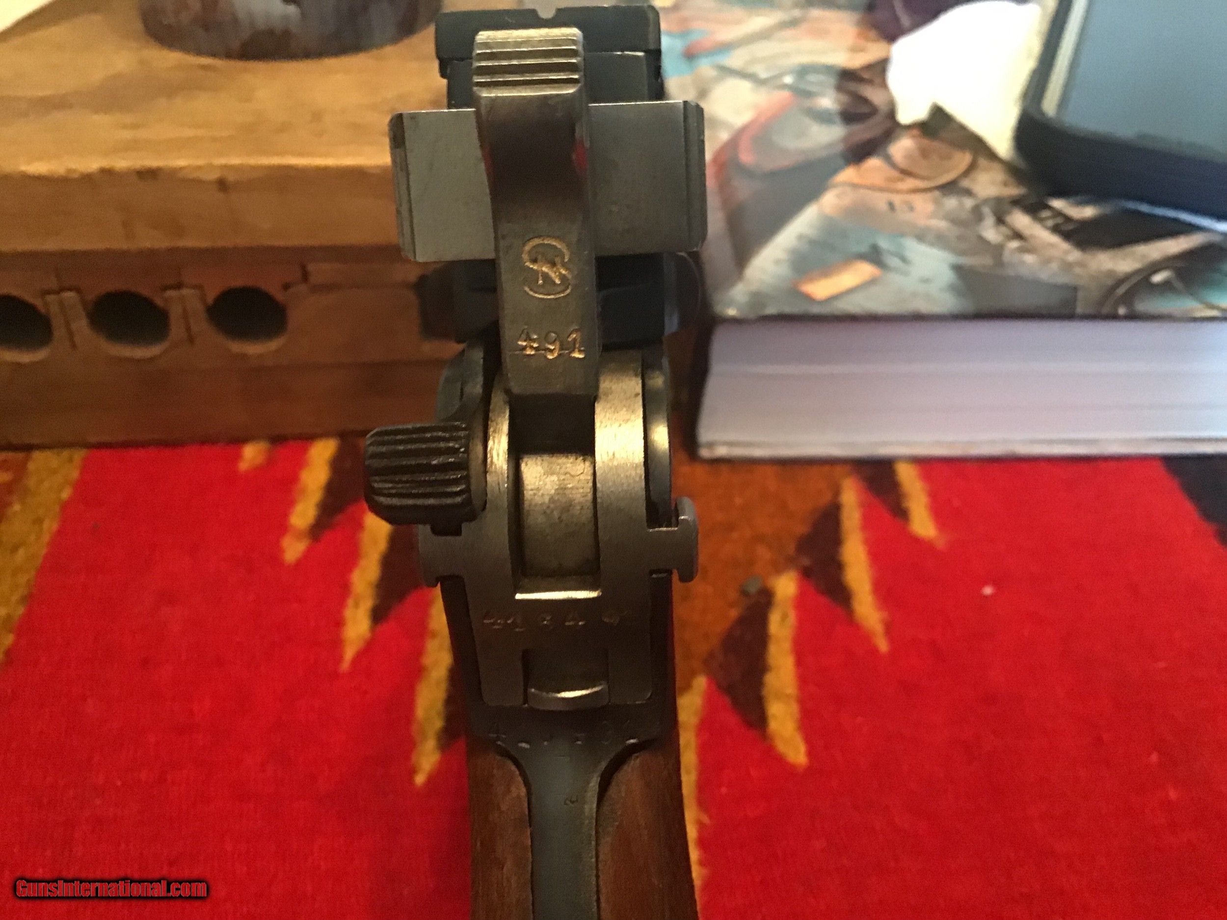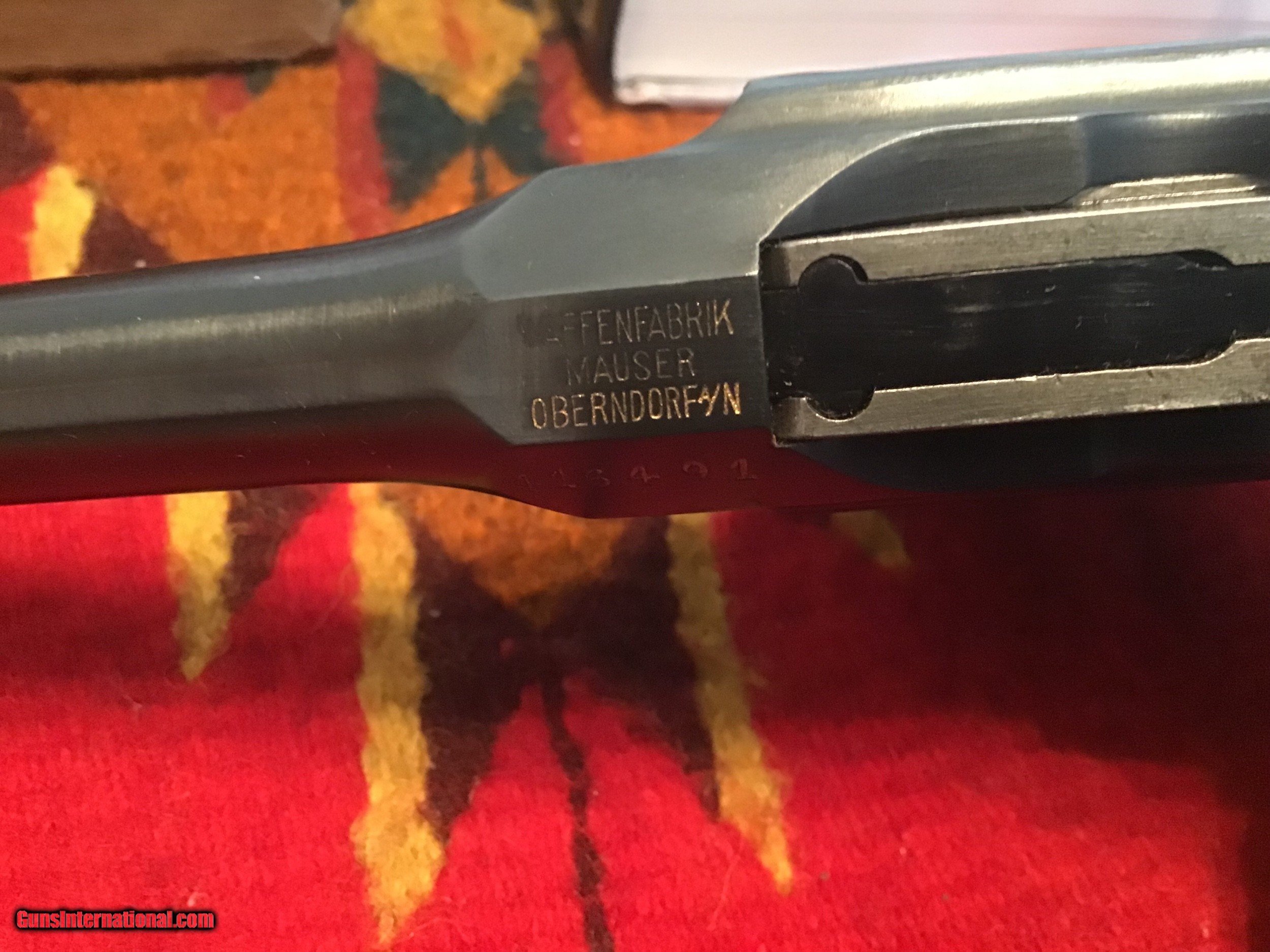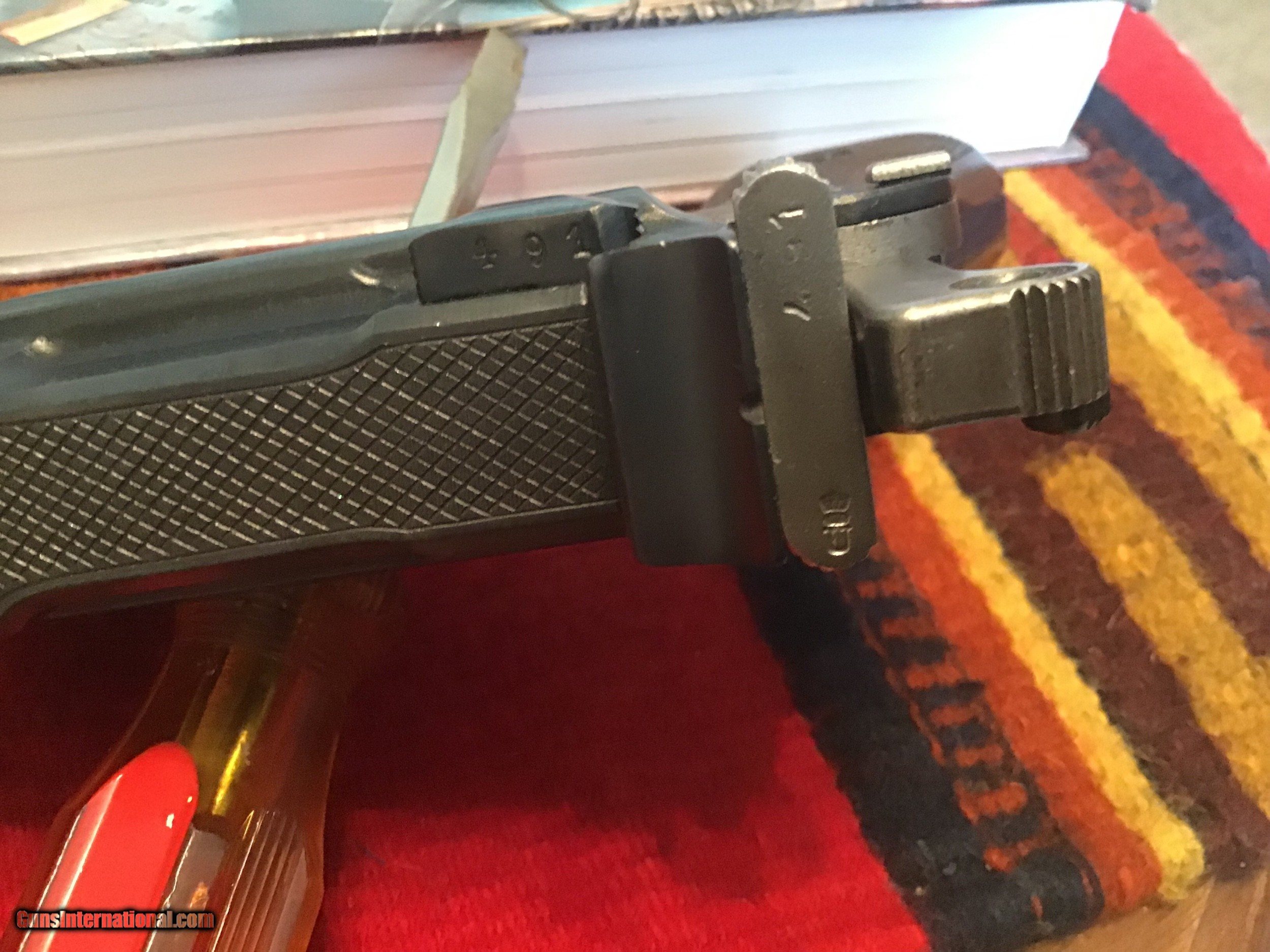 Description: HOLD! Fine condition Mauser Bolo pistol in 7.63mm modified to a presentation gun. Whenever this was done it was professionally done as the grip required a lot of work to give it the wider contour. The rear sight assembly was removed at some time and replaced with a fixed sight added along with the added engraving. Action is very smooth and the gun functions fine. Would be a great shooter. Bore is bright with strong rifling and no import marks are present. Pistol is serial #416491 with all visible matching numbers. This is WW1 War time production gun. Gun has been professionally refinished with a deep blue. Some of the original Mauser markings are light and all markings are finished in gold. Left side of the frame has a beautiful scroll engraved intertwined "AH". Great old WW1 gun that easily could have seen used in WW2 as well. Priced fairly. Ships from my FFL. Buyer pays shipping. Bought this from Larry Eisel. Selling off a good part of my collection. SOLD Curio/Relic: Yes |