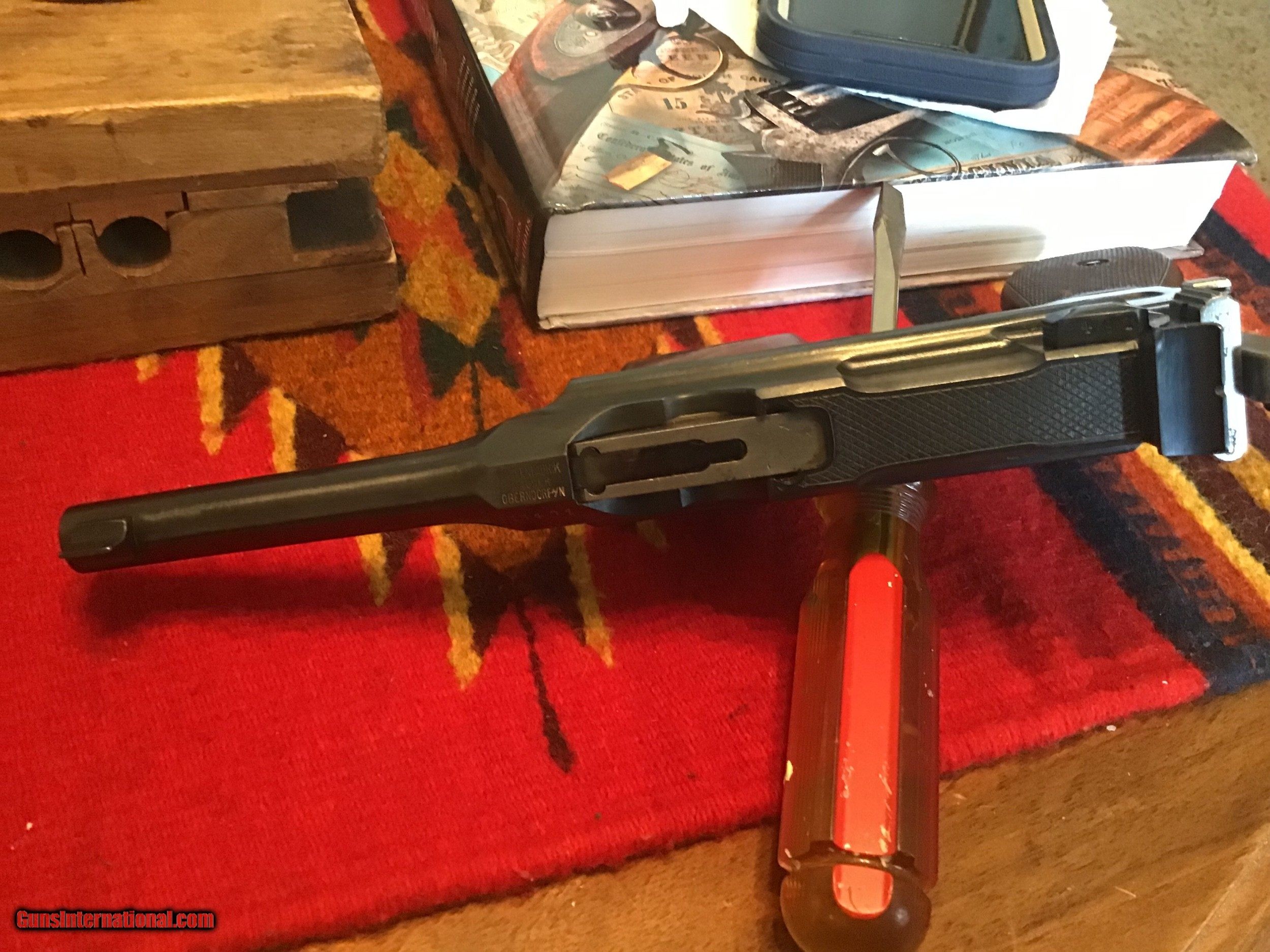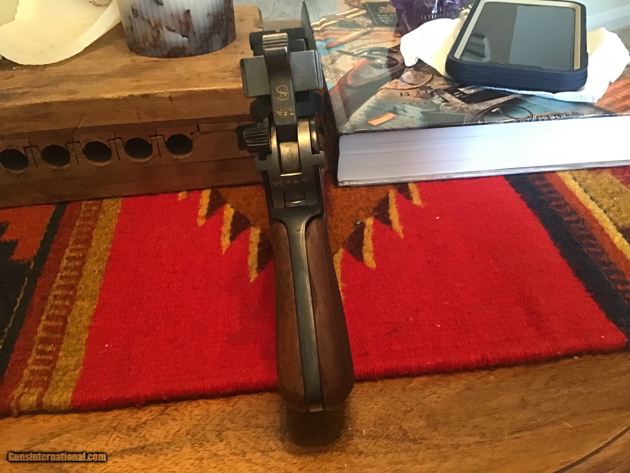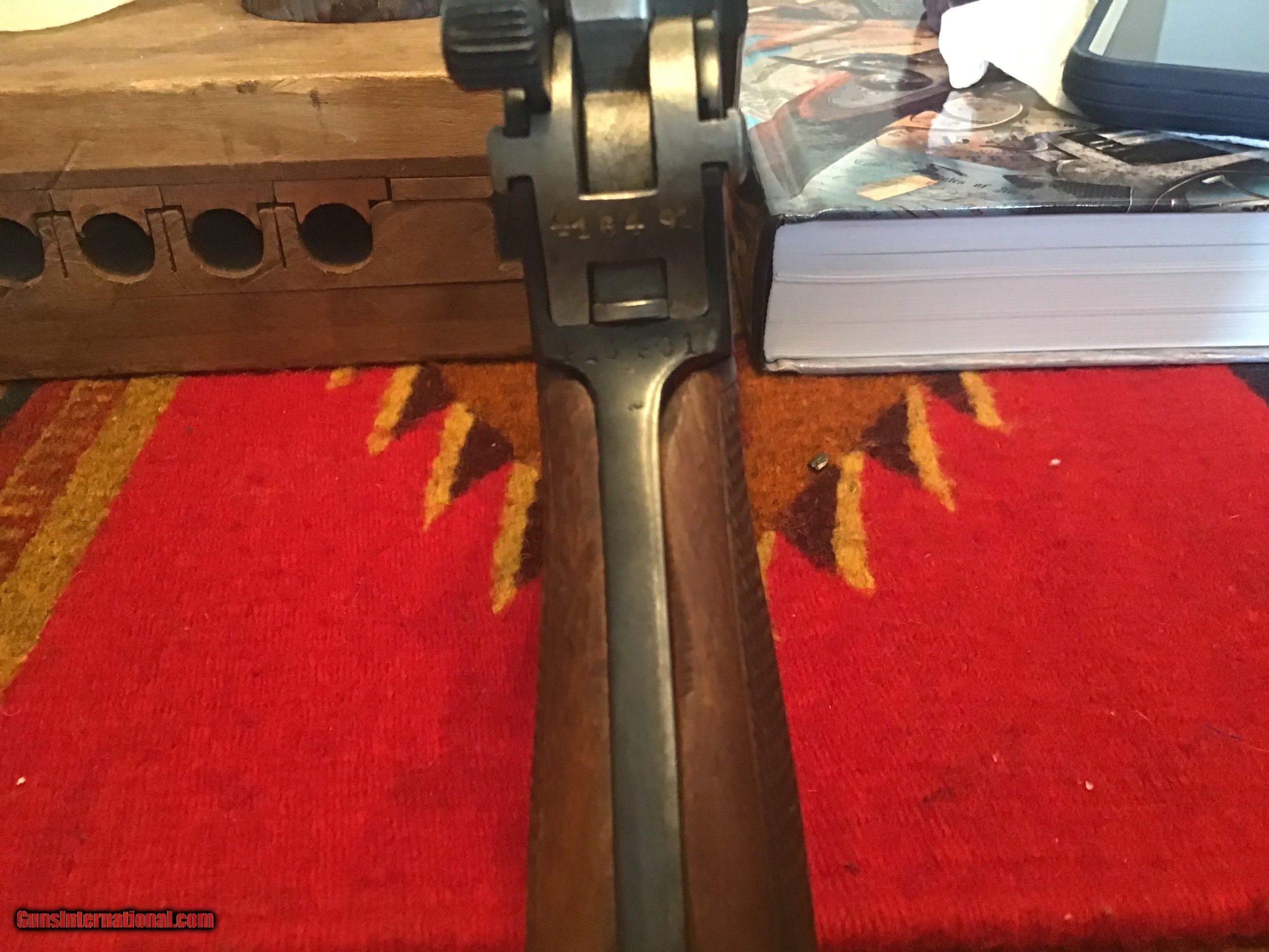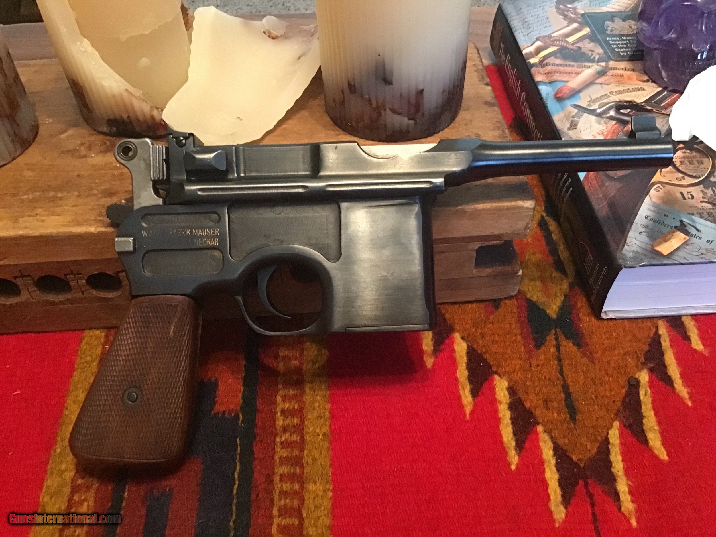 Description: HOLD! Fine condition Mauser Bolo pistol in 7.63mm modified to a presentation gun. Whenever this was done it was professionally done as the grip required a lot of work to give it the wider contour. The rear sight assembly was removed at some time and replaced with a fixed sight added along with the added engraving. Action is very smooth and the gun functions fine. Would be a great shooter. Bore is bright with strong rifling and no import marks are present. Pistol is serial #416491 with all visible matching numbers. This is WW1 War time production gun. Gun has been professionally refinished with a deep blue. Some of the original Mauser markings are light and all markings are finished in gold. Left side of the frame has a beautiful scroll engraved intertwined "AH". Great old WW1 gun that easily could have seen used in WW2 as well. Priced fairly. Ships from my FFL. Buyer pays shipping. Bought this from Larry Eisel. Selling off a good part of my collection. SOLD Curio/Relic: Yes |